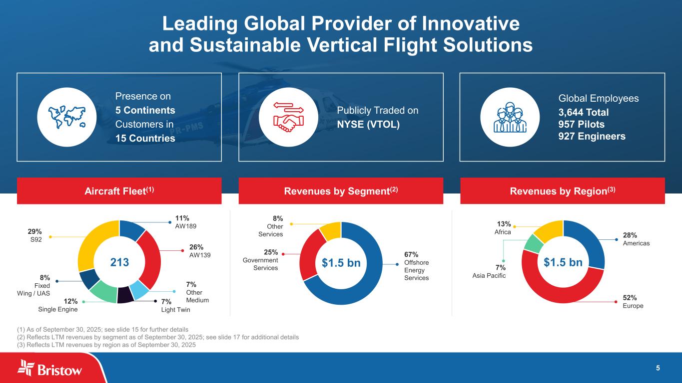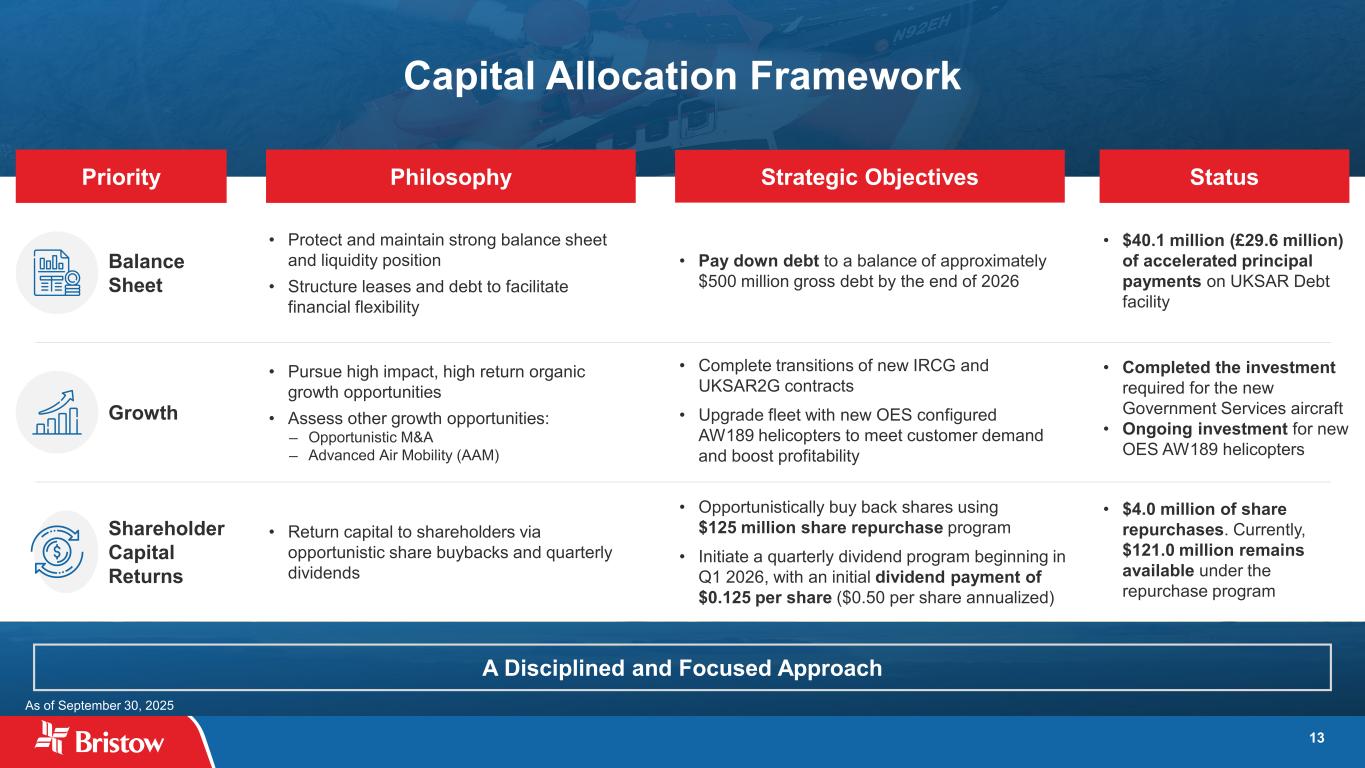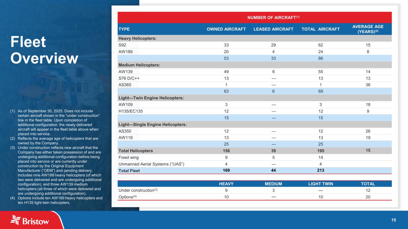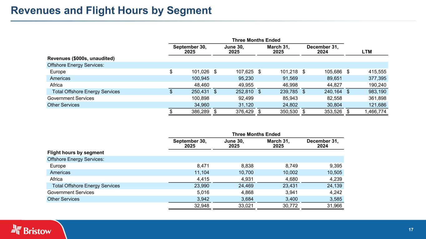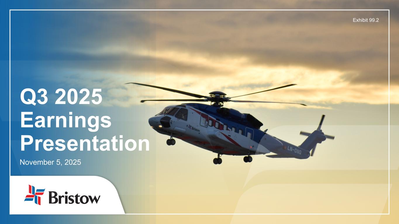 ブリストウ・グループ・インク(NYSE: VTOL)(以下「ブリストウ」または「当社」)は本日、2025 年 9 月 30 日に終了した四半期(以下「当四半期」)の当社株主に帰属する純利益が 5,150 万ドル、希薄化後 1 株当たり 1.72 ドルとなり、総収益は 3 億 8,600 万ドルとなりました。300万ドルの純利益(希薄化後1株当たり1.07ドル)を計上した。