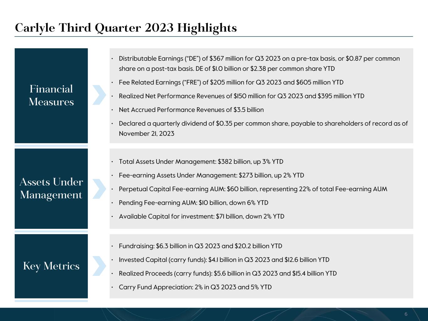 R-14 7 G-19 5 B-19 7 R-88 G-15 9 B-16 5 R-13 6 G-18 0 B-83 R-16 3 G-14 3 B-18 7 R-0 G-74 B-13 6 R-18 5 G-21 1 B-15 3 R-11 8 G-92 B-15 0 R-22 0 G-22 1 B-23 2 R-14 0 G-14 1 B-15 2R-12 0 G-16 9 B-22 2 Old Colors R-88 G-89 B-91 58595B R-23 G-234 B-234 EAEAEA R-208 G-232 B-247 D0E8F7 R-65 G-64 B-66 414042 R-8 G-51 B-94 08335E R-167 G-169 B-171 A7A9AB R-9 G-102 B-112 096670 R-220 G-221 B-222 DCDDDE R-97 G-161 B-224 61A1E0 R-237 G-217 B-157 EDD99D R-147 G-195 B-197 93C3C5 • Fund management fees decreased 6% in 3Q’23 and decreased 1% YTD from the comparable periods in 2022. The decrease in 3Q’23 is primarily driven by lower capital markets fees. The impacts of fundraising across our platform as well as capital deployment in funds on which management fees are based on invested capital were largely offset by the impacts of realizations in funds on which management fees are based on invested capital and a decrease in management fees from our insurance and real assets credit strategies. • Investment loss, including performance allocations, in 3Q’23 reflects the reversal of performance allocations in certain carry funds, partially offset by investment income generated by our equity method investment in the general partners of certain carry funds advised by NGP. We do not control nor advise the NGP funds. Investment loss, including performance allocations, in 3Q’23 YTD reflects 5% appreciation in our carry fund portfolio and largely offset by an investment loss of $104 million related to the dilution of our ownership in Fortitude in connection with the final drawdown against the 2022 capital raise, while investment income, including performance allocations, in 3Q’22 YTD reflects 10% appreciation in our carry portfolio partially offset by an investment loss of $177 million related to the dilution of our ownership in Fortitude in connection with the initial drawdown of the 2022 capital raise. • Equity-based compensation increased in 3Q’23 and YTD 3Q’23 from the comparable periods in 2022, driven by equity awards granted in 1Q’23, including inducement equity awards granted to our new CEO in February. • General, administrative and other expenses decreased 4% in 3Q’23 and increased 22% YTD from the comparable periods in 2022. The quarter-over-quarter decrease was primarily driven by a decrease in professional fees and external finders fees, as well as higher foreign currency translation gains partially offset by higher amortization expense, while the YTD increase was primarily due to foreign currency translation losses in the current year compared to gains in the prior year, as well as higher amortization expense on intangible assets, driven by the amortization of intangibles acquired in the CBAM and Abingworth transactions in 2022. (Dollars in millions, except per share amounts) 3Q'22 3Q'23 YTD 3Q'22 YTD 3Q'23 REVENUES Fund management fees $ 535.9 $ 502.6 $ 1,532.9 $ 1,511.2 Incentive fees 15.1 21.1 42.6 61.9 Investment income (loss), including performance allocations 422.3 (17.7) 1,846.7 (99.2) Revenue from consolidated entities 79.7 152.7 204.6 411.7 All other revenues 35.5 57.9 92.5 152.1 Total Revenues 1,088.5 716.6 3,719.3 2,037.7 EXPENSES Cash-based compensation and benefits 251.4 267.6 779.7 798.4 Equity-based compensation 54.2 64.4 139.3 186.8 Performance allocations and incentive fee related compensation 163.5 (53.9) 741.2 (40.4) General, administrative and other expenses 149.2 143.0 387.2 470.7 Expenses from consolidated entities 53.7 102.5 137.1 298.3 Interest and other non-operating expenses 27.6 31.5 82.8 92.0 Total Expenses 699.6 555.1 2,267.3 1,805.8 Net investment income (loss) of consolidated funds (30.3) (9.3) (51.0) 9.9 Income before provision for income taxes1 358.6 152.2 1,401.0 241.8 Provision (benefit) for income taxes 76.2 41.2 274.9 68.2 Net income (loss) 282.4 111.0 1,126.1 173.6 Net income attributable to non-controlling interests 1.6 29.7 28.3 90.0 Net income (loss) attributable to The Carlyle Group Inc. Common Stockholders $ 280.8 $ 81.3 $ 1,097.8 $ 83.6 Net income (loss) attributable to The Carlyle Group Inc. per common share: Basic $ 0.77 $ 0.23 $ 3.04 $ 0.23 Diluted $ 0.77 $ 0.22 $ 3.00 $ 0.23 Income (loss) before provision for taxes margin2 32.9 % 21.2 % 37.7 % 11.9 % Effective tax rate 21.2 % 27.1 % 19.6 % 28.2 % Net performance revenues3 $ 134.6 $ (64.4) $ 605.0 $ (163.9) Carlyle Third Quarter 2023 U.S. GAAP Results Net income attributable to The Carlyle Group Inc. common stockholders was $81 million for Q3 2023, or $0.22 per share on a diluted basis 5See Notes at end of document.