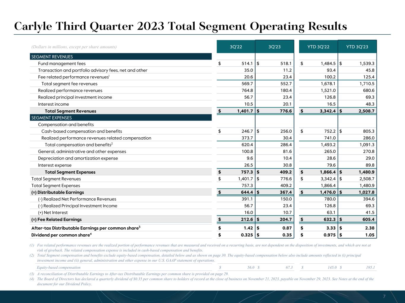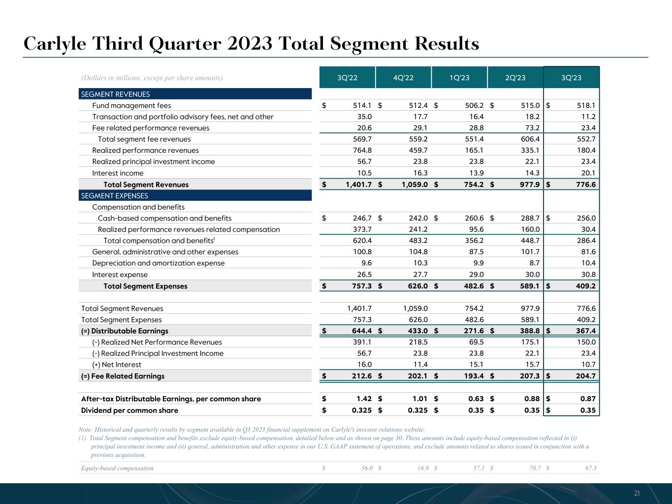R-14 7 G-19 5 B-19 7 R-88 G-15 9 B-16 5 R-13 6 G-18 0 B-83 R-16 3 G-14 3 B-18 7 R-0 G-74 B-13 6 R-18 5 G-21 1 B-15 3 R-11 8 G-92 B-15 0 R-22 0 G-22 1 B-23 2 R-14 0 G-14 1 B-15 2R-12 0 G-16 9 B-22 2 Old Colors R-88 G-89 B-91 58595B R-23 G-234 B-234 EAEAEA R-208 G-232 B-247 D0E8F7 R-65 G-64 B-66 414042 R-8 G-51 B-94 08335E R-167 G-169 B-171 A7A9AB R-9 G-102 B-112 096670 R-220 G-221 B-222 DCDDDE R-97 G-161 B-224 61A1E0 R-237 G-217 B-157 EDD99D R-147 G-195 B-197 93C3C5 Note: Historical and quarterly results by segment available in Q3 2023 financial supplement on Carlyle's investor relations website. (1) Total Segment compensation and benefits exclude equity-based compensation, detailed below and as shown on page 30. These amounts include equity-based compensation reflected in (i) principal investment income and (ii) general, administration and other expense in our U.S. GAAP statement of operations, and exclude amounts related to shares issued in conjunction with a previous acquisition. (Dollars in millions, except per share amounts) 3Q'22 4Q'22 1Q'23 2Q'23 3Q'23 SEGMENT REVENUES Fund management fees $ 514.1 $ 512.4 $ 506.2 $ 515.0 $ 518.1 Transaction and portfolio advisory fees, net and other 35.0 17.7 16.4 18.2 11.2 Fee related performance revenues 20.6 29.1 28.8 73.2 23.4 Total segment fee revenues 569.7 559.2 551.4 606.4 552.7 Realized performance revenues 764.8 459.7 165.1 335.1 180.4 Realized principal investment income 56.7 23.8 23.8 22.1 23.4 Interest income 10.5 16.3 13.9 14.3 20.1 Total Segment Revenues $ 1,401.7 $ 1,059.0 $ 754.2 $ 977.9 $ 776.6 SEGMENT EXPENSES Compensation and benefits Cash-based compensation and benefits $ 246.7 $ 242.0 $ 260.6 $ 288.7 $ 256.0 Realized performance revenues related compensation 373.7 241.2 95.6 160.0 30.4 Total compensation and benefits1 620.4 483.2 356.2 448.7 286.4 General, administrative and other expenses 100.8 104.8 87.5 101.7 81.6 Depreciation and amortization expense 9.6 10.3 9.9 8.7 10.4 Interest expense 26.5 27.7 29.0 30.0 30.8 Total Segment Expenses $ 757.3 $ 626.0 $ 482.6 $ 589.1 $ 409.2 Total Segment Revenues 1,401.7 1,059.0 754.2 977.9 776.6 Total Segment Expenses 757.3 626.0 482.6 589.1 409.2 (=) Distributable Earnings $ 644.4 $ 433.0 $ 271.6 $ 388.8 $ 367.4 (-) Realized Net Performance Revenues 391.1 218.5 69.5 175.1 150.0 (-) Realized Principal Investment Income 56.7 23.8 23.8 22.1 23.4 (+) Net Interest 16.0 11.4 15.1 15.7 10.7 (=) Fee Related Earnings $ 212.6 $ 202.1 $ 193.4 $ 207.3 $ 204.7 After-tax Distributable Earnings, per common share $ 1.42 $ 1.01 $ 0.63 $ 0.88 $ 0.87 Dividend per common share $ 0.325 $ 0.325 $ 0.35 $ 0.35 $ 0.35 Carlyle Third Quarter 2023 Total Segment Results Equity-based compensation $ 56.0 $ 16.9 $ 57.1 $ 70.7 $ 67.3 21