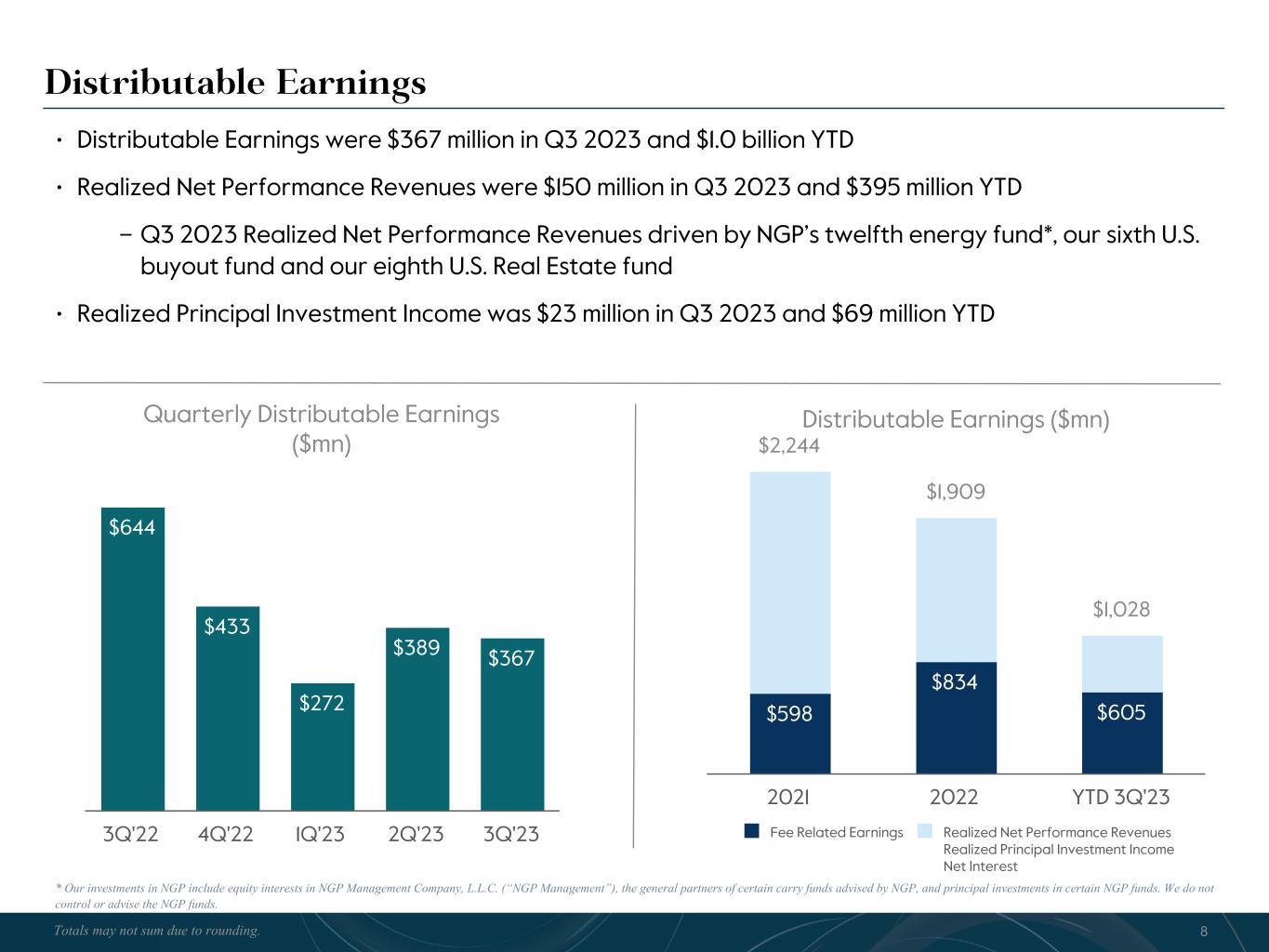 R-14 7 G-19 5 B-19 7 R-88 G-15 9 B-16 5 R-13 6 G-18 0 B-83 R-16 3 G-14 3 B-18 7 R-0 G-74 B-13 6 R-18 5 G-21 1 B-15 3 R-11 8 G-92 B-15 0 R-22 0 G-22 1 B-23 2 R-14 0 G-14 1 B-15 2R-12 0 G-16 9 B-22 2 Old Colors R-88 G-89 B-91 58595B R-23 G-234 B-234 EAEAEA R-208 G-232 B-247 D0E8F7 R-65 G-64 B-66 414042 R-8 G-51 B-94 08335E R-167 G-169 B-171 A7A9AB R-9 G-102 B-112 096670 R-220 G-221 B-222 DCDDDE R-97 G-161 B-224 61A1E0 R-237 G-217 B-157 EDD99D R-147 G-195 B-197 93C3C5 Distributable Earnings • Distributable Earnings were $367 million in Q3 2023 and $1.0 billion YTD • Realized Net Performance Revenues were $150 million in Q3 2023 and $395 million YTD – Q3 2023 Realized Net Performance Revenues driven by NGP’s twelfth energy fund*, our sixth U.S. buyout fund and our eighth U.S. Real Estate fund • Realized Principal Investment Income was $23 million in Q3 2023 and $69 million YTD Quarterly Distributable Earnings ($mn) $644 $433 $272 $389 $367 3Q'22 4Q'22 1Q'23 2Q'23 3Q'23 Distributable Earnings ($mn) $598 $834 $605 $2,244 $1,909 $1,028 Fee Related Earnings Realized Net Performance Revenues Realized Principal Investment Income Net Interest 2021 2022 YTD 3Q'23 8Totals may not sum due to rounding. * Our investments in NGP include equity interests in NGP Management Company, L.L.C. (“NGP Management”), the general partners of certain carry funds advised by NGP, and principal investments in certain NGP funds. We do not control or advise the NGP funds.