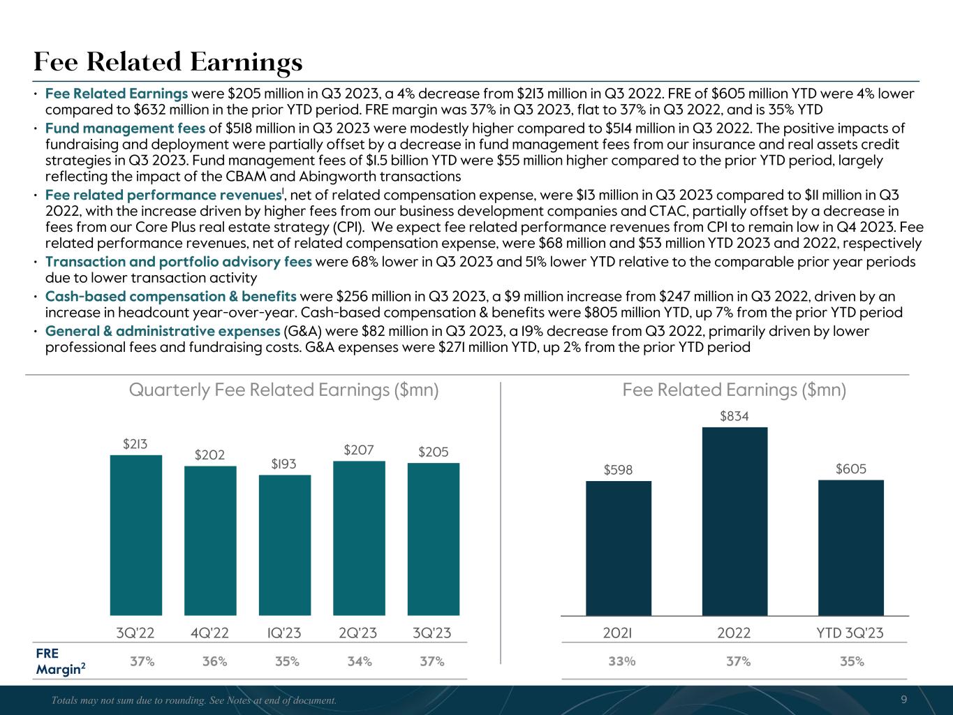 R-14 7 G-19 5 B-19 7 R-88 G-15 9 B-16 5 R-13 6 G-18 0 B-83 R-16 3 G-14 3 B-18 7 R-0 G-74 B-13 6 R-18 5 G-21 1 B-15 3 R-11 8 G-92 B-15 0 R-22 0 G-22 1 B-23 2 R-14 0 G-14 1 B-15 2R-12 0 G-16 9 B-22 2 Old Colors R-88 G-89 B-91 58595B R-23 G-234 B-234 EAEAEA R-208 G-232 B-247 D0E8F7 R-65 G-64 B-66 414042 R-8 G-51 B-94 08335E R-167 G-169 B-171 A7A9AB R-9 G-102 B-112 096670 R-220 G-221 B-222 DCDDDE R-97 G-161 B-224 61A1E0 R-237 G-217 B-157 EDD99D R-147 G-195 B-197 93C3C5 Fee Related Earnings • Fee Related Earnings were $205 million in Q3 2023, a 4% decrease from $213 million in Q3 2022. FRE of $605 million YTD were 4% lower compared to $632 million in the prior YTD period. FRE margin was 37% in Q3 2023, flat to 37% in Q3 2022, and is 35% YTD • Fund management fees of $518 million in Q3 2023 were modestly higher compared to $514 million in Q3 2022. The positive impacts of fundraising and deployment were partially offset by a decrease in fund management fees from our insurance and real assets credit strategies in Q3 2023. Fund management fees of $1.5 billion YTD were $55 million higher compared to the prior YTD period, largely reflecting the impact of the CBAM and Abingworth transactions • Fee related performance revenues1, net of related compensation expense, were $13 million in Q3 2023 compared to $11 million in Q3 2022, with the increase driven by higher fees from our business development companies and CTAC, partially offset by a decrease in fees from our Core Plus real estate strategy (CPI). We expect fee related performance revenues from CPI to remain low in Q4 2023. Fee related performance revenues, net of related compensation expense, were $68 million and $53 million YTD 2023 and 2022, respectively • Transaction and portfolio advisory fees were 68% lower in Q3 2023 and 51% lower YTD relative to the comparable prior year periods due to lower transaction activity • Cash-based compensation & benefits were $256 million in Q3 2023, a $9 million increase from $247 million in Q3 2022, driven by an increase in headcount year-over-year. Cash-based compensation & benefits were $805 million YTD, up 7% from the prior YTD period • General & administrative expenses (G&A) were $82 million in Q3 2023, a 19% decrease from Q3 2022, primarily driven by lower professional fees and fundraising costs. G&A expenses were $271 million YTD, up 2% from the prior YTD period Quarterly Fee Related Earnings ($mn) $213 $202 $193 $207 $205 3Q'22 4Q'22 1Q'23 2Q'23 3Q'23 Fee Related Earnings ($mn) $598 $834 $605 2021 2022 YTD 3Q'23 FRE Margin2 37% 36% 35% 34% 37% 33% 37% 35% 9Totals may not sum due to rounding. See Notes at end of document.