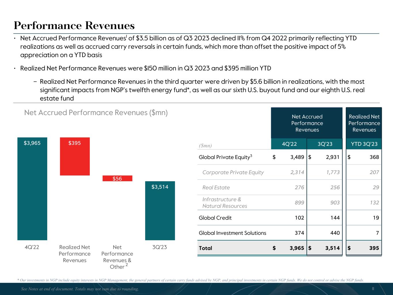 R-14 7 G-19 5 B-19 7 R-88 G-15 9 B-16 5 R-13 6 G-18 0 B-83 R-16 3 G-14 3 B-18 7 R-0 G-74 B-13 6 R-18 5 G-21 1 B-15 3 R-11 8 G-92 B-15 0 R-22 0 G-22 1 B-23 2 R-14 0 G-14 1 B-15 2R-12 0 G-16 9 B-22 2 Old Colors R-88 G-89 B-91 58595B R-23 G-234 B-234 EAEAEA R-208 G-232 B-247 D0E8F7 R-65 G-64 B-66 414042 R-8 G-51 B-94 08335E R-167 G-169 B-171 A7A9AB R-9 G-102 B-112 096670 R-220 G-221 B-222 DCDDDE R-97 G-161 B-224 61A1E0 R-237 G-217 B-157 EDD99D R-147 G-195 B-197 93C3C5 Performance Revenues Net Accrued Performance Revenues ($mn) $3,965 $3,570 $3,514 $3,514 $395 $56 4Q'22 Realized Net Performance Revenues Net Performance Revenues & Other 3Q'23 2 Net Accrued Performance Revenues Realized Net Performance Revenues ($mn) 4Q'22 3Q'23 YTD 3Q'23 Global Private Equity3 $ 3,489 $ 2,931 $ 368 Corporate Private Equity 2,314 1,773 207 Real Estate 276 256 29 Infrastructure & Natural Resources 899 903 132 Global Credit 102 144 19 Global Investment Solutions 374 440 7 Total $ 3,965 $ 3,514 $ 395 11 • Net Accrued Performance Revenues1 of $3.5 billion as of Q3 2023 declined 11% from Q4 2022 primarily reflecting YTD realizations as well as accrued carry reversals in certain funds, which more than offset the positive impact of 5% appreciation on a YTD basis • Realized Net Performance Revenues were $150 million in Q3 2023 and $395 million YTD – Realized Net Performance Revenues in the third quarter were driven by $5.6 billion in realizations, with the most significant impacts from NGP’s twelfth energy fund*, as well as our sixth U.S. buyout fund and our eighth U.S. real estate fund See Notes at end of document. Totals may not sum due to rounding. * Our investments in NGP include equity interests in NGP Management, the general partners of certain carry funds advised by NGP, and principal investments in certain NGP funds. We do not control or advise the NGP funds.