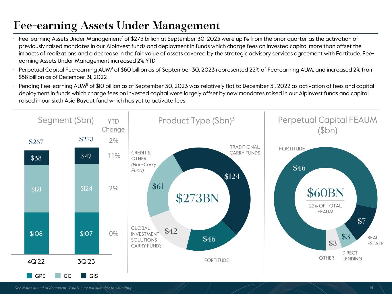 R-14 7 G-19 5 B-19 7 R-88 G-15 9 B-16 5 R-13 6 G-18 0 B-83 R-16 3 G-14 3 B-18 7 R-0 G-74 B-13 6 R-18 5 G-21 1 B-15 3 R-11 8 G-92 B-15 0 R-22 0 G-22 1 B-23 2 R-14 0 G-14 1 B-15 2R-12 0 G-16 9 B-22 2 Old Colors R-88 G-89 B-91 58595B R-23 G-234 B-234 EAEAEA R-208 G-232 B-247 D0E8F7 R-65 G-64 B-66 414042 R-8 G-51 B-94 08335E R-167 G-169 B-171 A7A9AB R-9 G-102 B-112 096670 R-220 G-221 B-222 DCDDDE R-97 G-161 B-224 61A1E0 R-237 G-217 B-157 EDD99D R-147 G-195 B-197 93C3C5 $182 $52 $72 $76 • Total Assets Under Management1 of $382 billion at September 30, 2023, down 1% from the prior quarter but up 3% from Q4 2022. Total AUM declined slightly from Q2 2023 due to a decrease in the value of the assets covered by the strategic advisory services agreement with Fortitude, the negative impact of the translation of our Euro denominated funds to USD as well as fund distributions, partially offset by new capital raised and modest appreciation in the period • Available Capital2 of $71 billion at September 30, 2023 decreased slightly from $72 billion last quarter Fair Value & Available Capital ($bn) $123 $140 $49 $311$37 $11 $23 $71 GPE GC GIS Total Total Assets Under Management n Fair Value n Available Capital 12See Notes at end of document. Totals may not sum due to rounding. Segment ($bn) $163 $161 $146 $150 $63 $72 $373 $382 GPE GC GIS 4Q'22 3Q'23 YTD Change 3% 13% 3% (2)% $382BN TRADITIONAL CARRY FUNDS GLOBAL INVESTMENT SOLUTIONS CARRY FUNDS CREDIT & OTHER (Non-Carry Fund) Product Type ($bn)3 $161 $150 $72 $382 FORTITUDE