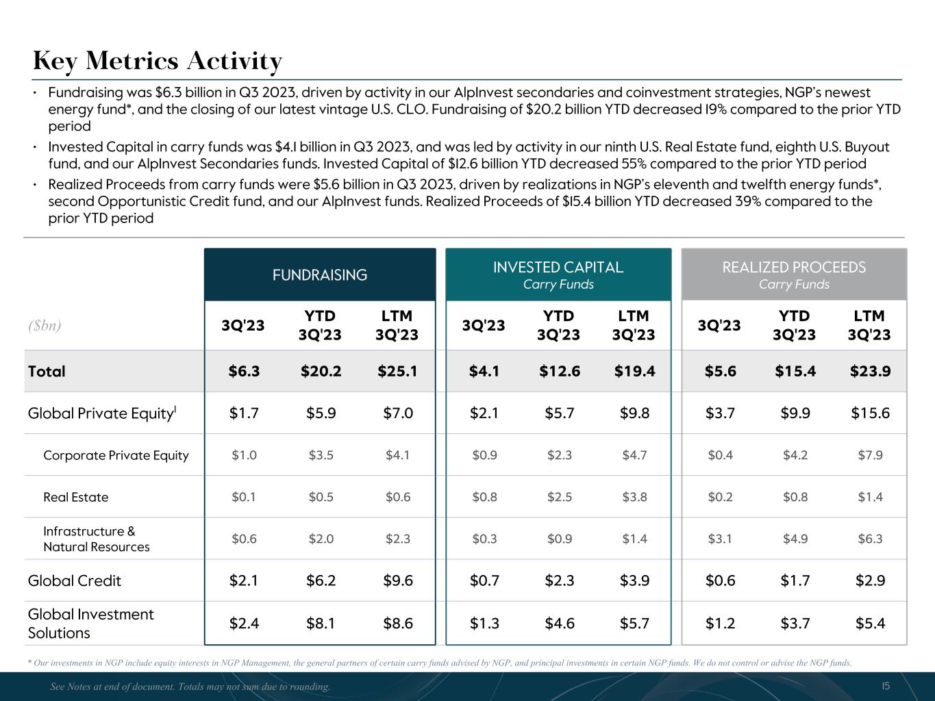 R-14 7 G-19 5 B-19 7 R-88 G-15 9 B-16 5 R-13 6 G-18 0 B-83 R-16 3 G-14 3 B-18 7 R-0 G-74 B-13 6 R-18 5 G-21 1 B-15 3 R-11 8 G-92 B-15 0 R-22 0 G-22 1 B-23 2 R-14 0 G-14 1 B-15 2R-12 0 G-16 9 B-22 2 Old Colors R-88 G-89 B-91 58595B R-23 G-234 B-234 EAEAEA R-208 G-232 B-247 D0E8F7 R-65 G-64 B-66 414042 R-8 G-51 B-94 08335E R-167 G-169 B-171 A7A9AB R-9 G-102 B-112 096670 R-220 G-221 B-222 DCDDDE R-97 G-161 B-224 61A1E0 R-237 G-217 B-157 EDD99D R-147 G-195 B-197 93C3C5 Key Metrics Activity • Fundraising was $6.3 billion in Q3 2023, driven by activity in our AlpInvest secondaries and coinvestment strategies, NGP’s newest energy fund*, and the closing of our latest vintage U.S. CLO. Fundraising of $20.2 billion YTD decreased 19% compared to the prior YTD period • Invested Capital in carry funds was $4.1 billion in Q3 2023, and was led by activity in our ninth U.S. Real Estate fund, eighth U.S. Buyout fund, and our AlpInvest Secondaries funds. Invested Capital of $12.6 billion YTD decreased 55% compared to the prior YTD period • Realized Proceeds from carry funds were $5.6 billion in Q3 2023, driven by realizations in NGP’s eleventh and twelfth energy funds*, second Opportunistic Credit fund, and our AlpInvest funds. Realized Proceeds of $15.4 billion YTD decreased 39% compared to the prior YTD period FUNDRAISING INVESTED CAPITAL Carry Funds REALIZED PROCEEDS Carry Funds ($bn) 3Q'23 YTD 3Q'23 LTM 3Q'23 3Q'23 YTD 3Q'23 LTM 3Q'23 3Q'23 YTD 3Q'23 LTM 3Q'23 Total $6.3 $20.2 $25.1 $4.1 $12.6 $19.4 $5.6 $15.4 $23.9 Global Private Equity1 $1.7 $5.9 $7.0 $2.1 $5.7 $9.8 $3.7 $9.9 $15.6 Corporate Private Equity $1.0 $3.5 $4.1 $0.9 $2.3 $4.7 $0.4 $4.2 $7.9 Real Estate $0.1 $0.5 $0.6 $0.8 $2.5 $3.8 $0.2 $0.8 $1.4 Infrastructure & Natural Resources $0.6 $2.0 $2.3 $0.3 $0.9 $1.4 $3.1 $4.9 $6.3 Global Credit $2.1 $6.2 $9.6 $0.7 $2.3 $3.9 $0.6 $1.7 $2.9 Global Investment Solutions $2.4 $8.1 $8.6 $1.3 $4.6 $5.7 $1.2 $3.7 $5.4 15See Notes at end of document. Totals may not sum due to rounding. * Our investments in NGP include equity interests in NGP Management, the general partners of certain carry funds advised by NGP, and principal investments in certain NGP funds. We do not control or advise the NGP funds.