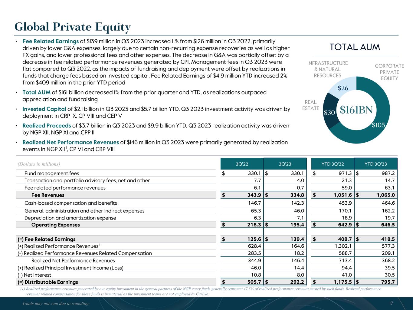 R-14 7 G-19 5 B-19 7 R-88 G-15 9 B-16 5 R-13 6 G-18 0 B-83 R-16 3 G-14 3 B-18 7 R-0 G-74 B-13 6 R-18 5 G-21 1 B-15 3 R-11 8 G-92 B-15 0 R-22 0 G-22 1 B-23 2 R-14 0 G-14 1 B-15 2R-12 0 G-16 9 B-22 2 Old Colors R-88 G-89 B-91 58595B R-23 G-234 B-234 EAEAEA R-208 G-232 B-247 D0E8F7 R-65 G-64 B-66 414042 R-8 G-51 B-94 08335E R-167 G-169 B-171 A7A9AB R-9 G-102 B-112 096670 R-220 G-221 B-222 DCDDDE R-97 G-161 B-224 61A1E0 R-237 G-217 B-157 EDD99D R-147 G-195 B-197 93C3C5 Global Private Equity $105 $30 $26 $161BN (Dollars in millions) 3Q'22 3Q'23 YTD 3Q'22 YTD 3Q'23 Fund management fees $ 330.1 $ 330.1 $ 971.3 $ 987.2 Transaction and portfolio advisory fees, net and other 7.7 4.0 21.3 14.7 Fee related performance revenues 6.1 0.7 59.0 63.1 Fee Revenues $ 343.9 $ 334.8 $ 1,051.6 $ 1,065.0 Cash-based compensation and benefits 146.7 142.3 453.9 464.6 General, administration and other indirect expenses 65.3 46.0 170.1 162.2 Depreciation and amortization expense 6.3 7.1 18.9 19.7 Operating Expenses $ 218.3 $ 195.4 $ 642.9 $ 646.5 (=) Fee Related Earnings $ 125.6 $ 139.4 $ 408.7 $ 418.5 (+) Realized Performance Revenues 1 628.4 164.6 1,302.1 577.3 (-) Realized Performance Revenues Related Compensation 283.5 18.2 588.7 209.1 Realized Net Performance Revenues 344.9 146.4 713.4 368.2 (+) Realized Principal Investment Income (Loss) 46.0 14.4 94.4 39.5 (-) Net Interest 10.8 8.0 41.0 30.5 (=) Distributable Earnings $ 505.7 $ 292.2 $ 1,175.5 $ 795.7 CORPORATE PRIVATE EQUITY REAL ESTATE INFRASTRUCTURE & NATURAL RESOURCES 17 TOTAL AUM Totals may not sum due to rounding. • Fee Related Earnings of $139 million in Q3 2023 increased 11% from $126 million in Q3 2022, primarily driven by lower G&A expenses, largely due to certain non-recurring expense recoveries as well as higher FX gains, and lower professional fees and other expenses. The decrease in G&A was partially offset by a decrease in fee related performance revenues generated by CPI. Management fees in Q3 2023 were flat compared to Q3 2022, as the impacts of fundraising and deployment were offset by realizations in funds that charge fees based on invested capital. Fee Related Earnings of $419 million YTD increased 2% from $409 million in the prior YTD period • Total AUM of $161 billion decreased 1% from the prior quarter and YTD, as realizations outpaced appreciation and fundraising • Invested Capital of $2.1 billion in Q3 2023 and $5.7 billion YTD. Q3 2023 investment activity was driven by deployment in CRP IX, CP VIII and CEP V • Realized Proceeds of $3.7 billion in Q3 2023 and $9.9 billion YTD. Q3 2023 realization activity was driven by NGP XII, NGP XI and CPP II • Realized Net Performance Revenues of $146 million in Q3 2023 were primarily generated by realization events in NGP XII 1, CP VI and CRP VIII (1) Realized performance revenues generated by our equity investment in the general partners of the NGP carry funds generally represent 47.5% of realized performance revenues earned by such funds. Realized performance revenues related compensation for these funds is immaterial as the investment teams are not employed by Carlyle.