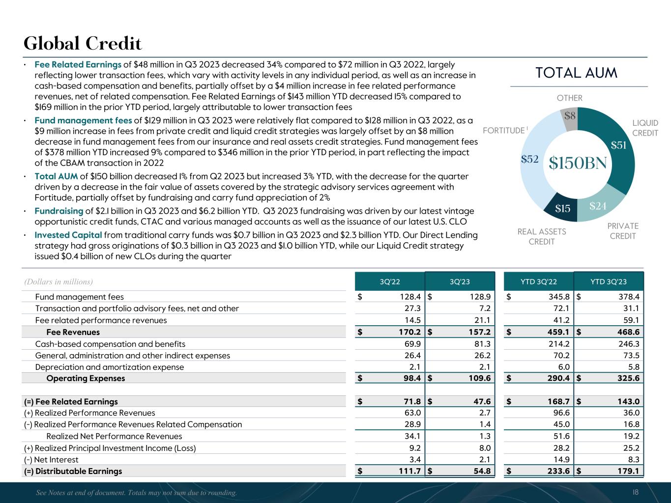 R-14 7 G-19 5 B-19 7 R-88 G-15 9 B-16 5 R-13 6 G-18 0 B-83 R-16 3 G-14 3 B-18 7 R-0 G-74 B-13 6 R-18 5 G-21 1 B-15 3 R-11 8 G-92 B-15 0 R-22 0 G-22 1 B-23 2 R-14 0 G-14 1 B-15 2R-12 0 G-16 9 B-22 2 Old Colors R-88 G-89 B-91 58595B R-23 G-234 B-234 EAEAEA R-208 G-232 B-247 D0E8F7 R-65 G-64 B-66 414042 R-8 G-51 B-94 08335E R-167 G-169 B-171 A7A9AB R-9 G-102 B-112 096670 R-220 G-221 B-222 DCDDDE R-97 G-161 B-224 61A1E0 R-237 G-217 B-157 EDD99D R-147 G-195 B-197 93C3C5 Global Credit (Dollars in millions) 3Q'22 3Q'23 YTD 3Q'22 YTD 3Q'23 Fund management fees $ 128.4 $ 128.9 $ 345.8 $ 378.4 Transaction and portfolio advisory fees, net and other 27.3 7.2 72.1 31.1 Fee related performance revenues 14.5 21.1 41.2 59.1 Fee Revenues $ 170.2 $ 157.2 $ 459.1 $ 468.6 Cash-based compensation and benefits 69.9 81.3 214.2 246.3 General, administration and other indirect expenses 26.4 26.2 70.2 73.5 Depreciation and amortization expense 2.1 2.1 6.0 5.8 Operating Expenses $ 98.4 $ 109.6 $ 290.4 $ 325.6 (=) Fee Related Earnings $ 71.8 $ 47.6 $ 168.7 $ 143.0 (+) Realized Performance Revenues 63.0 2.7 96.6 36.0 (-) Realized Performance Revenues Related Compensation 28.9 1.4 45.0 16.8 Realized Net Performance Revenues 34.1 1.3 51.6 19.2 (+) Realized Principal Investment Income (Loss) 9.2 8.0 28.2 25.2 (-) Net Interest 3.4 2.1 14.9 8.3 (=) Distributable Earnings $ 111.7 $ 54.8 $ 233.6 $ 179.1 $51 $24$15 $52 $8 LIQUID CREDIT REAL ASSETS CREDIT $150BN • Fee Related Earnings of $48 million in Q3 2023 decreased 34% compared to $72 million in Q3 2022, largely reflecting lower transaction fees, which vary with activity levels in any individual period, as well as an increase in cash-based compensation and benefits, partially offset by a $4 million increase in fee related performance revenues, net of related compensation. Fee Related Earnings of $143 million YTD decreased 15% compared to $169 million in the prior YTD period, largely attributable to lower transaction fees • Fund management fees of $129 million in Q3 2023 were relatively flat compared to $128 million in Q3 2022, as a $9 million increase in fees from private credit and liquid credit strategies was largely offset by an $8 million decrease in fund management fees from our insurance and real assets credit strategies. Fund management fees of $378 million YTD increased 9% compared to $346 million in the prior YTD period, in part reflecting the impact of the CBAM transaction in 2022 • Total AUM of $150 billion decreased 1% from Q2 2023 but increased 3% YTD, with the decrease for the quarter driven by a decrease in the fair value of assets covered by the strategic advisory services agreement with Fortitude, partially offset by fundraising and carry fund appreciation of 2% • Fundraising of $2.1 billion in Q3 2023 and $6.2 billion YTD. Q3 2023 fundraising was driven by our latest vintage opportunistic credit funds, CTAC and various managed accounts as well as the issuance of our latest U.S. CLO • Invested Capital from traditional carry funds was $0.7 billion in Q3 2023 and $2.3 billion YTD. Our Direct Lending strategy had gross originations of $0.3 billion in Q3 2023 and $1.0 billion YTD, while our Liquid Credit strategy issued $0.4 billion of new CLOs during the quarter OTHER 18 PRIVATE CREDIT TOTAL AUM FORTITUDE 1 See Notes at end of document. Totals may not sum due to rounding.