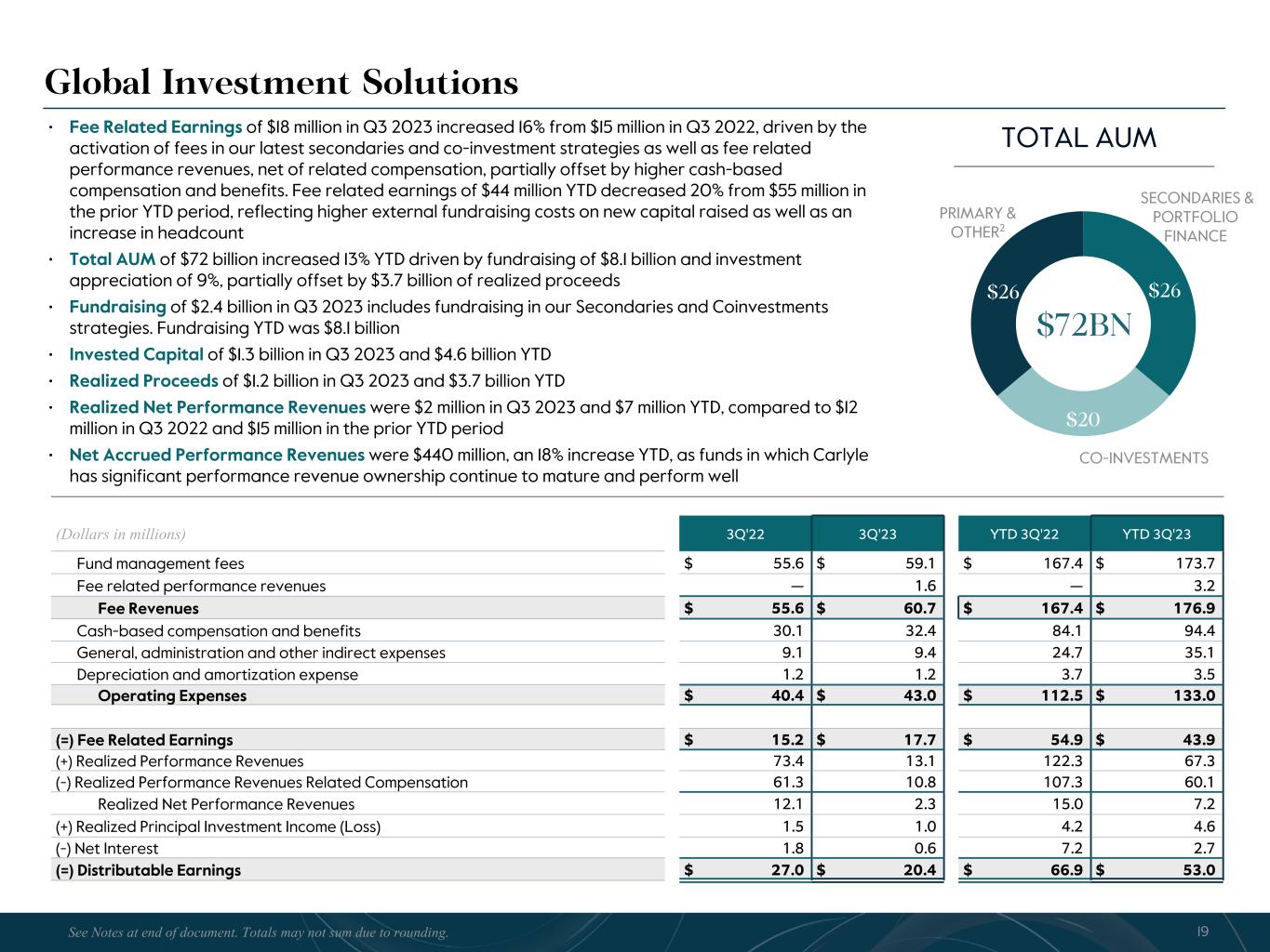 R-14 7 G-19 5 B-19 7 R-88 G-15 9 B-16 5 R-13 6 G-18 0 B-83 R-16 3 G-14 3 B-18 7 R-0 G-74 B-13 6 R-18 5 G-21 1 B-15 3 R-11 8 G-92 B-15 0 R-22 0 G-22 1 B-23 2 R-14 0 G-14 1 B-15 2R-12 0 G-16 9 B-22 2 Old Colors R-88 G-89 B-91 58595B R-23 G-234 B-234 EAEAEA R-208 G-232 B-247 D0E8F7 R-65 G-64 B-66 414042 R-8 G-51 B-94 08335E R-167 G-169 B-171 A7A9AB R-9 G-102 B-112 096670 R-220 G-221 B-222 DCDDDE R-97 G-161 B-224 61A1E0 R-237 G-217 B-157 EDD99D R-147 G-195 B-197 93C3C5 Global Investment Solutions • Fee Related Earnings of $18 million in Q3 2023 increased 16% from $15 million in Q3 2022, driven by the activation of fees in our latest secondaries and co-investment strategies as well as fee related performance revenues, net of related compensation, partially offset by higher cash-based compensation and benefits. Fee related earnings of $44 million YTD decreased 20% from $55 million in the prior YTD period, reflecting higher external fundraising costs on new capital raised as well as an increase in headcount • Total AUM of $72 billion increased 13% YTD driven by fundraising of $8.1 billion and investment appreciation of 9%, partially offset by $3.7 billion of realized proceeds • Fundraising of $2.4 billion in Q3 2023 includes fundraising in our Secondaries and Coinvestments strategies. Fundraising YTD was $8.1 billion • Invested Capital of $1.3 billion in Q3 2023 and $4.6 billion YTD • Realized Proceeds of $1.2 billion in Q3 2023 and $3.7 billion YTD • Realized Net Performance Revenues were $2 million in Q3 2023 and $7 million YTD, compared to $12 million in Q3 2022 and $15 million in the prior YTD period • Net Accrued Performance Revenues were $440 million, an 18% increase YTD, as funds in which Carlyle has significant performance revenue ownership continue to mature and perform well (Dollars in millions) 3Q'22 3Q'23 YTD 3Q'22 YTD 3Q'23 Fund management fees $ 55.6 $ 59.1 $ 167.4 $ 173.7 Fee related performance revenues — 1.6 — 3.2 Fee Revenues $ 55.6 $ 60.7 $ 167.4 $ 176.9 Cash-based compensation and benefits 30.1 32.4 84.1 94.4 General, administration and other indirect expenses 9.1 9.4 24.7 35.1 Depreciation and amortization expense 1.2 1.2 3.7 3.5 Operating Expenses $ 40.4 $ 43.0 $ 112.5 $ 133.0 (=) Fee Related Earnings $ 15.2 $ 17.7 $ 54.9 $ 43.9 (+) Realized Performance Revenues 73.4 13.1 122.3 67.3 (-) Realized Performance Revenues Related Compensation 61.3 10.8 107.3 60.1 Realized Net Performance Revenues 12.1 2.3 15.0 7.2 (+) Realized Principal Investment Income (Loss) 1.5 1.0 4.2 4.6 (-) Net Interest 1.8 0.6 7.2 2.7 (=) Distributable Earnings $ 27.0 $ 20.4 $ 66.9 $ 53.0 $26 $20 $26 SECONDARIES & PORTFOLIO FINANCE CO-INVESTMENTS PRIMARY & OTHER2 $72BN 19See Notes at end of document. Totals may not sum due to rounding. TOTAL AUM