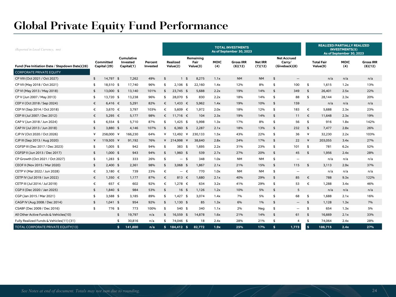 R-14 7 G-19 5 B-19 7 R-88 G-15 9 B-16 5 R-13 6 G-18 0 B-83 R-16 3 G-14 3 B-18 7 R-0 G-74 B-13 6 R-18 5 G-21 1 B-15 3 R-11 8 G-92 B-15 0 R-22 0 G-22 1 B-23 2 R-14 0 G-14 1 B-15 2R-12 0 G-16 9 B-22 2 Old Colors R-88 G-89 B-91 58595B R-23 G-234 B-234 EAEAEA R-208 G-232 B-247 D0E8F7 R-65 G-64 B-66 414042 R-8 G-51 B-94 08335E R-167 G-169 B-171 A7A9AB R-9 G-102 B-112 096670 R-220 G-221 B-222 DCDDDE R-97 G-161 B-224 61A1E0 R-237 G-217 B-157 EDD99D R-147 G-195 B-197 93C3C5 Global Private Equity Fund Performance (Reported in Local Currency, mn) TOTAL INVESTMENTS As of September 30, 2023 REALIZED/PARTIALLY REALIZED INVESTMENTS(5) As of September 30, 2023 Fund (Fee Initiation Date / Stepdown Date)(28) Committed Capital (29) Cumulative Invested Capital(1) Percent Invested Realized Value(2) Remaining Fair Value(3) MOIC (4) Gross IRR (6)(12) Net IRR (7)(12) Net Accrued Carry/ (Giveback)(8) Total Fair Value(9) MOIC (4) Gross IRR (6)(12) CORPORATE PRIVATE EQUITY CP VIII (Oct 2021 / Oct 2027) $ 14,797 $ 7,262 49% $ 1 $ 8,275 1.1x NM NM $ — n/a n/a n/a CP VII (May 2018 / Oct 2021) $ 18,510 $ 17,740 96% $ 2,106 $ 22,160 1.4x 12% 8% $ 100 $ 1,615 1.2x 13% CP VI (May 2013 / May 2018) $ 13,000 $ 13,140 101% $ 23,745 $ 5,688 2.2x 19% 14% $ 349 $ 26,401 2.5x 22% CP V (Jun 2007 / May 2013) $ 13,720 $ 13,238 96% $ 28,070 $ 830 2.2x 18% 14% $ 88 $ 28,144 2.3x 20% CEP V (Oct 2018 / Sep 2024) € 6,416 € 5,291 82% € 1,433 € 5,962 1.4x 19% 10% $ 159 n/a n/a n/a CEP IV (Sep 2014 / Oct 2018) € 3,670 € 3,797 103% € 5,609 € 1,972 2.0x 18% 12% $ 183 € 5,688 2.3x 23% CEP III (Jul 2007 / Dec 2012) € 5,295 € 5,177 98% € 11,716 € 104 2.3x 19% 14% $ 11 € 11,648 2.3x 19% CAP V (Jun 2018 / Jun 2024) $ 6,554 $ 5,710 87% $ 1,425 $ 5,998 1.3x 17% 8% $ 56 $ 916 1.8x 142% CAP IV (Jul 2013 / Jun 2018) $ 3,880 $ 4,146 107% $ 6,360 $ 2,287 2.1x 18% 13% $ 232 $ 7,477 2.8x 26% CJP IV (Oct 2020 / Oct 2026) ¥ 258,000 ¥ 166,230 64% ¥ 12,492 ¥ 230,133 1.5x 43% 22% $ 36 ¥ 32,230 2.2x 103% CJP III (Sep 2013 / Aug 2020) ¥ 119,505 ¥ 91,192 76% ¥ 214,998 ¥ 38,640 2.8x 24% 17% $ 22 ¥ 203,055 3.4x 27% CGFSP III (Dec 2017 / Dec 2023) $ 1,005 $ 942 94% $ 383 $ 1,695 2.2x 31% 23% $ 101 $ 781 6.2x 52% CGFSP II (Jun 2013 / Dec 2017) $ 1,000 $ 943 94% $ 1,960 $ 539 2.7x 27% 20% $ 45 $ 1,956 2.4x 28% CP Growth (Oct 2021 / Oct 2027) $ 1,283 $ 333 26% $ — $ 348 1.0x NM NM $ — n/a n/a n/a CEOF II (Nov 2015 / Mar 2020) $ 2,400 $ 2,361 98% $ 3,068 $ 1,867 2.1x 21% 15% $ 115 $ 3,113 2.9x 37% CETP V (Mar 2022 / Jun 2028) € 3,180 € 739 23% € — € 770 1.0x NM NM $ — n/a n/a n/a CETP IV (Jul 2019 / Jun 2022) € 1,350 € 1,177 87% € 813 € 1,680 2.1x 40% 29% $ 85 € 788 9.3x 122% CETP III (Jul 2014 / Jul 2019) € 657 € 602 92% € 1,278 € 634 3.2x 41% 29% $ 53 € 1,288 3.4x 46% CGP II (Dec 2020 / Jan 2025) $ 1,840 $ 984 53% $ 16 $ 1,126 1.2x 10% 5% $ 5 n/a n/a n/a CGP (Jan 2015 / Mar 2021) $ 3,588 $ 3,185 89% $ 1,427 $ 3,074 1.4x 7% 5% $ 68 $ 1,688 2.1x 16% CAGP IV (Aug 2008 / Dec 2014) $ 1,041 $ 954 92% $ 1,130 $ 85 1.3x 6% 1% $ — $ 1,128 1.3x 7% CSABF (Dec 2009 / Dec 2016) $ 776 $ 773 100% $ 540 $ 340 1.1x 2% Neg $ — $ 654 1.3x 5% All Other Active Funds & Vehicles(10) $ 19,797 n/a $ 16,559 $ 14,878 1.6x 21% 14% $ 61 $ 16,669 2.1x 33% Fully Realized Funds & Vehicles(11) (31) $ 30,816 n/a $ 74,046 $ 18 2.4x 28% 21% $ 4 $ 74,064 2.4x 28% TOTAL CORPORATE PRIVATE EQUITY(13) $ 141,800 n/a $ 184,412 $ 82,772 1.9x 25% 17% $ 1,773 $ 186,715 2.4x 27% 24See Notes at end of document. Totals may not sum due to rounding.