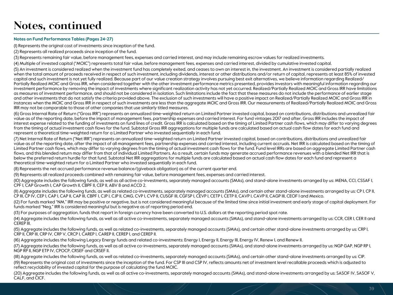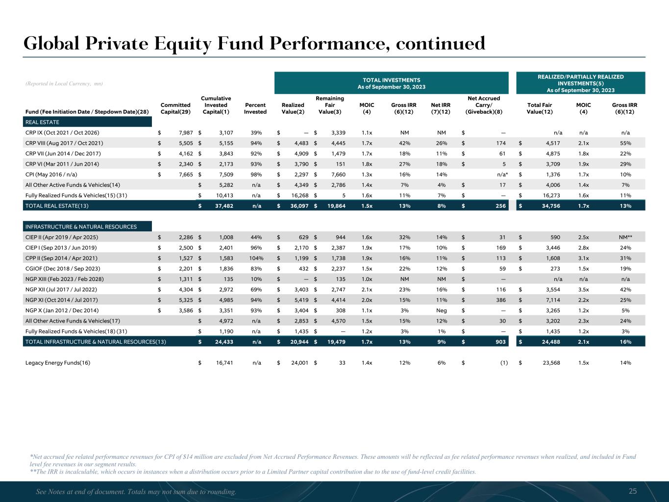 R-14 7 G-19 5 B-19 7 R-88 G-15 9 B-16 5 R-13 6 G-18 0 B-83 R-16 3 G-14 3 B-18 7 R-0 G-74 B-13 6 R-18 5 G-21 1 B-15 3 R-11 8 G-92 B-15 0 R-22 0 G-22 1 B-23 2 R-14 0 G-14 1 B-15 2R-12 0 G-16 9 B-22 2 Old Colors R-88 G-89 B-91 58595B R-23 G-234 B-234 EAEAEA R-208 G-232 B-247 D0E8F7 R-65 G-64 B-66 414042 R-8 G-51 B-94 08335E R-167 G-169 B-171 A7A9AB R-9 G-102 B-112 096670 R-220 G-221 B-222 DCDDDE R-97 G-161 B-224 61A1E0 R-237 G-217 B-157 EDD99D R-147 G-195 B-197 93C3C5 Global Private Equity Fund Performance, continued (Reported in Local Currency, mn) TOTAL INVESTMENTS As of September 30, 2023 REALIZED/PARTIALLY REALIZED INVESTMENTS(5) As of September 30, 2023 Fund (Fee Initiation Date / Stepdown Date)(28) Committed Capital(29) Cumulative Invested Capital(1) Percent Invested Realized Value(2) Remaining Fair Value(3) MOIC (4) Gross IRR (6)(12) Net IRR (7)(12) Net Accrued Carry/ (Giveback)(8) Total Fair Value(12) MOIC (4) Gross IRR (6)(12) REAL ESTATE CRP IX (Oct 2021 / Oct 2026) $ 7,987 $ 3,107 39% $ — $ 3,339 1.1x NM NM $ — n/a n/a n/a CRP VIII (Aug 2017 / Oct 2021) $ 5,505 $ 5,155 94% $ 4,483 $ 4,445 1.7x 42% 26% $ 174 $ 4,517 2.1x 55% CRP VII (Jun 2014 / Dec 2017) $ 4,162 $ 3,843 92% $ 4,909 $ 1,479 1.7x 18% 11% $ 61 $ 4,875 1.8x 22% CRP VI (Mar 2011 / Jun 2014) $ 2,340 $ 2,173 93% $ 3,790 $ 151 1.8x 27% 18% $ 5 $ 3,709 1.9x 29% CPI (May 2016 / n/a) $ 7,665 $ 7,509 98% $ 2,297 $ 7,660 1.3x 16% 14% n/a* $ 1,376 1.7x 10% All Other Active Funds & Vehicles(14) $ 5,282 n/a $ 4,349 $ 2,786 1.4x 7% 4% $ 17 $ 4,006 1.4x 7% Fully Realized Funds & Vehicles(15) (31) $ 10,413 n/a $ 16,268 $ 5 1.6x 11% 7% $ — $ 16,273 1.6x 11% TOTAL REAL ESTATE(13) $ 37,482 n/a $ 36,097 $ 19,864 1.5x 13% 8% $ 256 $ 34,756 1.7x 13% INFRASTRUCTURE & NATURAL RESOURCES CIEP II (Apr 2019 / Apr 2025) $ 2,286 $ 1,008 44% $ 629 $ 944 1.6x 32% 14% $ 31 $ 590 2.5x NM** CIEP I (Sep 2013 / Jun 2019) $ 2,500 $ 2,401 96% $ 2,170 $ 2,387 1.9x 17% 10% $ 169 $ 3,446 2.8x 24% CPP II (Sep 2014 / Apr 2021) $ 1,527 $ 1,583 104% $ 1,199 $ 1,738 1.9x 16% 11% $ 113 $ 1,608 3.1x 31% CGIOF (Dec 2018 / Sep 2023) $ 2,201 $ 1,836 83% $ 432 $ 2,237 1.5x 22% 12% $ 59 $ 273 1.5x 19% NGP XIII (Feb 2023 / Feb 2028) $ 1,311 $ 135 10% $ — $ 135 1.0x NM NM $ — n/a n/a n/a NGP XII (Jul 2017 / Jul 2022) $ 4,304 $ 2,972 69% $ 3,403 $ 2,747 2.1x 23% 16% $ 116 $ 3,554 3.5x 42% NGP XI (Oct 2014 / Jul 2017) $ 5,325 $ 4,985 94% $ 5,419 $ 4,414 2.0x 15% 11% $ 386 $ 7,114 2.2x 25% NGP X (Jan 2012 / Dec 2014) $ 3,586 $ 3,351 93% $ 3,404 $ 308 1.1x 3% Neg $ — $ 3,265 1.2x 5% All Other Active Funds & Vehicles(17) $ 4,972 n/a $ 2,853 $ 4,570 1.5x 15% 12% $ 30 $ 3,202 2.3x 24% Fully Realized Funds & Vehicles(18) (31) $ 1,190 n/a $ 1,435 $ — 1.2x 3% 1% $ — $ 1,435 1.2x 3% TOTAL INFRASTRUCTURE & NATURAL RESOURCES(13) $ 24,433 n/a $ 20,944 $ 19,479 1.7x 13% 9% $ 903 $ 24,488 2.1x 16% Legacy Energy Funds(16) $ 16,741 n/a $ 24,001 $ 33 1.4x 12% 6% $ (1) $ 23,568 1.5x 14% 25See Notes at end of document. Totals may not sum due to rounding. *Net accrued fee related performance revenues for CPI of $14 million are excluded from Net Accrued Performance Revenues. These amounts will be reflected as fee related performance revenues when realized, and included in Fund level fee revenues in our segment results. **The IRR is incalculable, which occurs in instances when a distribution occurs prior to a Limited Partner capital contribution due to the use of fund-level credit facilities.