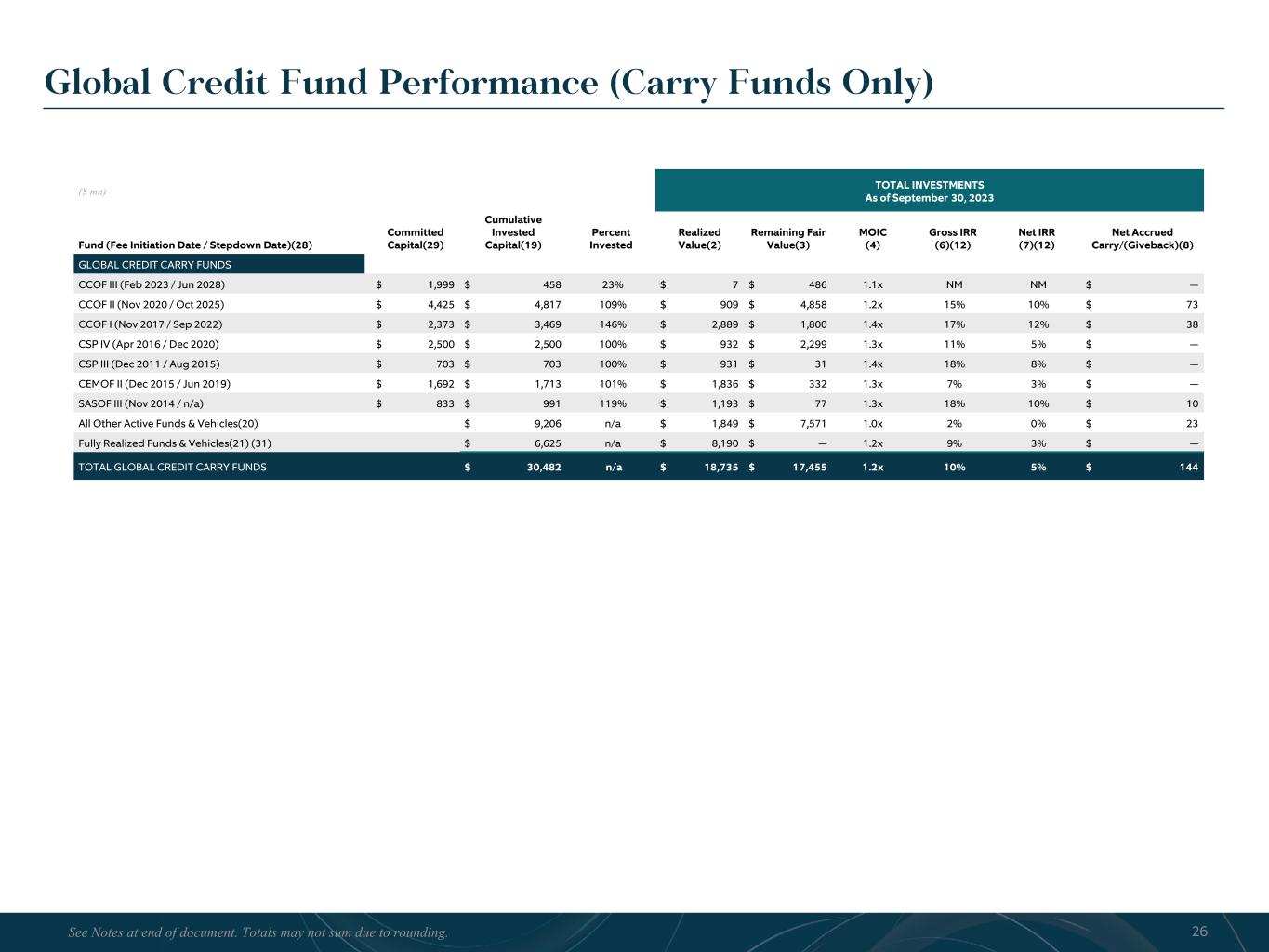 R-14 7 G-19 5 B-19 7 R-88 G-15 9 B-16 5 R-13 6 G-18 0 B-83 R-16 3 G-14 3 B-18 7 R-0 G-74 B-13 6 R-18 5 G-21 1 B-15 3 R-11 8 G-92 B-15 0 R-22 0 G-22 1 B-23 2 R-14 0 G-14 1 B-15 2R-12 0 G-16 9 B-22 2 Old Colors R-88 G-89 B-91 58595B R-23 G-234 B-234 EAEAEA R-208 G-232 B-247 D0E8F7 R-65 G-64 B-66 414042 R-8 G-51 B-94 08335E R-167 G-169 B-171 A7A9AB R-9 G-102 B-112 096670 R-220 G-221 B-222 DCDDDE R-97 G-161 B-224 61A1E0 R-237 G-217 B-157 EDD99D R-147 G-195 B-197 93C3C5 Global Credit Fund Performance (Carry Funds Only) ($ mn) TOTAL INVESTMENTS As of September 30, 2023 Fund (Fee Initiation Date / Stepdown Date)(28) Committed Capital(29) Cumulative Invested Capital(19) Percent Invested Realized Value(2) Remaining Fair Value(3) MOIC (4) Gross IRR (6)(12) Net IRR (7)(12) Net Accrued Carry/(Giveback)(8) GLOBAL CREDIT CARRY FUNDS CCOF III (Feb 2023 / Jun 2028) $ 1,999 $ 458 23% $ 7 $ 486 1.1x NM NM $ — CCOF II (Nov 2020 / Oct 2025) $ 4,425 $ 4,817 109% $ 909 $ 4,858 1.2x 15% 10% $ 73 CCOF I (Nov 2017 / Sep 2022) $ 2,373 $ 3,469 146% $ 2,889 $ 1,800 1.4x 17% 12% $ 38 CSP IV (Apr 2016 / Dec 2020) $ 2,500 $ 2,500 100% $ 932 $ 2,299 1.3x 11% 5% $ — CSP III (Dec 2011 / Aug 2015) $ 703 $ 703 100% $ 931 $ 31 1.4x 18% 8% $ — CEMOF II (Dec 2015 / Jun 2019) $ 1,692 $ 1,713 101% $ 1,836 $ 332 1.3x 7% 3% $ — SASOF III (Nov 2014 / n/a) $ 833 $ 991 119% $ 1,193 $ 77 1.3x 18% 10% $ 10 All Other Active Funds & Vehicles(20) $ 9,206 n/a $ 1,849 $ 7,571 1.0x 2% 0% $ 23 Fully Realized Funds & Vehicles(21) (31) $ 6,625 n/a $ 8,190 $ — 1.2x 9% 3% $ — TOTAL GLOBAL CREDIT CARRY FUNDS $ 30,482 n/a $ 18,735 $ 17,455 1.2x 10% 5% $ 144 26See Notes at end of document. Totals may not sum due to rounding.