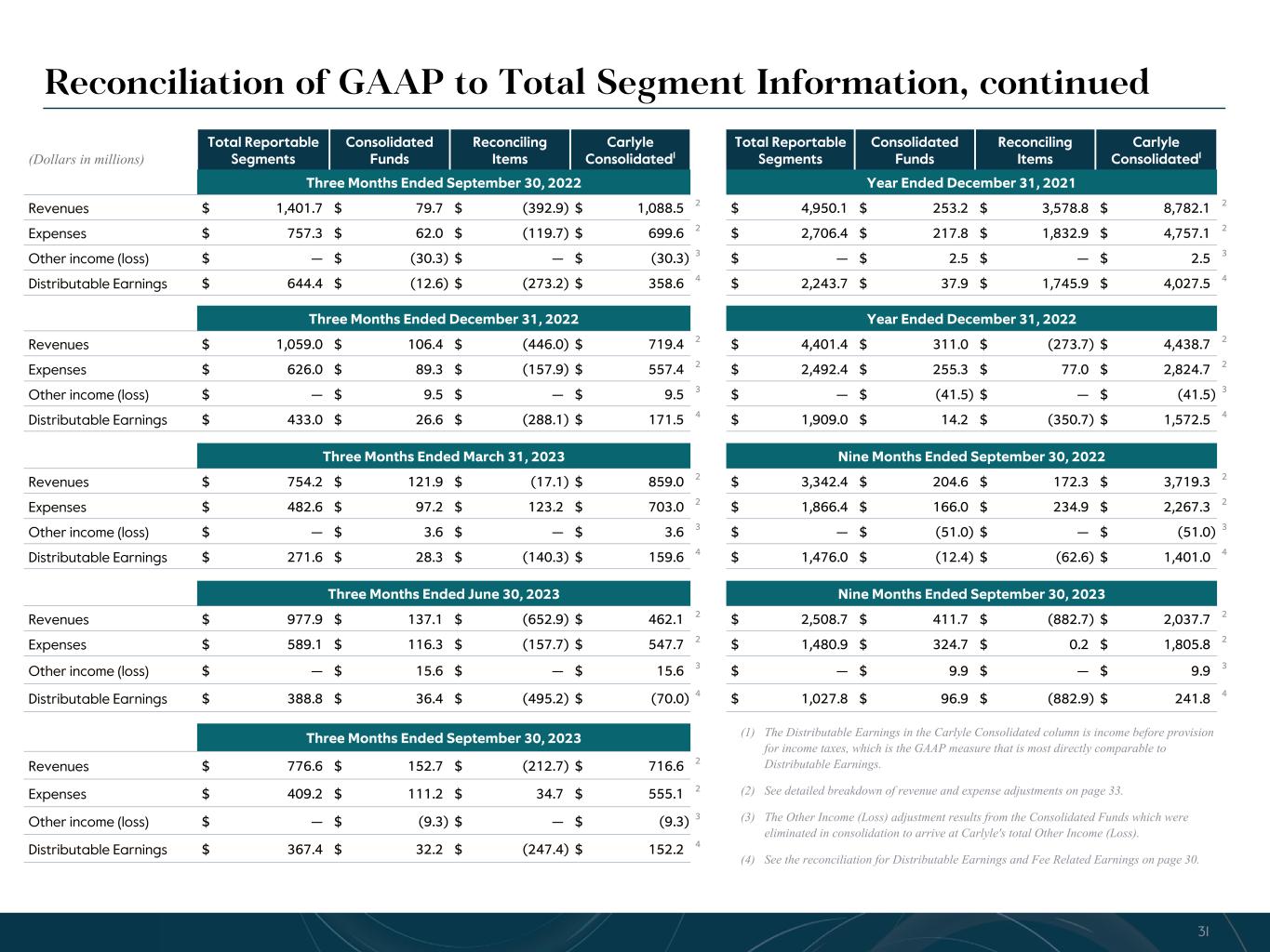 R-14 7 G-19 5 B-19 7 R-88 G-15 9 B-16 5 R-13 6 G-18 0 B-83 R-16 3 G-14 3 B-18 7 R-0 G-74 B-13 6 R-18 5 G-21 1 B-15 3 R-11 8 G-92 B-15 0 R-22 0 G-22 1 B-23 2 R-14 0 G-14 1 B-15 2R-12 0 G-16 9 B-22 2 Old Colors R-88 G-89 B-91 58595B R-23 G-234 B-234 EAEAEA R-208 G-232 B-247 D0E8F7 R-65 G-64 B-66 414042 R-8 G-51 B-94 08335E R-167 G-169 B-171 A7A9AB R-9 G-102 B-112 096670 R-220 G-221 B-222 DCDDDE R-97 G-161 B-224 61A1E0 R-237 G-217 B-157 EDD99D R-147 G-195 B-197 93C3C5 (Dollars in millions) Total Reportable Segments Consolidated Funds Reconciling Items Carlyle Consolidated1 Total Reportable Segments Consolidated Funds Reconciling Items Carlyle Consolidated1 Three Months Ended September 30, 2022 Year Ended December 31, 2021 Revenues $ 1,401.7 $ 79.7 $ (392.9) $ 1,088.5 2 $ 4,950.1 $ 253.2 $ 3,578.8 $ 8,782.1 2 Expenses $ 757.3 $ 62.0 $ (119.7) $ 699.6 2 $ 2,706.4 $ 217.8 $ 1,832.9 $ 4,757.1 2 Other income (loss) $ — $ (30.3) $ — $ (30.3) 3 $ — $ 2.5 $ — $ 2.5 3 Distributable Earnings $ 644.4 $ (12.6) $ (273.2) $ 358.6 4 $ 2,243.7 $ 37.9 $ 1,745.9 $ 4,027.5 4 Three Months Ended December 31, 2022 Year Ended December 31, 2022 Revenues $ 1,059.0 $ 106.4 $ (446.0) $ 719.4 2 $ 4,401.4 $ 311.0 $ (273.7) $ 4,438.7 2 Expenses $ 626.0 $ 89.3 $ (157.9) $ 557.4 2 $ 2,492.4 $ 255.3 $ 77.0 $ 2,824.7 2 Other income (loss) $ — $ 9.5 $ — $ 9.5 3 $ — $ (41.5) $ — $ (41.5) 3 Distributable Earnings $ 433.0 $ 26.6 $ (288.1) $ 171.5 4 $ 1,909.0 $ 14.2 $ (350.7) $ 1,572.5 4 Three Months Ended March 31, 2023 Nine Months Ended September 30, 2022 Revenues $ 754.2 $ 121.9 $ (17.1) $ 859.0 2 $ 3,342.4 $ 204.6 $ 172.3 $ 3,719.3 2 Expenses $ 482.6 $ 97.2 $ 123.2 $ 703.0 2 $ 1,866.4 $ 166.0 $ 234.9 $ 2,267.3 2 Other income (loss) $ — $ 3.6 $ — $ 3.6 3 $ — $ (51.0) $ — $ (51.0) 3 Distributable Earnings $ 271.6 $ 28.3 $ (140.3) $ 159.6 4 $ 1,476.0 $ (12.4) $ (62.6) $ 1,401.0 4 Three Months Ended June 30, 2023 Nine Months Ended September 30, 2023 Revenues $ 977.9 $ 137.1 $ (652.9) $ 462.1 2 $ 2,508.7 $ 411.7 $ (882.7) $ 2,037.7 2 Expenses $ 589.1 $ 116.3 $ (157.7) $ 547.7 2 $ 1,480.9 $ 324.7 $ 0.2 $ 1,805.8 2 Other income (loss) $ — $ 15.6 $ — $ 15.6 3 $ — $ 9.9 $ — $ 9.9 3 Distributable Earnings $ 388.8 $ 36.4 $ (495.2) $ (70.0) 4 $ 1,027.8 $ 96.9 $ (882.9) $ 241.8 4 Three Months Ended September 30, 2023 Revenues $ 776.6 $ 152.7 $ (212.7) $ 716.6 2 Expenses $ 409.2 $ 111.2 $ 34.7 $ 555.1 2 Other income (loss) $ — $ (9.3) $ — $ (9.3) 3 Distributable Earnings $ 367.4 $ 32.2 $ (247.4) $ 152.2 4 Reconciliation of GAAP to Total Segment Information, continued (1) The Distributable Earnings in the Carlyle Consolidated column is income before provision for income taxes, which is the GAAP measure that is most directly comparable to Distributable Earnings. (2) See detailed breakdown of revenue and expense adjustments on page 33. (3) The Other Income (Loss) adjustment results from the Consolidated Funds which were eliminated in consolidation to arrive at Carlyle's total Other Income (Loss). (4) See the reconciliation for Distributable Earnings and Fee Related Earnings on page 30. 31