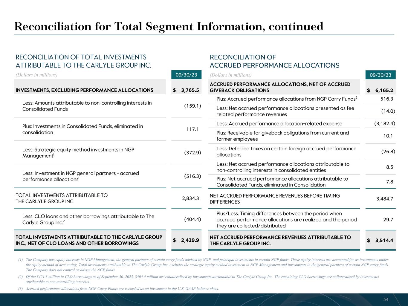 R-14 7 G-19 5 B-19 7 R-88 G-15 9 B-16 5 R-13 6 G-18 0 B-83 R-16 3 G-14 3 B-18 7 R-0 G-74 B-13 6 R-18 5 G-21 1 B-15 3 R-11 8 G-92 B-15 0 R-22 0 G-22 1 B-23 2 R-14 0 G-14 1 B-15 2R-12 0 G-16 9 B-22 2 Old Colors R-88 G-89 B-91 58595B R-23 G-234 B-234 EAEAEA R-208 G-232 B-247 D0E8F7 R-65 G-64 B-66 414042 R-8 G-51 B-94 08335E R-167 G-169 B-171 A7A9AB R-9 G-102 B-112 096670 R-220 G-221 B-222 DCDDDE R-97 G-161 B-224 61A1E0 R-237 G-217 B-157 EDD99D R-147 G-195 B-197 93C3C5 Reconciliation for Total Segment Information, continued (1) The Company has equity interests in NGP Management, the general partners of certain carry funds advised by NGP, and principal investments in certain NGP funds. These equity interests are accounted for as investments under the equity method of accounting. Total investments attributable to The Carlyle Group Inc. excludes the strategic equity method investment in NGP Management and investments in the general partners of certain NGP carry funds. The Company does not control or advise the NGP funds. (2) Of the $421.3 million in CLO borrowings as of September 30, 2023, $404.4 million are collateralized by investments attributable to The Carlyle Group Inc. The remaining CLO borrowings are collateralized by investments attributable to non-controlling interests. (3) Accrued performance allocations from NGP Carry Funds are recorded as an investment in the U.S. GAAP balance sheet. RECONCILIATION OF TOTAL INVESTMENTS ATTRIBUTABLE TO THE CARLYLE GROUP INC. (Dollars in millions) 09/30/23 INVESTMENTS, EXCLUDING PERFORMANCE ALLOCATIONS $ 3,765.5 Less: Amounts attributable to non-controlling interests in Consolidated Funds (159.1) Plus: Investments in Consolidated Funds, eliminated in consolidation 117.1 Less: Strategic equity method investments in NGP Management1 (372.9) Less: Investment in NGP general partners - accrued performance allocations1 (516.3) TOTAL INVESTMENTS ATTRIBUTABLE TO THE CARLYLE GROUP INC. 2,834.3 Less: CLO loans and other borrowings attributable to The Carlyle Group Inc.2 (404.4) TOTAL INVESTMENTS ATTRIBUTABLE TO THE CARLYLE GROUP INC., NET OF CLO LOANS AND OTHER BORROWINGS $ 2,429.9 RECONCILIATION OF ACCRUED PERFORMANCE ALLOCATIONS (Dollars in millions) 09/30/23 ACCRUED PERFORMANCE ALLOCATIONS, NET OF ACCRUED GIVEBACK OBLIGATIONS $ 6,165.2 Plus: Accrued performance allocations from NGP Carry Funds3 516.3 Less: Net accrued performance allocations presented as fee related performance revenues (14.0) Less: Accrued performance allocation-related expense (3,182.4) Plus: Receivable for giveback obligations from current and former employees 10.1 Less: Deferred taxes on certain foreign accrued performance allocations (26.8) Less: Net accrued performance allocations attributable to non-controlling interests in consolidated entities 8.5 Plus: Net accrued performance allocations attributable to Consolidated Funds, eliminated in Consolidation 7.8 NET ACCRUED PERFORMANCE REVENUES BEFORE TIMING DIFFERENCES 3,484.7 Plus/Less: Timing differences between the period when accrued performance allocations are realized and the period they are collected/distributed 29.7 NET ACCRUED PERFORMANCE REVENUES ATTRIBUTABLE TO THE CARLYLE GROUP INC. $ 3,514.4 34
