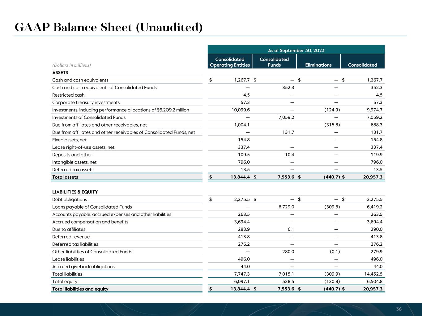 R-14 7 G-19 5 B-19 7 R-88 G-15 9 B-16 5 R-13 6 G-18 0 B-83 R-16 3 G-14 3 B-18 7 R-0 G-74 B-13 6 R-18 5 G-21 1 B-15 3 R-11 8 G-92 B-15 0 R-22 0 G-22 1 B-23 2 R-14 0 G-14 1 B-15 2R-12 0 G-16 9 B-22 2 Old Colors R-88 G-89 B-91 58595B R-23 G-234 B-234 EAEAEA R-208 G-232 B-247 D0E8F7 R-65 G-64 B-66 414042 R-8 G-51 B-94 08335E R-167 G-169 B-171 A7A9AB R-9 G-102 B-112 096670 R-220 G-221 B-222 DCDDDE R-97 G-161 B-224 61A1E0 R-237 G-217 B-157 EDD99D R-147 G-195 B-197 93C3C5 As of September 30, 2023 (Dollars in millions) Consolidated Operating Entities Consolidated Funds Eliminations Consolidated ASSETS Cash and cash equivalents $ 1,267.7 $ — $ — $ 1,267.7 Cash and cash equivalents of Consolidated Funds — 352.3 — 352.3 Restricted cash 4.5 — — 4.5 Corporate treasury investments 57.3 — — 57.3 Investments, including performance allocations of $6,209.2 million 10,099.6 — (124.9) 9,974.7 Investments of Consolidated Funds — 7,059.2 — 7,059.2 Due from affiliates and other receivables, net 1,004.1 — (315.8) 688.3 Due from affiliates and other receivables of Consolidated Funds, net — 131.7 — 131.7 Fixed assets, net 154.8 — — 154.8 Lease right-of-use assets, net 337.4 — — 337.4 Deposits and other 109.5 10.4 — 119.9 Intangible assets, net 796.0 — — 796.0 Deferred tax assets 13.5 — — 13.5 Total assets $ 13,844.4 $ 7,553.6 $ (440.7) $ 20,957.3 LIABILITIES & EQUITY Debt obligations $ 2,275.5 $ — $ — $ 2,275.5 Loans payable of Consolidated Funds — 6,729.0 (309.8) 6,419.2 Accounts payable, accrued expenses and other liabilities 263.5 — — 263.5 Accrued compensation and benefits 3,694.4 — — 3,694.4 Due to affiliates 283.9 6.1 — 290.0 Deferred revenue 413.8 — — 413.8 Deferred tax liabilities 276.2 — — 276.2 Other liabilities of Consolidated Funds — 280.0 (0.1) 279.9 Lease liabilities 496.0 — — 496.0 Accrued giveback obligations 44.0 — — 44.0 Total liabilities 7,747.3 7,015.1 (309.9) 14,452.5 Total equity 6,097.1 538.5 (130.8) 6,504.8 Total liabilities and equity $ 13,844.4 $ 7,553.6 $ (440.7) $ 20,957.3 GAAP Balance Sheet (Unaudited) 36