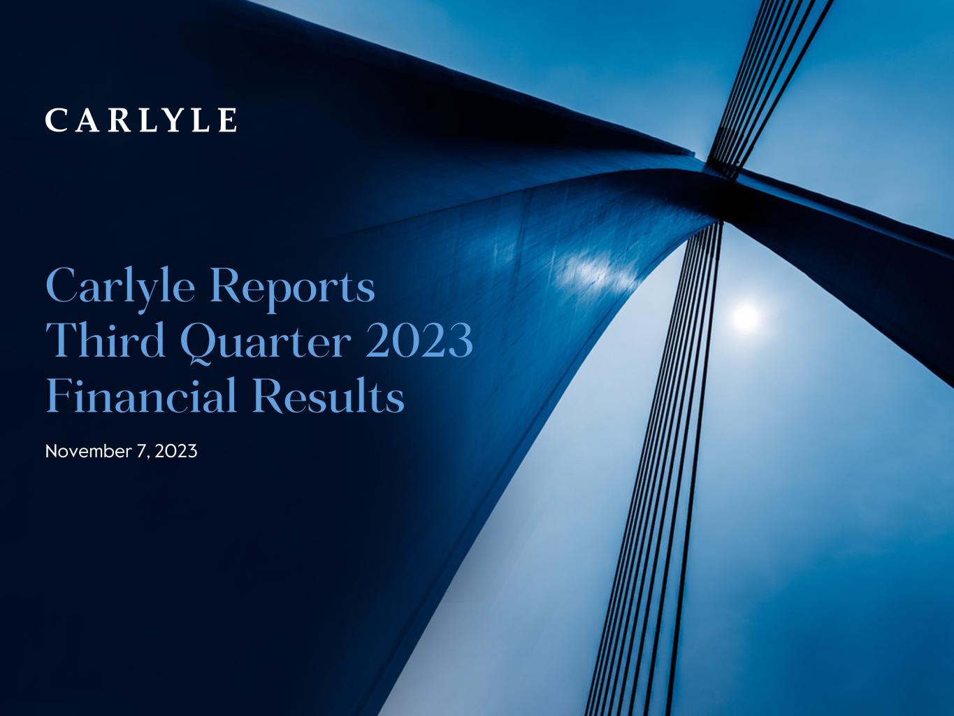 Carlyle Reports Third Quarter 2023 Financial Results NEW YORK AND WASHINGTON – November 7, 2023 – Global investment firm The Carlyle Group Inc. (NASDAQ: CG) today reported its unaudited results for the third quarter ended September 30, 2023. Dividend The Board of Directors has declared a quarterly dividend of $0.35 per common share to holders of record at the close of business on November 21, 2023, payable on November 29, 2023. Conference Call Carlyle will host a conference call at 8:30 a.m. EST on Tuesday, November 7, 2023, to discuss its third quarter financial results. The call will be available via public webcast from the Shareholders section of Carlyle's website at www.carlyle.com and a replay will be available on our website soon after the call’s completion. About Carlyle Carlyle (NASDAQ: CG) is a global investment firm with deep industry expertise that deploys private capital across its business and conducts its operations through three business segments: Global Private Equity, Global Credit and Global Investment Solutions. With $382 billion of assets under management as of September 30, 2023, Carlyle’s purpose is to invest wisely and create value on behalf of its investors, portfolio companies and the communities in which we live and invest. Carlyle employs more than 2,200 people in 28 offices across four continents. Further information is available at www.carlyle.com. Follow Carlyle on X @OneCarlyle. 2 “Our portfolio continues to perform despite an increasingly complex environment, and our global investment teams remain focused on finding opportunities to generate excess alpha. I remain confident that Carlyle is well- positioned to deliver for our investors and shareholders as we build on our momentum and take action to align the firm for growth.” HARVEY M. SCHWARTZ Chief Executive Officer