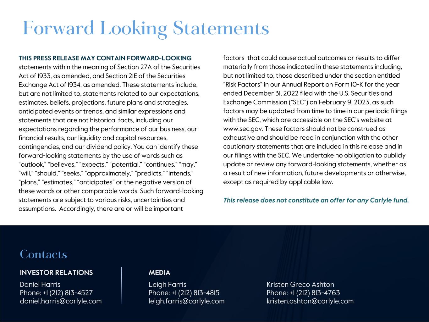 THIS PRESS RELEASE MAY CONTAIN FORWARD-LOOKING statements within the meaning of Section 27A of the Securities Act of 1933, as amended, and Section 21E of the Securities Exchange Act of 1934, as amended. These statements include, but are not limited to, statements related to our expectations, estimates, beliefs, projections, future plans and strategies, anticipated events or trends, and similar expressions and statements that are not historical facts, including our expectations regarding the performance of our business, our financial results, our liquidity and capital resources, contingencies, and our dividend policy. You can identify these forward-looking statements by the use of words such as “outlook,” “believes,” “expects,” “potential,” “continues,” “may,” “will,” “should,” “seeks,” “approximately,” “predicts,” “intends,” “plans,” “estimates,” “anticipates” or the negative version of these words or other comparable words. Such forward-looking statements are subject to various risks, uncertainties and assumptions. Accordingly, there are or will be important Forward Looking Statements factors that could cause actual outcomes or results to differ materially from those indicated in these statements including, but not limited to, those described under the section entitled “Risk Factors” in our Annual Report on Form 10-K for the year ended December 31, 2022 filed with the U.S. Securities and Exchange Commission (“SEC”) on February 9, 2023, as such factors may be updated from time to time in our periodic filings with the SEC, which are accessible on the SEC’s website at www.sec.gov. These factors should not be construed as exhaustive and should be read in conjunction with the other cautionary statements that are included in this release and in our filings with the SEC. We undertake no obligation to publicly update or review any forward-looking statements, whether as a result of new information, future developments or otherwise, except as required by applicable law. This release does not constitute an offer for any Carlyle fund. Contacts INVESTOR RELATIONS MEDIA Daniel Harris Leigh Farris Kristen Greco Ashton Phone: +1 (212) 813-4527 Phone: +1 (212) 813-4815 Phone: +1 (212) 813-4763 daniel.harris@carlyle.com leigh.farris@carlyle.com kristen.ashton@carlyle.com