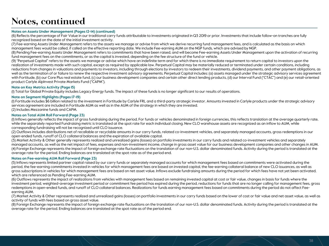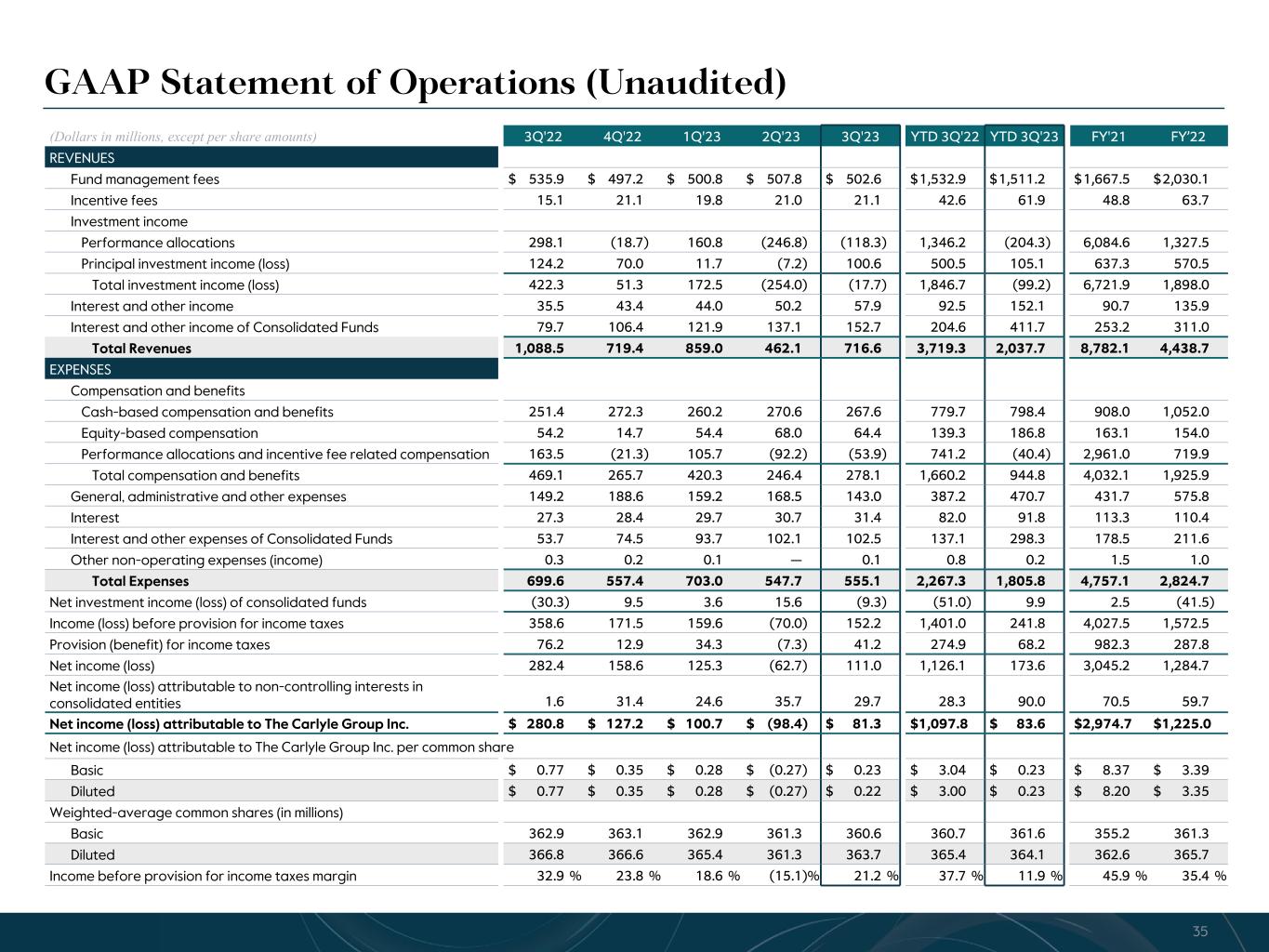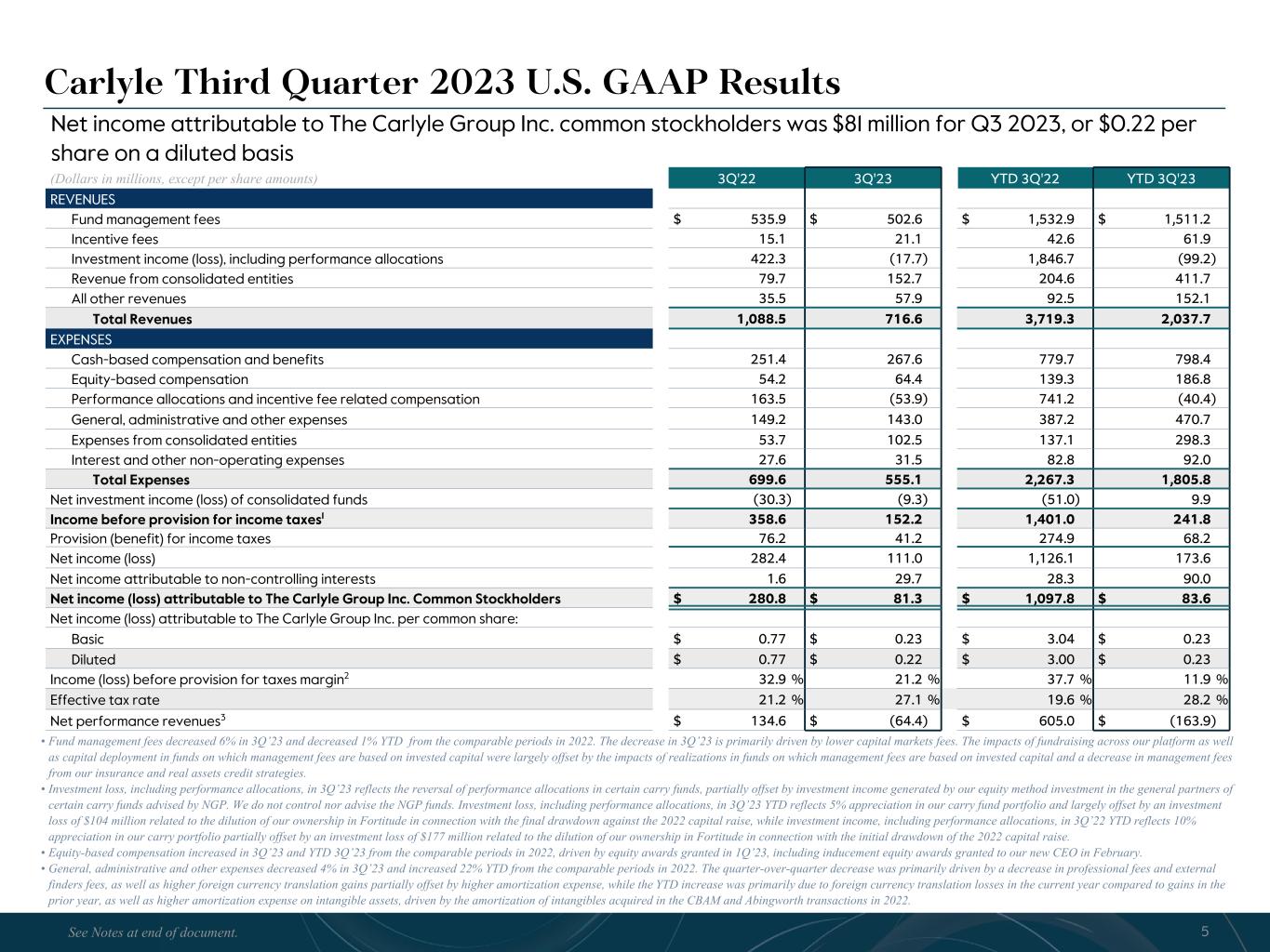 R-14 7 G-19 5 B-19 7 R-88 G-15 9 B-16 5 R-13 6 G-18 0 B-83 R-16 3 G-14 3 B-18 7 R-0 G-74 B-13 6 R-18 5 G-21 1 B-15 3 R-11 8 G-92 B-15 0 R-22 0 G-22 1 B-23 2 R-14 0 G-14 1 B-15 2R-12 0 G-16 9 B-22 2 Old Colors R-88 G-89 B-91 58595B R-23 G-234 B-234 EAEAEA R-208 G-232 B-247 D0E8F7 R-65 G-64 B-66 414042 R-8 G-51 B-94 08335E R-167 G-169 B-171 A7A9AB R-9 G-102 B-112 096670 R-220 G-221 B-222 DCDDDE R-97 G-161 B-224 61A1E0 R-237 G-217 B-157 EDD99D R-147 G-195 B-197 93C3C5 • Fund management fees decreased 6% in 3Q’23 and decreased 1% YTD from the comparable periods in 2022. The decrease in 3Q’23 is primarily driven by lower capital markets fees. The impacts of fundraising across our platform as well as capital deployment in funds on which management fees are based on invested capital were largely offset by the impacts of realizations in funds on which management fees are based on invested capital and a decrease in management fees from our insurance and real assets credit strategies. • Investment loss, including performance allocations, in 3Q’23 reflects the reversal of performance allocations in certain carry funds, partially offset by investment income generated by our equity method investment in the general partners of certain carry funds advised by NGP. We do not control nor advise the NGP funds. Investment loss, including performance allocations, in 3Q’23 YTD reflects 5% appreciation in our carry fund portfolio and largely offset by an investment loss of $104 million related to the dilution of our ownership in Fortitude in connection with the final drawdown against the 2022 capital raise, while investment income, including performance allocations, in 3Q’22 YTD reflects 10% appreciation in our carry portfolio partially offset by an investment loss of $177 million related to the dilution of our ownership in Fortitude in connection with the initial drawdown of the 2022 capital raise. • Equity-based compensation increased in 3Q’23 and YTD 3Q’23 from the comparable periods in 2022, driven by equity awards granted in 1Q’23, including inducement equity awards granted to our new CEO in February. • General, administrative and other expenses decreased 4% in 3Q’23 and increased 22% YTD from the comparable periods in 2022. The quarter-over-quarter decrease was primarily driven by a decrease in professional fees and external finders fees, as well as higher foreign currency translation gains partially offset by higher amortization expense, while the YTD increase was primarily due to foreign currency translation losses in the current year compared to gains in the prior year, as well as higher amortization expense on intangible assets, driven by the amortization of intangibles acquired in the CBAM and Abingworth transactions in 2022. (Dollars in millions, except per share amounts) 3Q'22 3Q'23 YTD 3Q'22 YTD 3Q'23 REVENUES Fund management fees $ 535.9 $ 502.6 $ 1,532.9 $ 1,511.2 Incentive fees 15.1 21.1 42.6 61.9 Investment income (loss), including performance allocations 422.3 (17.7) 1,846.7 (99.2) Revenue from consolidated entities 79.7 152.7 204.6 411.7 All other revenues 35.5 57.9 92.5 152.1 Total Revenues 1,088.5 716.6 3,719.3 2,037.7 EXPENSES Cash-based compensation and benefits 251.4 267.6 779.7 798.4 Equity-based compensation 54.2 64.4 139.3 186.8 Performance allocations and incentive fee related compensation 163.5 (53.9) 741.2 (40.4) General, administrative and other expenses 149.2 143.0 387.2 470.7 Expenses from consolidated entities 53.7 102.5 137.1 298.3 Interest and other non-operating expenses 27.6 31.5 82.8 92.0 Total Expenses 699.6 555.1 2,267.3 1,805.8 Net investment income (loss) of consolidated funds (30.3) (9.3) (51.0) 9.9 Income before provision for income taxes1 358.6 152.2 1,401.0 241.8 Provision (benefit) for income taxes 76.2 41.2 274.9 68.2 Net income (loss) 282.4 111.0 1,126.1 173.6 Net income attributable to non-controlling interests 1.6 29.7 28.3 90.0 Net income (loss) attributable to The Carlyle Group Inc. Common Stockholders $ 280.8 $ 81.3 $ 1,097.8 $ 83.6 Net income (loss) attributable to The Carlyle Group Inc. per common share: Basic $ 0.77 $ 0.23 $ 3.04 $ 0.23 Diluted $ 0.77 $ 0.22 $ 3.00 $ 0.23 Income (loss) before provision for taxes margin2 32.9 % 21.2 % 37.7 % 11.9 % Effective tax rate 21.2 % 27.1 % 19.6 % 28.2 % Net performance revenues3 $ 134.6 $ (64.4) $ 605.0 $ (163.9) Carlyle Third Quarter 2023 U.S. GAAP Results Net income attributable to The Carlyle Group Inc. common stockholders was $81 million for Q3 2023, or $0.22 per share on a diluted basis 5See Notes at end of document.