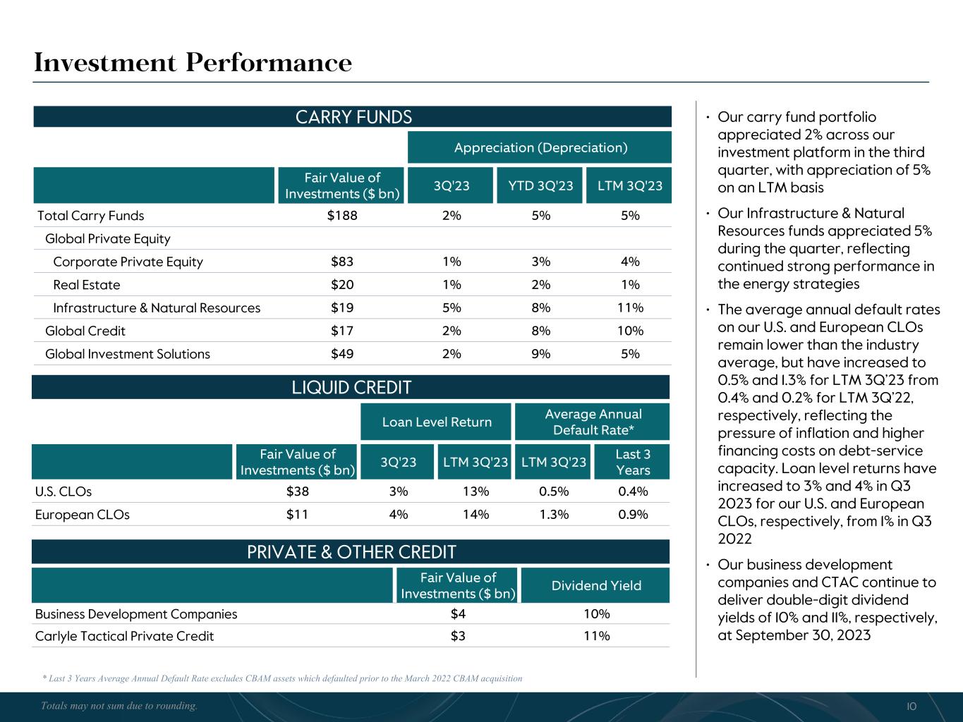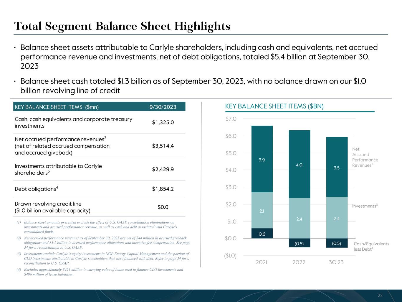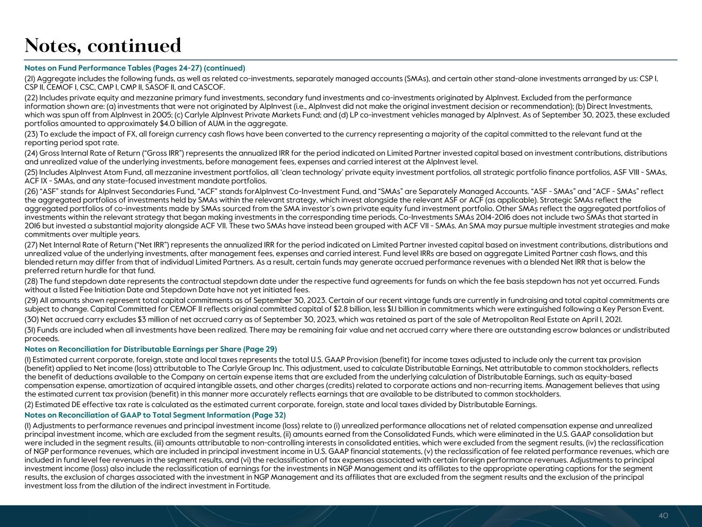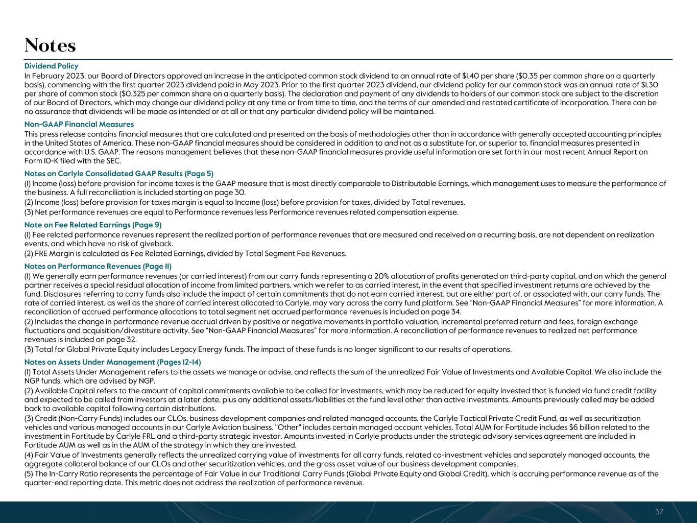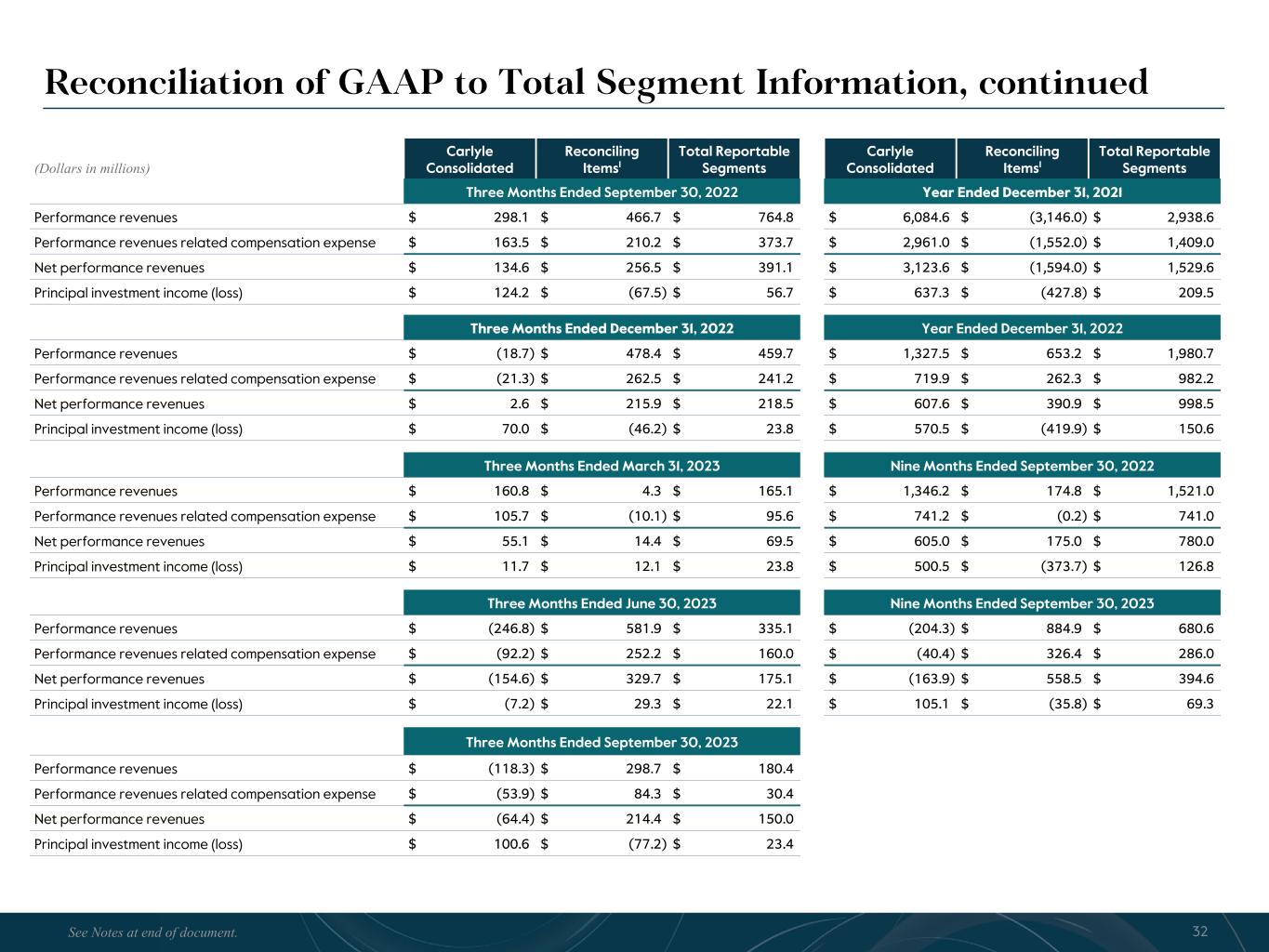 R-14 7 G-19 5 B-19 7 R-88 G-15 9 B-16 5 R-13 6 G-18 0 B-83 R-16 3 G-14 3 B-18 7 R-0 G-74 B-13 6 R-18 5 G-21 1 B-15 3 R-11 8 G-92 B-15 0 R-22 0 G-22 1 B-23 2 R-14 0 G-14 1 B-15 2R-12 0 G-16 9 B-22 2 Old Colors R-88 G-89 B-91 58595B R-23 G-234 B-234 EAEAEA R-208 G-232 B-247 D0E8F7 R-65 G-64 B-66 414042 R-8 G-51 B-94 08335E R-167 G-169 B-171 A7A9AB R-9 G-102 B-112 096670 R-220 G-221 B-222 DCDDDE R-97 G-161 B-224 61A1E0 R-237 G-217 B-157 EDD99D R-147 G-195 B-197 93C3C5 (1) Fee related performance revenues are the realized portion of performance revenues that are measured and received on a recurring basis, are not dependent on the disposition of investments, and which are not at risk of giveback. The related compensation expense is included in cash-based compensation and benefits. (2) Total Segment compensation and benefits exclude equity-based compensation, detailed below and as shown on page 30. The equity-based compensation below also include amounts reflected in (i) principal investment income and (ii) general, administration and other expense in our U.S. GAAP statement of operations. (3) A reconciliation of Distributable Earnings to After-tax Distributable Earnings per common share is provided on page 29. (4) The Board of Directors has declared a quarterly dividend of $0.35 per common share to holders of record at the close of business on November 21, 2023, payable on November 29, 2023. See Notes at the end of the document for our Dividend Policy. Carlyle Third Quarter 2023 Total Segment Operating Results (Dollars in millions, except per share amounts) 3Q'22 3Q'23 YTD 3Q'22 YTD 3Q'23 SEGMENT REVENUES Fund management fees $ 514.1 $ 518.1 $ 1,484.5 $ 1,539.3 Transaction and portfolio advisory fees, net and other 35.0 11.2 93.4 45.8 Fee related performance revenues1 20.6 23.4 100.2 125.4 Total segment fee revenues 569.7 552.7 1,678.1 1,710.5 Realized performance revenues 764.8 180.4 1,521.0 680.6 Realized principal investment income 56.7 23.4 126.8 69.3 Interest income 10.5 20.1 16.5 48.3 Total Segment Revenues $ 1,401.7 $ 776.6 $ 3,342.4 $ 2,508.7 SEGMENT EXPENSES Compensation and benefits Cash-based compensation and benefits $ 246.7 $ 256.0 $ 752.2 $ 805.3 Realized performance revenues related compensation 373.7 30.4 741.0 286.0 Total compensation and benefits2 620.4 286.4 1,493.2 1,091.3 General, administrative and other expenses 100.8 81.6 265.0 270.8 Depreciation and amortization expense 9.6 10.4 28.6 29.0 Interest expense 26.5 30.8 79.6 89.8 Total Segment Expenses $ 757.3 $ 409.2 $ 1,866.4 $ 1,480.9 Total Segment Revenues $ 1,401.7 $ 776.6 $ 3,342.4 $ 2,508.7 Total Segment Expenses 757.3 409.2 1,866.4 1,480.9 (=) Distributable Earnings $ 644.4 $ 367.4 $ 1,476.0 $ 1,027.8 (-) Realized Net Performance Revenues 391.1 150.0 780.0 394.6 (-) Realized Principal Investment Income 56.7 23.4 126.8 69.3 (+) Net Interest 16.0 10.7 63.1 41.5 (=) Fee Related Earnings $ 212.6 $ 204.7 $ 632.3 $ 605.4 After-tax Distributable Earnings per common share3 $ 1.42 $ 0.87 $ 3.33 $ 2.38 Dividend per common share4 $ 0.325 $ 0.35 $ 0.975 $ 1.05 Equity-based compensation $ 56.0 $ 67.3 $ 145.0 $ 195.1 7