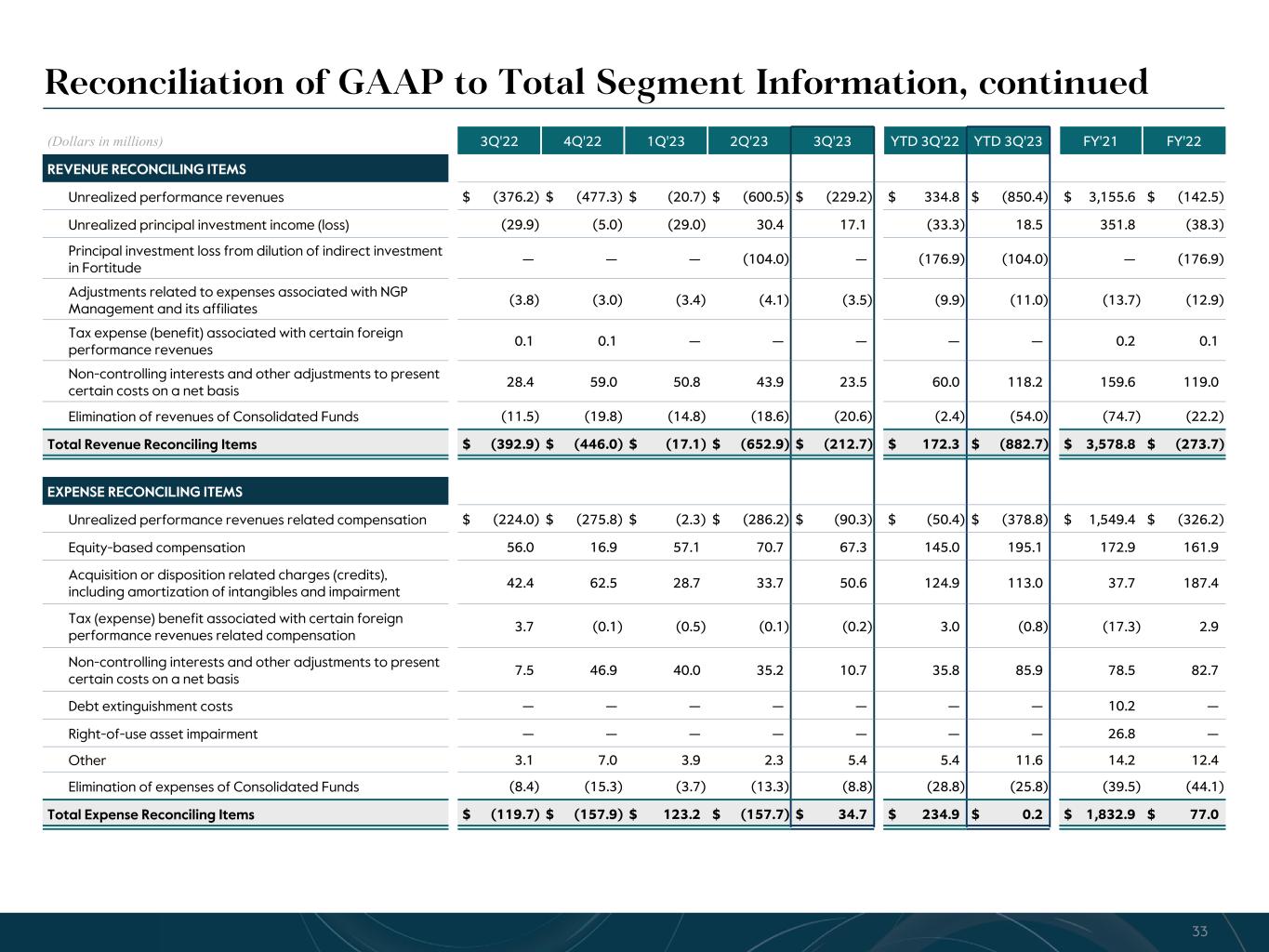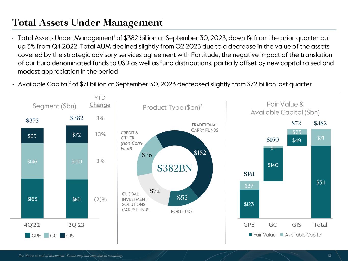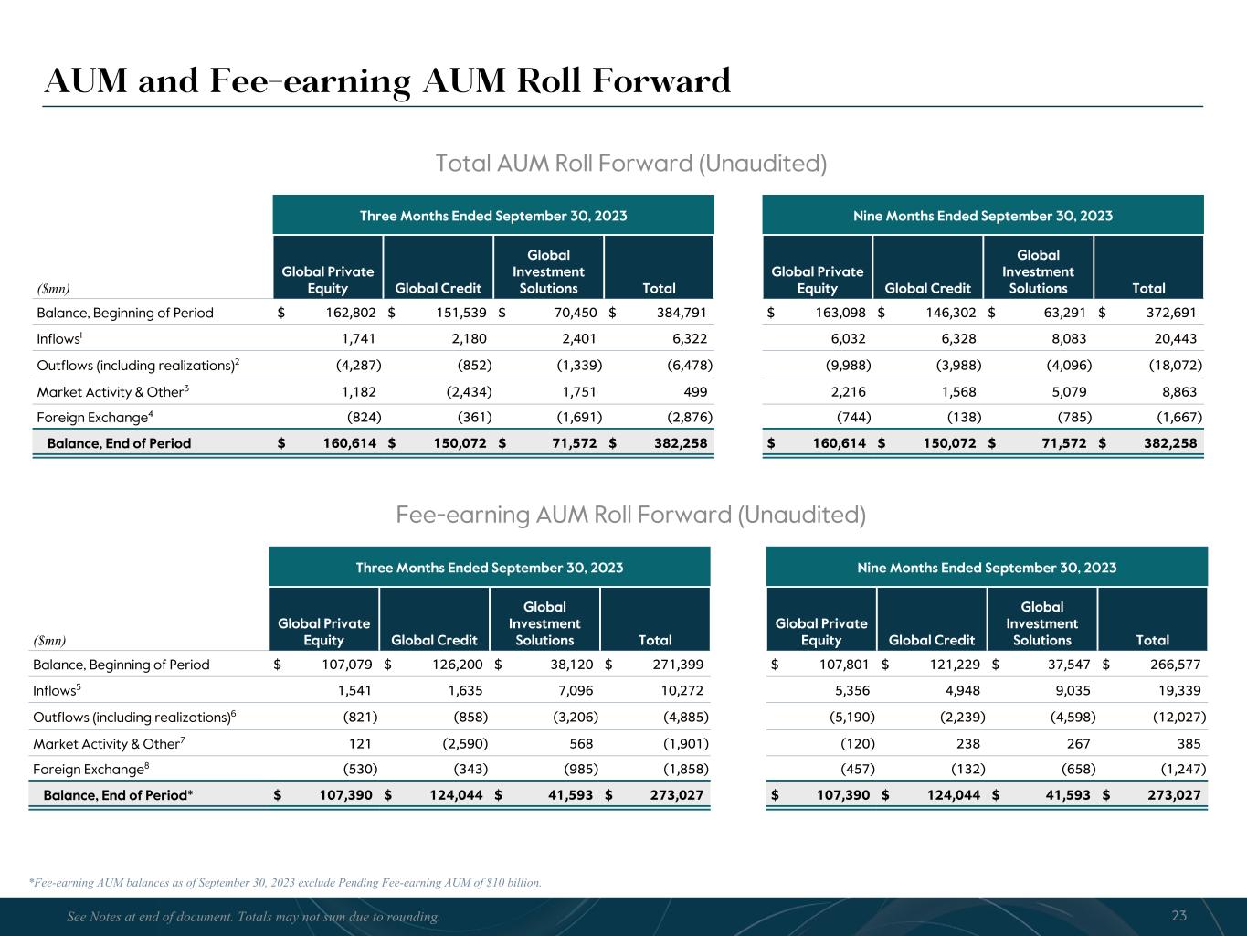 R-14 7 G-19 5 B-19 7 R-88 G-15 9 B-16 5 R-13 6 G-18 0 B-83 R-16 3 G-14 3 B-18 7 R-0 G-74 B-13 6 R-18 5 G-21 1 B-15 3 R-11 8 G-92 B-15 0 R-22 0 G-22 1 B-23 2 R-14 0 G-14 1 B-15 2R-12 0 G-16 9 B-22 2 Old Colors R-88 G-89 B-91 58595B R-23 G-234 B-234 EAEAEA R-208 G-232 B-247 D0E8F7 R-65 G-64 B-66 414042 R-8 G-51 B-94 08335E R-167 G-169 B-171 A7A9AB R-9 G-102 B-112 096670 R-220 G-221 B-222 DCDDDE R-97 G-161 B-224 61A1E0 R-237 G-217 B-157 EDD99D R-147 G-195 B-197 93C3C5 Fee Related Earnings • Fee Related Earnings were $205 million in Q3 2023, a 4% decrease from $213 million in Q3 2022. FRE of $605 million YTD were 4% lower compared to $632 million in the prior YTD period. FRE margin was 37% in Q3 2023, flat to 37% in Q3 2022, and is 35% YTD • Fund management fees of $518 million in Q3 2023 were modestly higher compared to $514 million in Q3 2022. The positive impacts of fundraising and deployment were partially offset by a decrease in fund management fees from our insurance and real assets credit strategies in Q3 2023. Fund management fees of $1.5 billion YTD were $55 million higher compared to the prior YTD period, largely reflecting the impact of the CBAM and Abingworth transactions • Fee related performance revenues1, net of related compensation expense, were $13 million in Q3 2023 compared to $11 million in Q3 2022, with the increase driven by higher fees from our business development companies and CTAC, partially offset by a decrease in fees from our Core Plus real estate strategy (CPI). We expect fee related performance revenues from CPI to remain low in Q4 2023. Fee related performance revenues, net of related compensation expense, were $68 million and $53 million YTD 2023 and 2022, respectively • Transaction and portfolio advisory fees were 68% lower in Q3 2023 and 51% lower YTD relative to the comparable prior year periods due to lower transaction activity • Cash-based compensation & benefits were $256 million in Q3 2023, a $9 million increase from $247 million in Q3 2022, driven by an increase in headcount year-over-year. Cash-based compensation & benefits were $805 million YTD, up 7% from the prior YTD period • General & administrative expenses (G&A) were $82 million in Q3 2023, a 19% decrease from Q3 2022, primarily driven by lower professional fees and fundraising costs. G&A expenses were $271 million YTD, up 2% from the prior YTD period Quarterly Fee Related Earnings ($mn) $213 $202 $193 $207 $205 3Q'22 4Q'22 1Q'23 2Q'23 3Q'23 Fee Related Earnings ($mn) $598 $834 $605 2021 2022 YTD 3Q'23 FRE Margin2 37% 36% 35% 34% 37% 33% 37% 35% 9Totals may not sum due to rounding. See Notes at end of document.