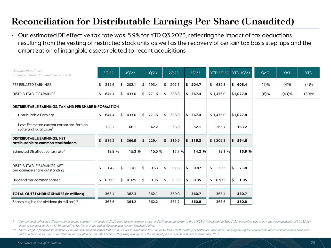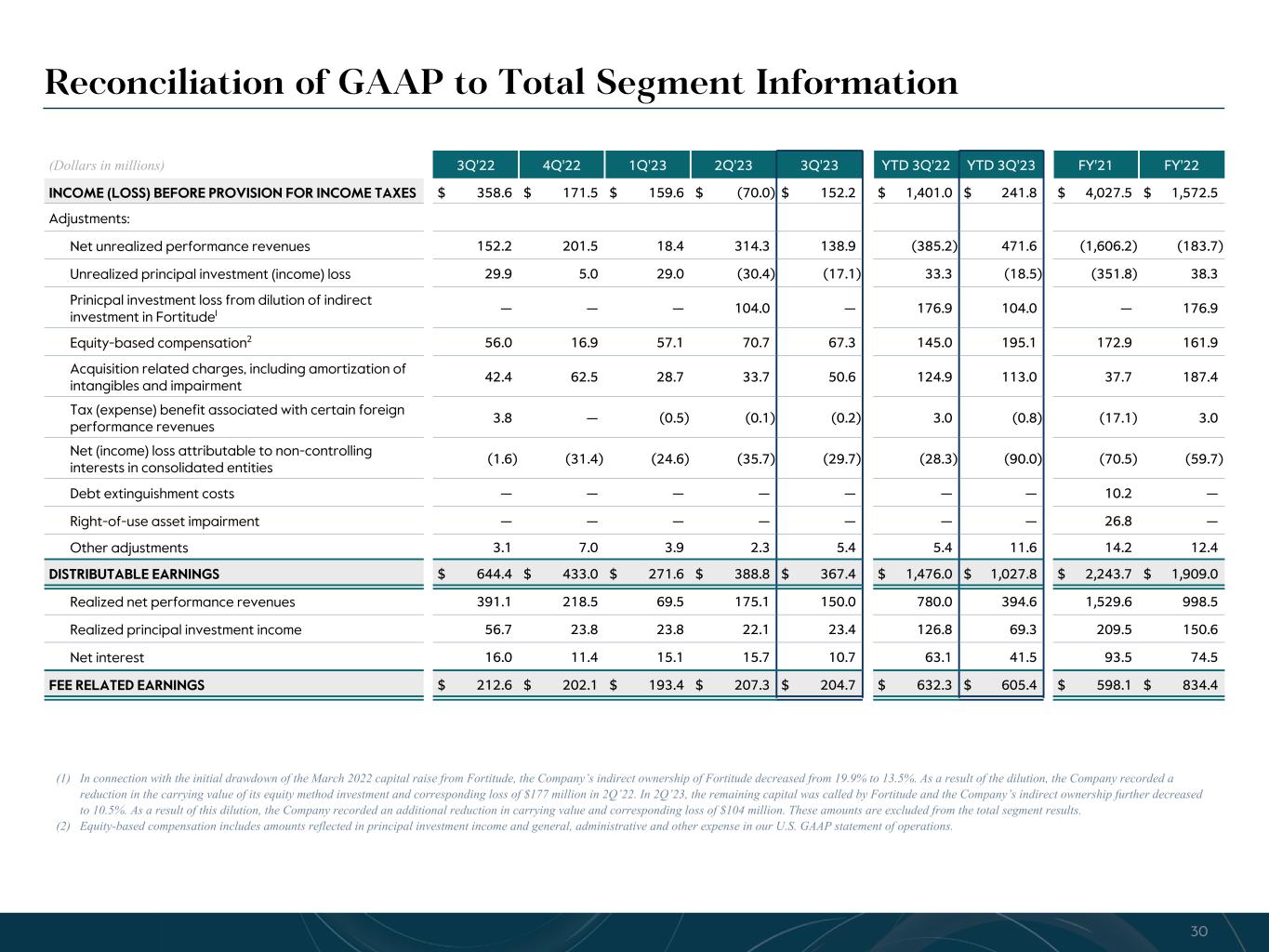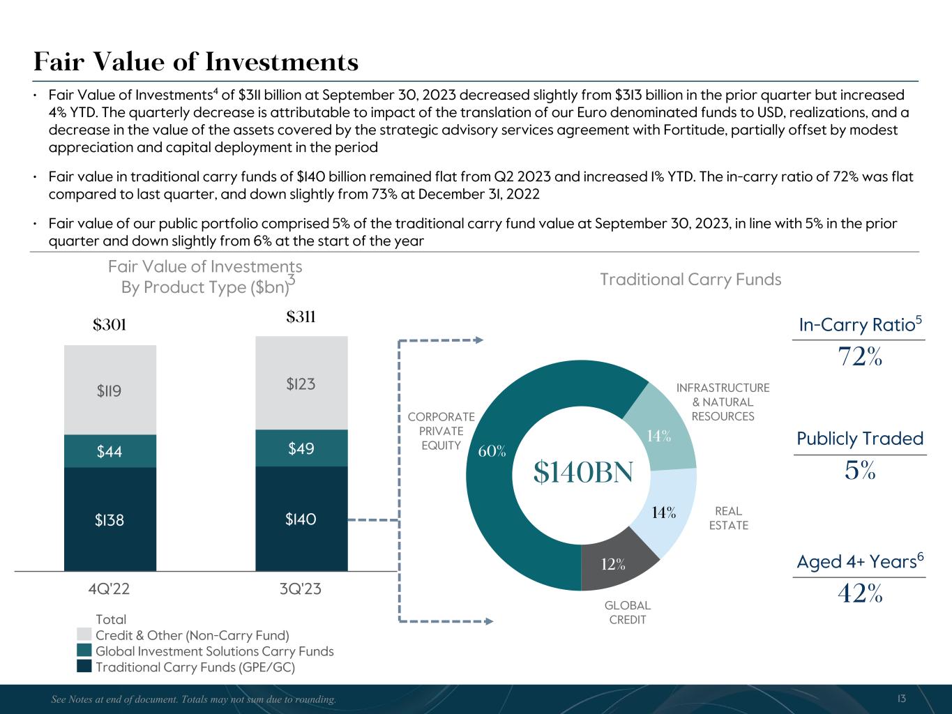 R-14 7 G-19 5 B-19 7 R-88 G-15 9 B-16 5 R-13 6 G-18 0 B-83 R-16 3 G-14 3 B-18 7 R-0 G-74 B-13 6 R-18 5 G-21 1 B-15 3 R-11 8 G-92 B-15 0 R-22 0 G-22 1 B-23 2 R-14 0 G-14 1 B-15 2R-12 0 G-16 9 B-22 2 Old Colors R-88 G-89 B-91 58595B R-23 G-234 B-234 EAEAEA R-208 G-232 B-247 D0E8F7 R-65 G-64 B-66 414042 R-8 G-51 B-94 08335E R-167 G-169 B-171 A7A9AB R-9 G-102 B-112 096670 R-220 G-221 B-222 DCDDDE R-97 G-161 B-224 61A1E0 R-237 G-217 B-157 EDD99D R-147 G-195 B-197 93C3C5 Fee Related Earnings • Fee Related Earnings were $205 million in Q3 2023, a 4% decrease from $213 million in Q3 2022. FRE of $605 million YTD were 4% lower compared to $632 million in the prior YTD period. FRE margin was 37% in Q3 2023, flat to 37% in Q3 2022, and is 35% YTD • Fund management fees of $518 million in Q3 2023 were modestly higher compared to $514 million in Q3 2022. The positive impacts of fundraising and deployment were partially offset by a decrease in fund management fees from our insurance and real assets credit strategies in Q3 2023. Fund management fees of $1.5 billion YTD were $55 million higher compared to the prior YTD period, largely reflecting the impact of the CBAM and Abingworth transactions • Fee related performance revenues1, net of related compensation expense, were $13 million in Q3 2023 compared to $11 million in Q3 2022, with the increase driven by higher fees from our business development companies and CTAC, partially offset by a decrease in fees from our Core Plus real estate strategy (CPI). We expect fee related performance revenues from CPI to remain low in Q4 2023. Fee related performance revenues, net of related compensation expense, were $68 million and $53 million YTD 2023 and 2022, respectively • Transaction and portfolio advisory fees were 68% lower in Q3 2023 and 51% lower YTD relative to the comparable prior year periods due to lower transaction activity • Cash-based compensation & benefits were $256 million in Q3 2023, a $9 million increase from $247 million in Q3 2022, driven by an increase in headcount year-over-year. Cash-based compensation & benefits were $805 million YTD, up 7% from the prior YTD period • General & administrative expenses (G&A) were $82 million in Q3 2023, a 19% decrease from Q3 2022, primarily driven by lower professional fees and fundraising costs. G&A expenses were $271 million YTD, up 2% from the prior YTD period Quarterly Fee Related Earnings ($mn) $213 $202 $193 $207 $205 3Q'22 4Q'22 1Q'23 2Q'23 3Q'23 Fee Related Earnings ($mn) $598 $834 $605 2021 2022 YTD 3Q'23 FRE Margin2 37% 36% 35% 34% 37% 33% 37% 35% 9Totals may not sum due to rounding. See Notes at end of document.