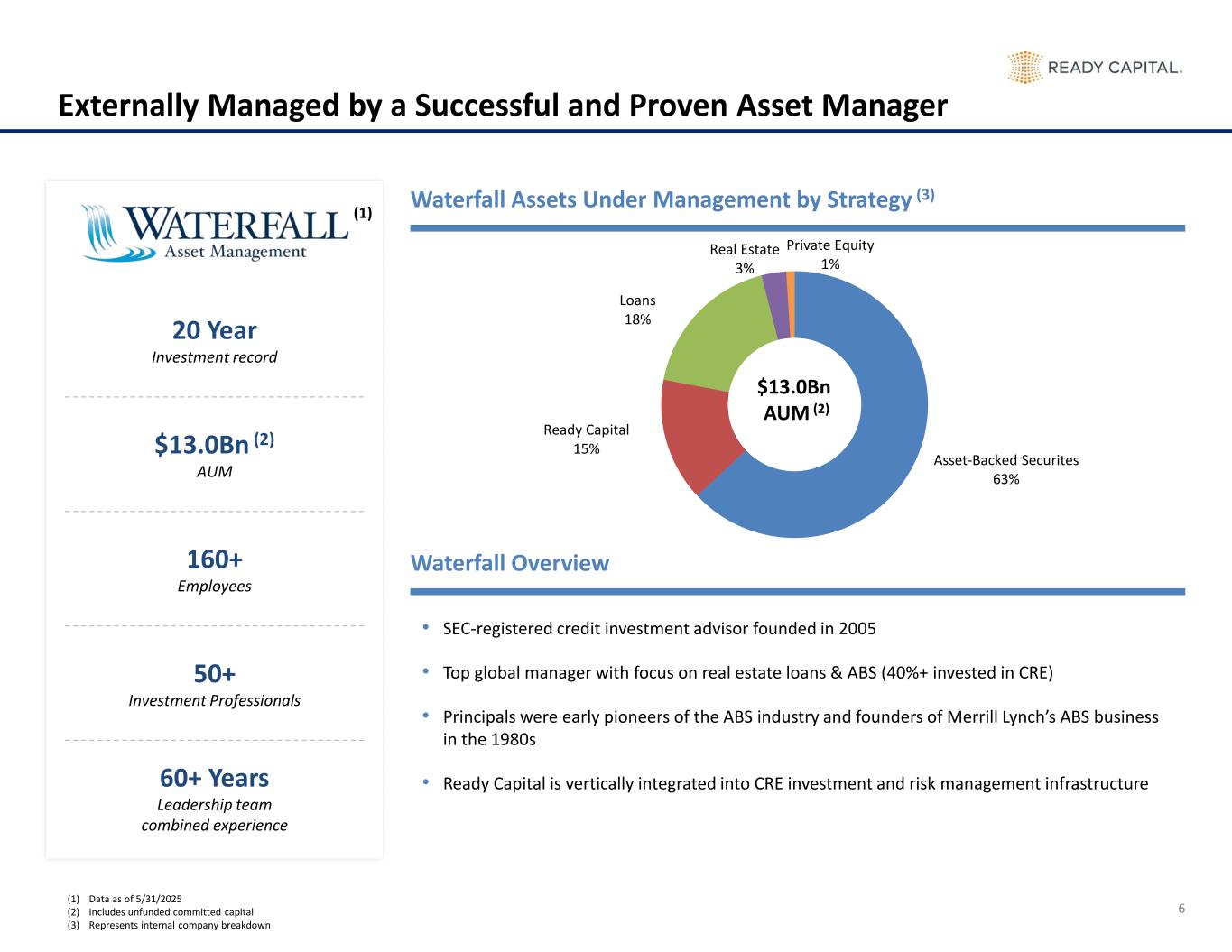 19 Significant Benefits of Relationship with Large Asset Manager5 Ready Capital draws on Waterfall’s 20-year track record in structured credit and real estate finance, enabling disciplined underwriting and sophisticated risk management across its lending platforms Deep Credit Expertise and Structured Finance Capabilities Waterfall’s core strategy is CRE (comprising ~40% of $13.3B gross assets and $88B+ invested over the last 10+ years) whose broad relationships provides Ready Capital with supplemental sourcing of direct originations/secondary acquisitions/leverage counterparties Access to Proprietary Deal Flow and Leverage Waterfall’s 20-year history resolving real estate secured loans provides Ready Capital with a vertically integrated asset management platform, improving loan special servicing and performance monitoring Integrated Asset Management and Servicing Infrastructure Ready Capital benefits from Waterfall’s established operational infrastructure—including servicing, technology, and compliance—which helps streamline execution, reduce overhead, and scale efficiently without building out standalone capabilities Operational Leverage from Shared Infrastructure