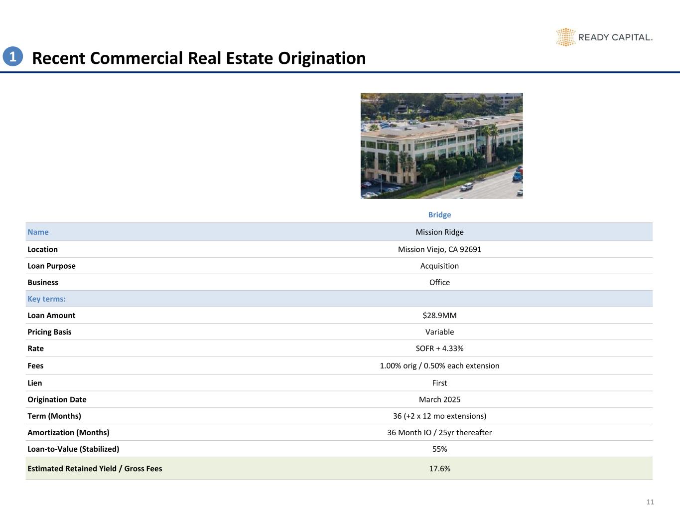 11 Recent Commercial Real Estate Origination Bridge Name Mission Ridge Location Mission Viejo, CA 92691 Loan Purpose Acquisition Business Office Key terms: Loan Amount $28.9MM Pricing Basis Variable Rate SOFR + 4.33% Fees 1.00% orig / 0.50% each extension Lien First Origination Date March 2025 Term (Months) 36 (+2 x 12 mo extensions) Amortization (Months) 36 Month IO / 25yr thereafter Loan-to-Value (Stabilized) 55% Estimated Retained Yield / Gross Fees 17.6% 1