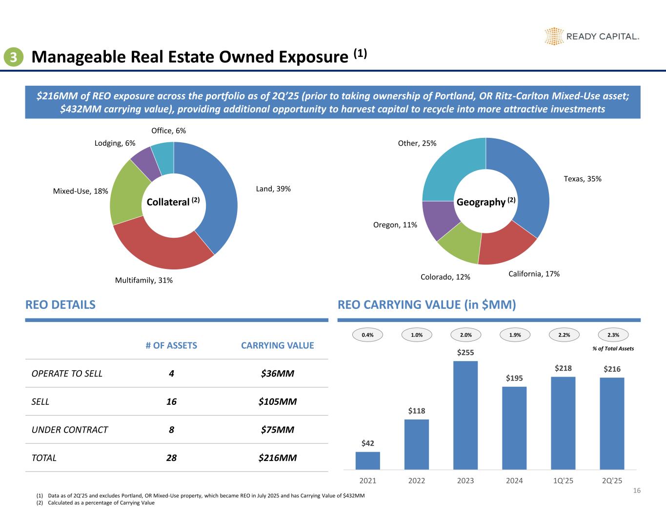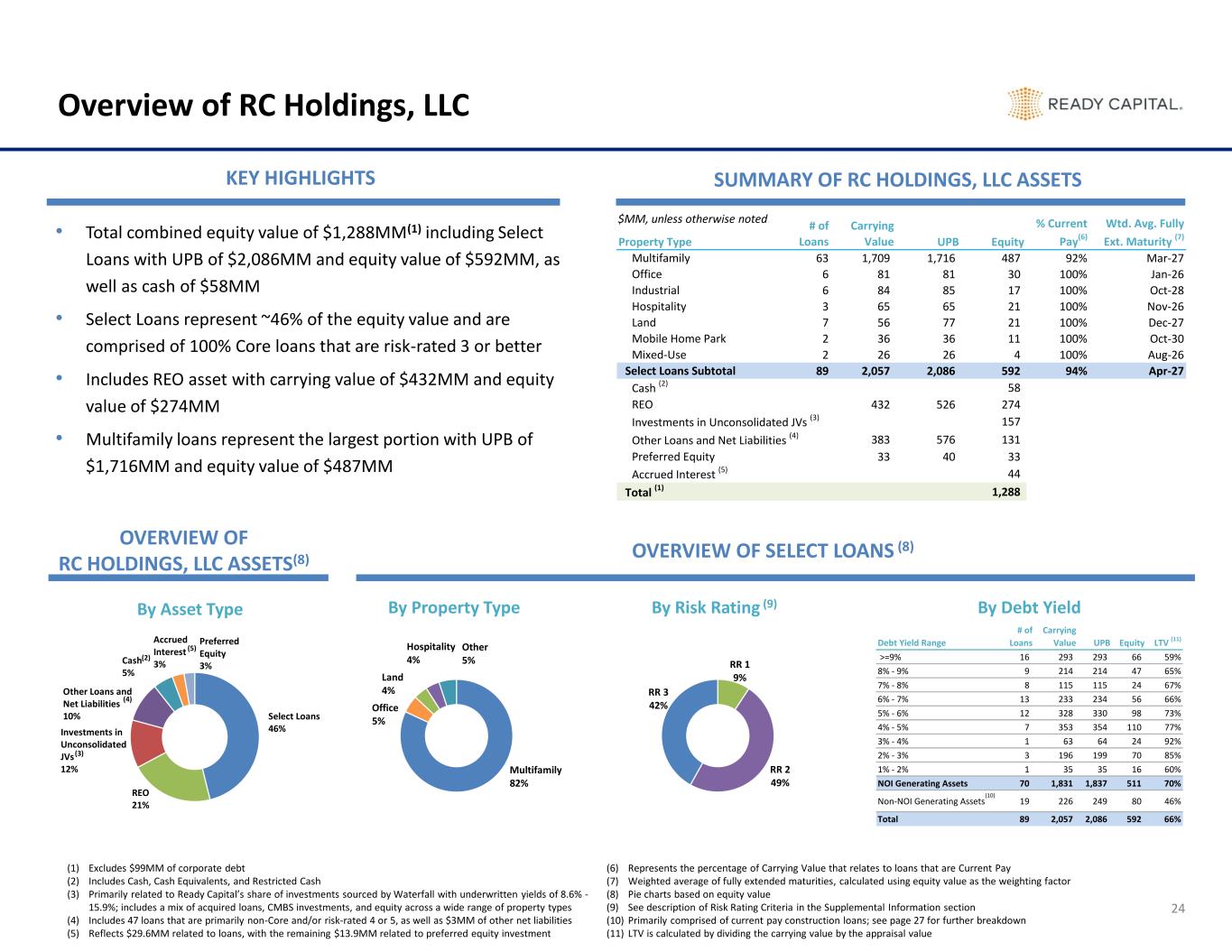 Debt Yield Range # of Loans Carrying Value UPB Equity LTV (11) >=9% 16 293 293 66 59% 8% - 9% 9 214 214 47 65% 7% - 8% 8 115 115 24 67% 6% - 7% 13 233 234 56 66% 5% - 6% 12 328 330 98 73% 4% - 5% 7 353 354 110 77% 3% - 4% 1 63 64 24 92% 2% - 3% 3 196 199 70 85% 1% - 2% 1 35 35 16 60% NOI Generating Assets 70 1,831 1,837 511 70% Non-NOI Generating Assets 19 226 249 80 46% Total 89 2,057 2,086 592 66% Property Type # of Loans Carrying Value UPB Equity % Current Pay(6) Wtd. Avg. Fully Ext. Maturity (7) Multifamily 63 1,709 1,716 487 92% Mar-27 Office 6 81 81 30 100% Jan-26 Industrial 6 84 85 17 100% Oct-28 Hospitality 3 65 65 21 100% Nov-26 Land 7 56 77 21 100% Dec-27 Mobile Home Park 2 36 36 11 100% Oct-30 Mixed-Use 2 26 26 4 100% Aug-26 Select Loans Subtotal 89 2,057 2,086 592 94% Apr-27 Cash (2) 58 REO 432 526 274 Investments in Unconsolidated JVs (3) 157 Other Loans and Net Liabilities (4) 383 576 131 Preferred Equity 33 40 33 Accrued Interest (5) 44 Total (1) 1,288 Overview of RC Holdings, LLC KEY HIGHLIGHTS SUMMARY OF RC HOLDINGS, LLC ASSETS OVERVIEW OF SELECT LOANS (8) • Total combined equity value of $1,288MM(1) including Select Loans with UPB of $2,086MM and equity value of $592MM, as well as cash of $58MM • Select Loans represent ~46% of the equity value and are comprised of 100% Core loans that are risk-rated 3 or better • Includes REO asset with carrying value of $432MM and equity value of $274MM • Multifamily loans represent the largest portion with UPB of $1,716MM and equity value of $487MM By Property Type Multifamily 82% Office 5% Land 4% Hospitality 4% Other 5% Select Loans 46% REO 21% Investments in Unconsolidated JVs 12% Other Loans and Net Liabilities 10% Cash 5% Accrued Interest 3% Preferred Equity 3% $MM, unless otherwise noted OVERVIEW OF RC HOLDINGS, LLC ASSETS(8) By Asset Type 24 By Risk Rating (9) RR 1 9% RR 2 49% RR 3 42% (4) (3) (5) (2) (1) Excludes $99MM of corporate debt (2) Includes Cash, Cash Equivalents, and Restricted Cash (3) Primarily related to Ready Capital’s share of investments sourced by Waterfall with underwritten yields of 8.6% - 15.9%; includes a mix of acquired loans, CMBS investments, and equity across a wide range of property types (4) Includes 47 loans that are primarily non-Core and/or risk-rated 4 or 5, as well as $3MM of other net liabilities (5) Reflects $29.6MM related to loans, with the remaining $13.9MM related to preferred equity investment (6) Represents the percentage of Carrying Value that relates to loans that are Current Pay (7) Weighted average of fully extended maturities, calculated using equity value as the weighting factor (8) Pie charts based on equity value (9) See description of Risk Rating Criteria in the Supplemental Information section (10) Primarily comprised of current pay construction loans; see page 27 for further breakdown (11) LTV is calculated by dividing the carrying value by the appraisal value (10) By Debt Yield