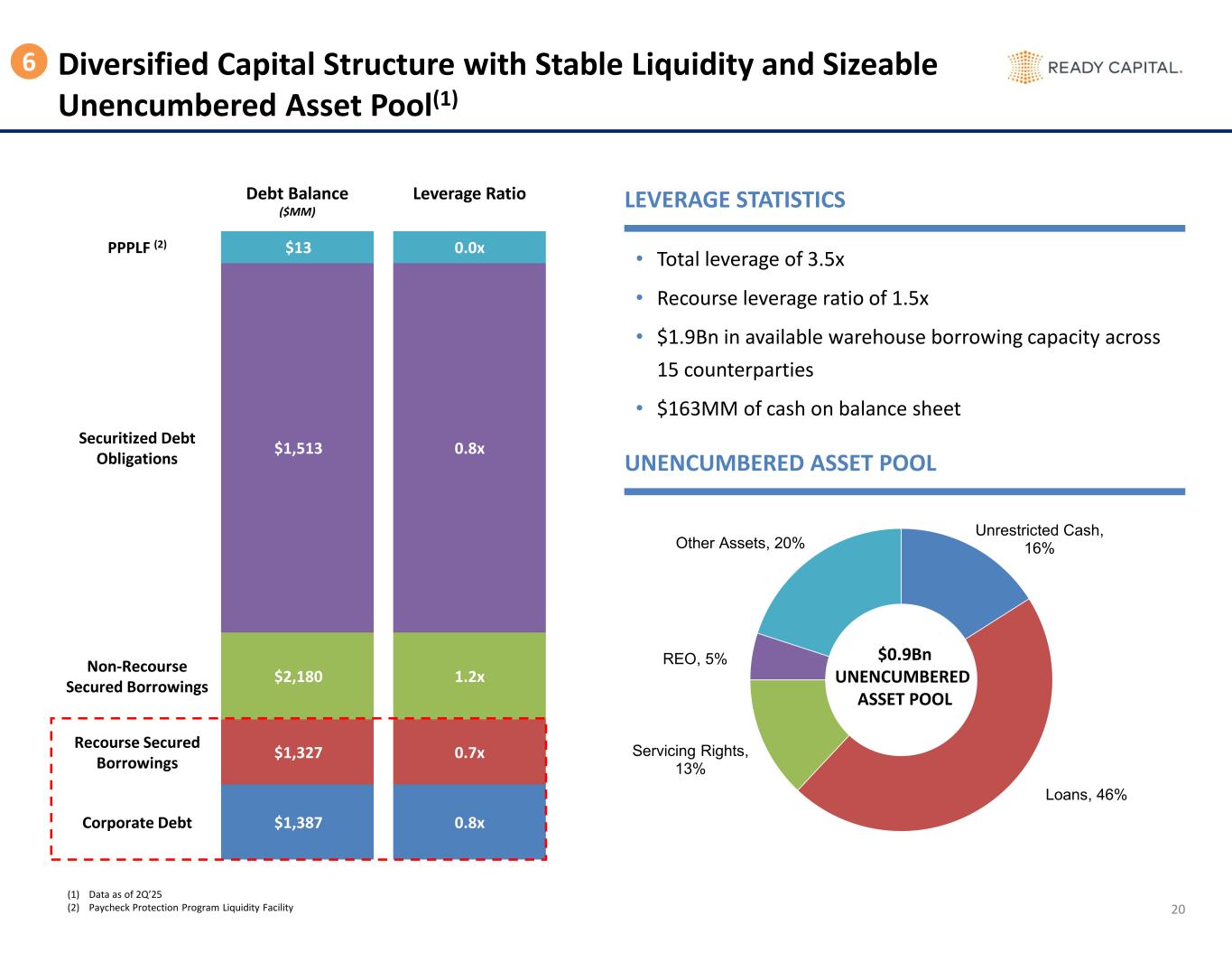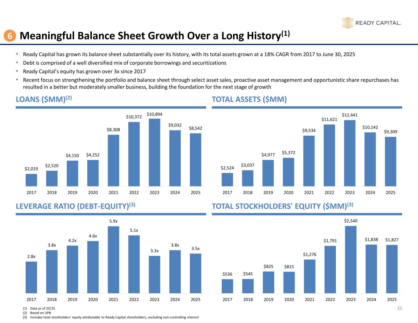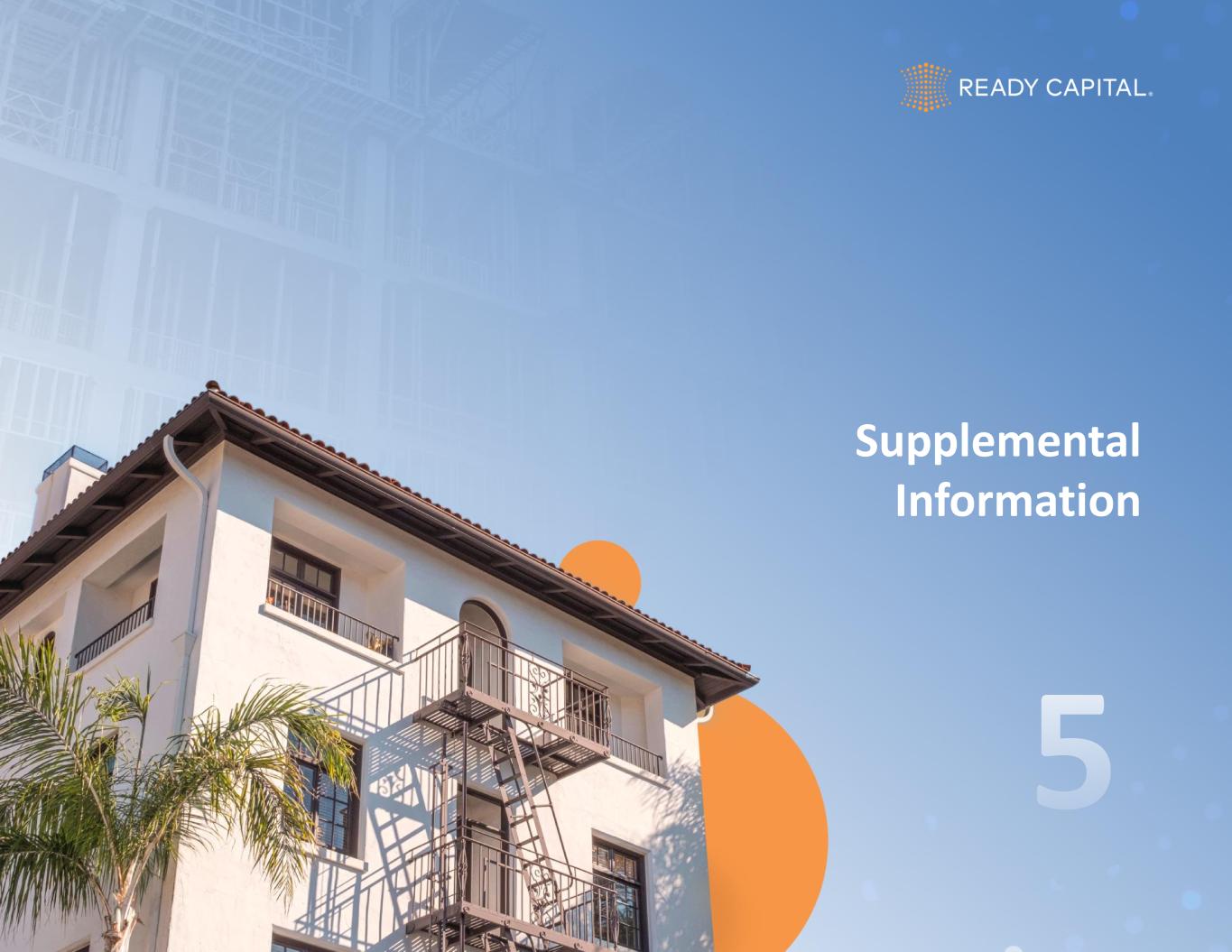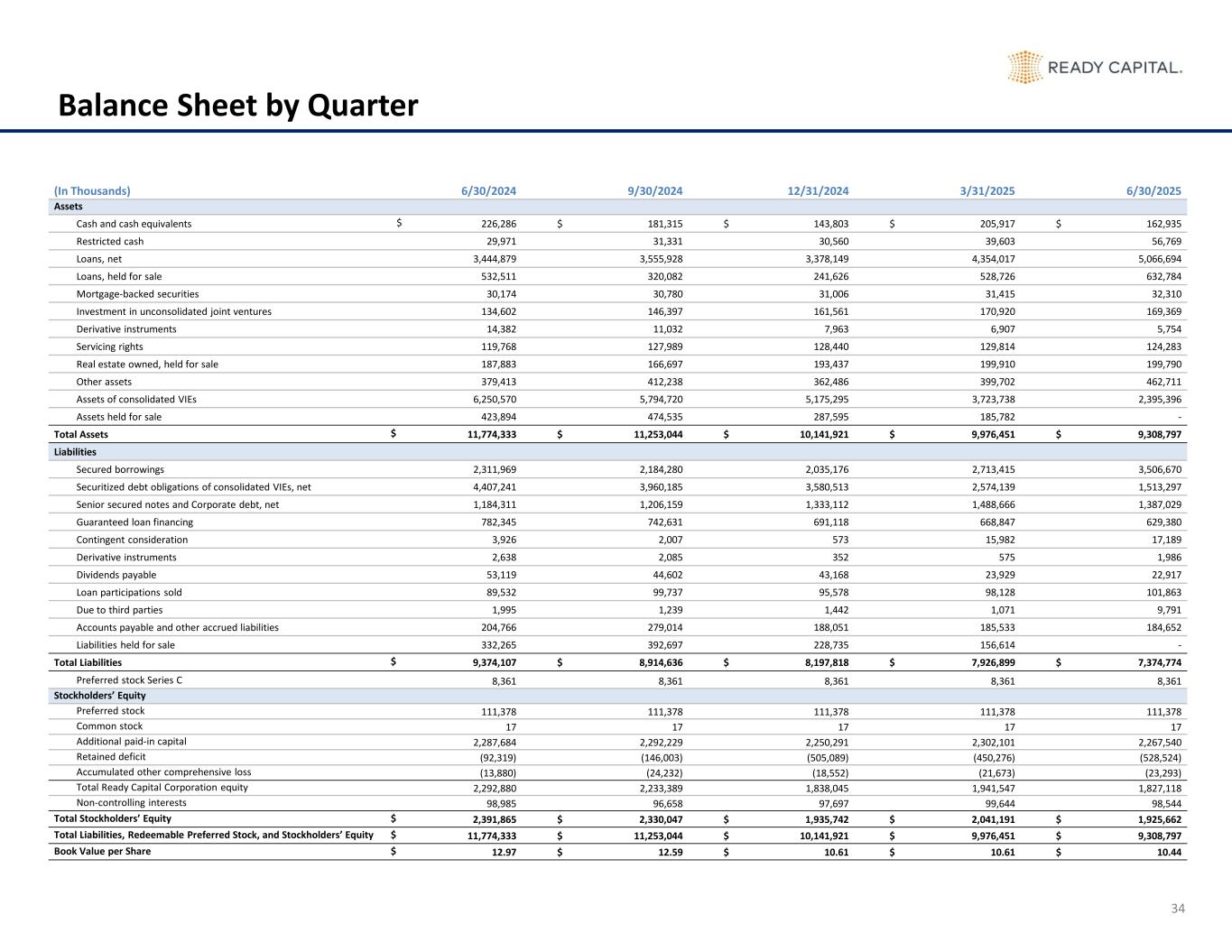 34 Balance Sheet by Quarter (In Thousands) 6/30/2024 9/30/2024 12/31/2024 3/31/2025 6/30/2025 Assets Cash and cash equivalents $ 226,286 $ 181,315 $ 143,803 $ 205,917 $ 162,935 Restricted cash 29,971 31,331 30,560 39,603 56,769 Loans, net 3,444,879 3,555,928 3,378,149 4,354,017 5,066,694 Loans, held for sale 532,511 320,082 241,626 528,726 632,784 Mortgage-backed securities 30,174 30,780 31,006 31,415 32,310 Investment in unconsolidated joint ventures 134,602 146,397 161,561 170,920 169,369 Derivative instruments 14,382 11,032 7,963 6,907 5,754 Servicing rights 119,768 127,989 128,440 129,814 124,283 Real estate owned, held for sale 187,883 166,697 193,437 199,910 199,790 Other assets 379,413 412,238 362,486 399,702 462,711 Assets of consolidated VIEs 6,250,570 5,794,720 5,175,295 3,723,738 2,395,396 Assets held for sale 423,894 474,535 287,595 185,782 - Total Assets $ 11,774,333 $ 11,253,044 $ 10,141,921 $ 9,976,451 $ 9,308,797 Liabilities Secured borrowings 2,311,969 2,184,280 2,035,176 2,713,415 3,506,670 Securitized debt obligations of consolidated VIEs, net 4,407,241 3,960,185 3,580,513 2,574,139 1,513,297 Senior secured notes and Corporate debt, net 1,184,311 1,206,159 1,333,112 1,488,666 1,387,029 Guaranteed loan financing 782,345 742,631 691,118 668,847 629,380 Contingent consideration 3,926 2,007 573 15,982 17,189 Derivative instruments 2,638 2,085 352 575 1,986 Dividends payable 53,119 44,602 43,168 23,929 22,917 Loan participations sold 89,532 99,737 95,578 98,128 101,863 Due to third parties 1,995 1,239 1,442 1,071 9,791 Accounts payable and other accrued liabilities 204,766 279,014 188,051 185,533 184,652 Liabilities held for sale 332,265 392,697 228,735 156,614 - Total Liabilities $ 9,374,107 $ 8,914,636 $ 8,197,818 $ 7,926,899 $ 7,374,774 Preferred stock Series C 8,361 8,361 8,361 8,361 8,361 Stockholders’ Equity Preferred stock 111,378 111,378 111,378 111,378 111,378 Common stock 17 17 17 17 17 Additional paid-in capital 2,287,684 2,292,229 2,250,291 2,302,101 2,267,540 Retained deficit (92,319) (146,003) (505,089) (450,276) (528,524) Accumulated other comprehensive loss (13,880) (24,232) (18,552) (21,673) (23,293) Total Ready Capital Corporation equity 2,292,880 2,233,389 1,838,045 1,941,547 1,827,118 Non-controlling interests 98,985 96,658 97,697 99,644 98,544 Total Stockholders’ Equity $ 2,391,865 $ 2,330,047 $ 1,935,742 $ 2,041,191 $ 1,925,662 Total Liabilities, Redeemable Preferred Stock, and Stockholders’ Equity $ 11,774,333 $ 11,253,044 $ 10,141,921 $ 9,976,451 $ 9,308,797 Book Value per Share $ 12.97 $ 12.59 $ 10.61 $ 10.61 $ 10.44