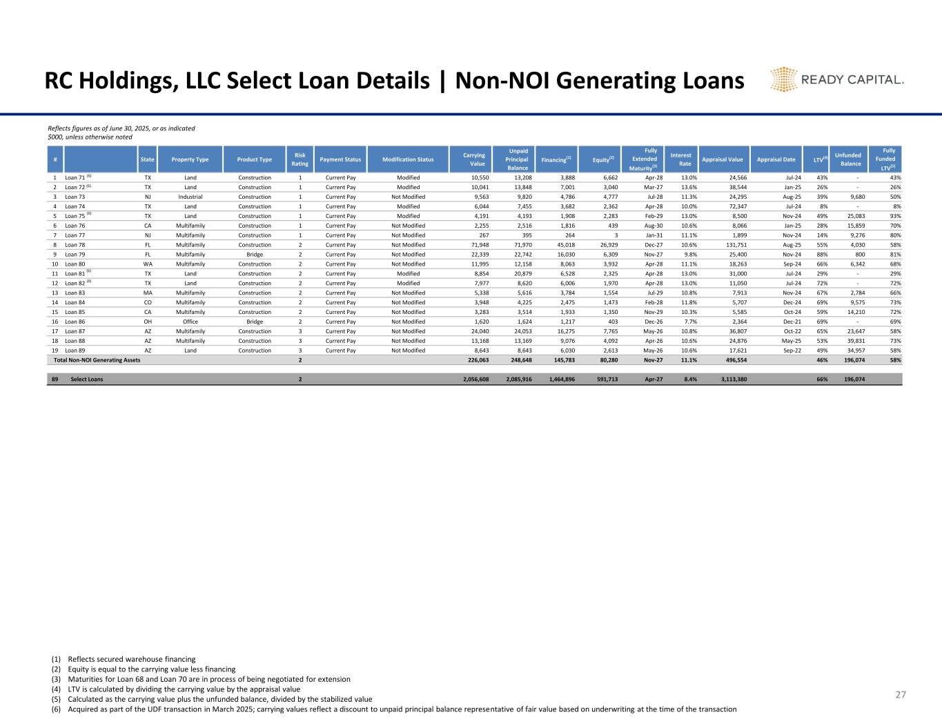 # State Property Type Product Type Risk Rating Payment Status Modification Status Carrying Value Unpaid Principal Balance Financing(1) Equity(2) Fully Extended Maturity(3) Interest Rate Appraisal Value Appraisal Date LTV(4) Unfunded Balance Fully Funded LTV(5) 1 Loan 71 TX Land Construction 1 Current Pay Modified 10,550 13,208 3,888 6,662 Apr-28 13.0% 24,566 Jul-24 43% - 43% 2 Loan 72 TX Land Construction 1 Current Pay Modified 10,041 13,848 7,001 3,040 Mar-27 13.6% 38,544 Jan-25 26% - 26% 3 Loan 73 NJ Industrial Construction 1 Current Pay Not Modified 9,563 9,820 4,786 4,777 Jul-28 11.3% 24,295 Aug-25 39% 9,680 50% 4 Loan 74 TX Land Construction 1 Current Pay Modified 6,044 7,455 3,682 2,362 Apr-28 10.0% 72,347 Jul-24 8% - 8% 5 Loan 75 TX Land Construction 1 Current Pay Modified 4,191 4,193 1,908 2,283 Feb-29 13.0% 8,500 Nov-24 49% 25,083 93% 6 Loan 76 CA Multifamily Construction 1 Current Pay Not Modified 2,255 2,516 1,816 439 Aug-30 10.6% 8,066 Jan-25 28% 15,859 70% 7 Loan 77 NJ Multifamily Construction 1 Current Pay Not Modified 267 395 264 3 Jan-31 11.1% 1,899 Nov-24 14% 9,276 80% 8 Loan 78 FL Multifamily Construction 2 Current Pay Not Modified 71,948 71,970 45,018 26,929 Dec-27 10.6% 131,751 Aug-25 55% 4,030 58% 9 Loan 79 FL Multifamily Bridge 2 Current Pay Not Modified 22,339 22,742 16,030 6,309 Nov-27 9.8% 25,400 Nov-24 88% 800 81% 10 Loan 80 WA Multifamily Construction 2 Current Pay Not Modified 11,995 12,158 8,063 3,932 Apr-28 11.1% 18,263 Sep-24 66% 6,342 68% 11 Loan 81 TX Land Construction 2 Current Pay Modified 8,854 20,879 6,528 2,325 Apr-28 13.0% 31,000 Jul-24 29% - 29% 12 Loan 82 TX Land Construction 2 Current Pay Modified 7,977 8,620 6,006 1,970 Apr-28 13.0% 11,050 Jul-24 72% - 72% 13 Loan 83 MA Multifamily Construction 2 Current Pay Not Modified 5,338 5,616 3,784 1,554 Jul-29 10.8% 7,913 Nov-24 67% 2,784 66% 14 Loan 84 CO Multifamily Construction 2 Current Pay Not Modified 3,948 4,225 2,475 1,473 Feb-28 11.8% 5,707 Dec-24 69% 9,575 73% 15 Loan 85 CA Multifamily Construction 2 Current Pay Not Modified 3,283 3,514 1,933 1,350 Nov-29 10.3% 5,585 Oct-24 59% 14,210 72% 16 Loan 86 OH Office Bridge 2 Current Pay Not Modified 1,620 1,624 1,217 403 Dec-26 7.7% 2,364 Dec-21 69% - 69% 17 Loan 87 AZ Multifamily Construction 3 Current Pay Not Modified 24,040 24,053 16,275 7,765 May-26 10.8% 36,807 Oct-22 65% 23,647 58% 18 Loan 88 AZ Multifamily Construction 3 Current Pay Not Modified 13,168 13,169 9,076 4,092 Apr-26 10.6% 24,876 May-25 53% 39,831 73% 19 Loan 89 AZ Land Construction 3 Current Pay Not Modified 8,643 8,643 6,030 2,613 May-26 10.6% 17,621 Sep-22 49% 34,957 58% Total Non-NOI Generating Assets 2 226,063 248,648 145,783 80,280 Nov-27 11.1% 496,554 46% 196,074 58% 89 Select Loans 2 2,056,608 2,085,916 1,464,896 591,713 Apr-27 8.4% 3,113,380 66% 196,074 RC Holdings, LLC Select Loan Details | Non-NOI Generating Loans 27 (1) Reflects secured warehouse financing (2) Equity is equal to the carrying value less financing (3) Maturities for Loan 68 and Loan 70 are in process of being negotiated for extension (4) LTV is calculated by dividing the carrying value by the appraisal value (5) Calculated as the carrying value plus the unfunded balance, divided by the stabilized value (6) Acquired as part of the UDF transaction in March 2025; carrying values reflect a discount to unpaid principal balance representative of fair value based on underwriting at the time of the transaction (6) (6) (6) (6) Reflects figures as of June 30, 2025, or as indicated $000, unless otherwise noted (6)