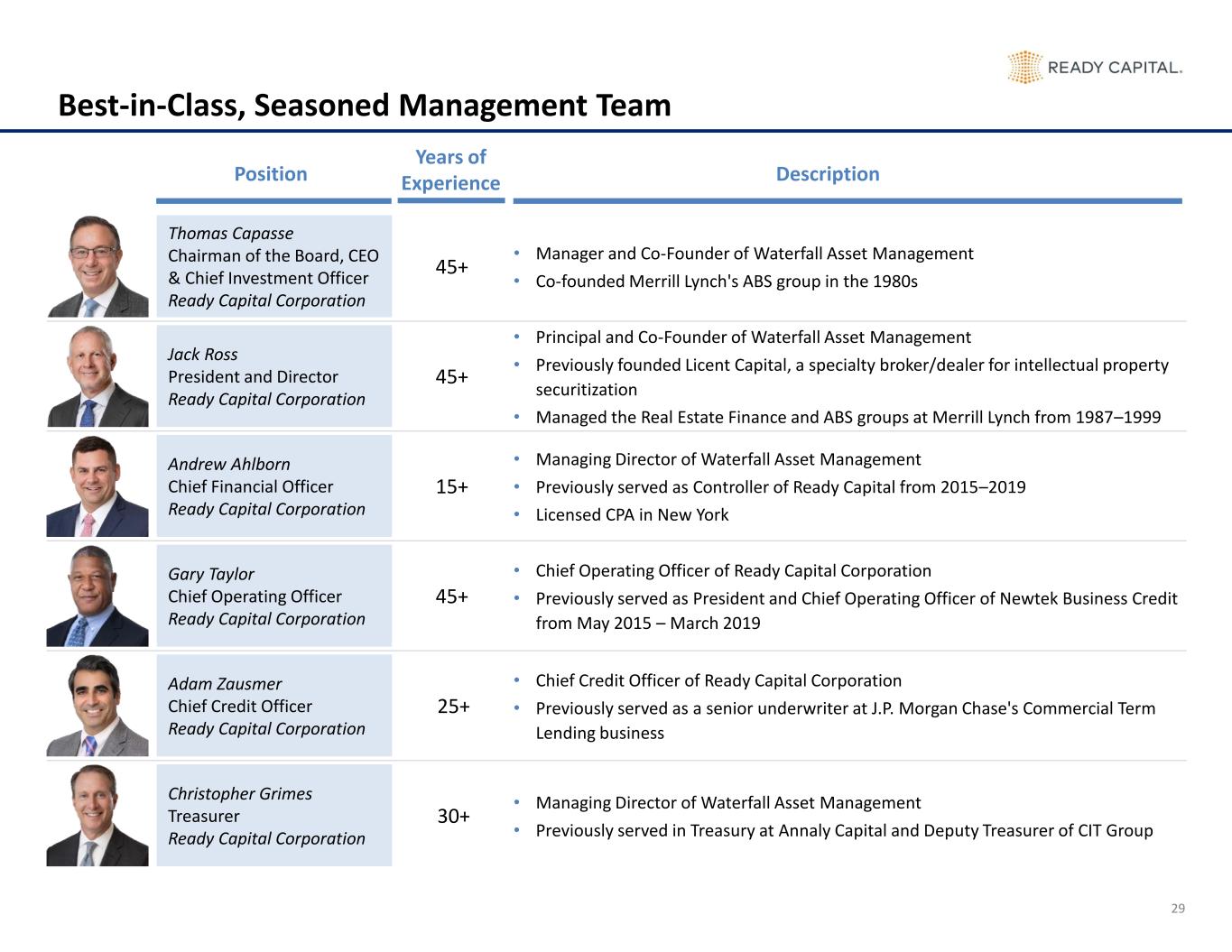 29 Best-in-Class, Seasoned Management Team • Manager and Co-Founder of Waterfall Asset Management • Co-founded Merrill Lynch's ABS group in the 1980s • Principal and Co-Founder of Waterfall Asset Management • Previously founded Licent Capital, a specialty broker/dealer for intellectual property securitization • Managed the Real Estate Finance and ABS groups at Merrill Lynch from 1987–1999 • Managing Director of Waterfall Asset Management • Previously served as Controller of Ready Capital from 2015–2019 • Licensed CPA in New York • Chief Operating Officer of Ready Capital Corporation • Previously served as President and Chief Operating Officer of Newtek Business Credit from May 2015 – March 2019 • Chief Credit Officer of Ready Capital Corporation • Previously served as a senior underwriter at J.P. Morgan Chase's Commercial Term Lending business • Managing Director of Waterfall Asset Management • Previously served in Treasury at Annaly Capital and Deputy Treasurer of CIT Group Position Description Thomas Capasse Chairman of the Board, CEO & Chief Investment Officer Ready Capital Corporation Jack Ross President and Director Ready Capital Corporation Andrew Ahlborn Chief Financial Officer Ready Capital Corporation Gary Taylor Chief Operating Officer Ready Capital Corporation Adam Zausmer Chief Credit Officer Ready Capital Corporation Christopher Grimes Treasurer Ready Capital Corporation Years of Experience 45+ 45+ 25+ 45+ 30+ 15+