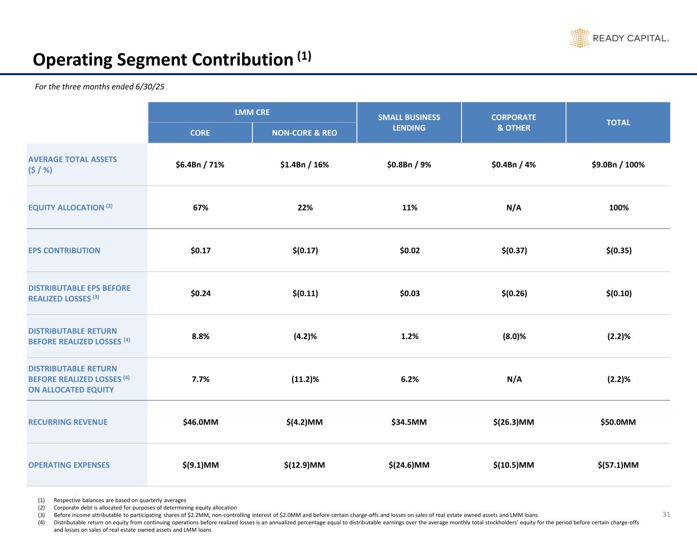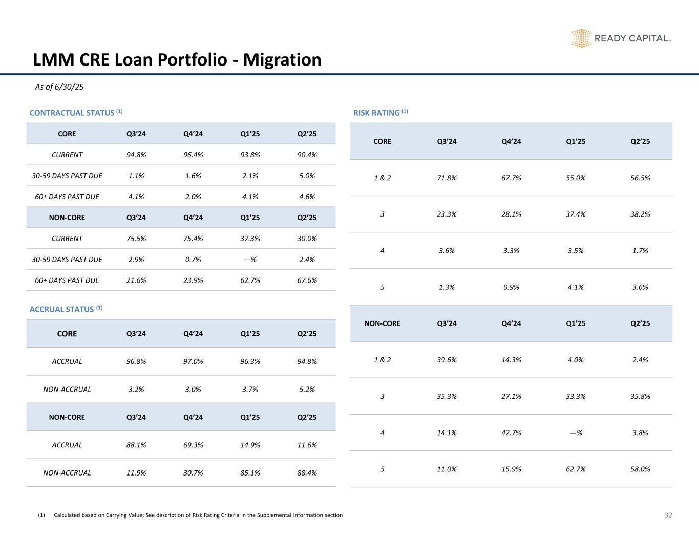 31 Operating Segment Contribution (1) LMM CRE SMALL BUSINESS LENDING CORPORATE & OTHER TOTAL CORE NON-CORE & REO AVERAGE TOTAL ASSETS ($ / %) $6.4Bn / 71% $1.4Bn / 16% $0.8Bn / 9% $0.4Bn / 4% $9.0Bn / 100% EQUITY ALLOCATION (2) 67% 22% 11% N/A 100% EPS CONTRIBUTION $0.17 $(0.17) $0.02 $(0.37) $(0.35) DISTRIBUTABLE EPS BEFORE REALIZED LOSSES (3) $0.24 $(0.11) $0.03 $(0.26) $(0.10) DISTRIBUTABLE RETURN BEFORE REALIZED LOSSES (4) 8.8% (4.2)% 1.2% (8.0)% (2.2)% DISTRIBUTABLE RETURN BEFORE REALIZED LOSSES (4) ON ALLOCATED EQUITY 7.7% (11.2)% 6.2% N/A (2.2)% RECURRING REVENUE $46.0MM $(4.2)MM $34.5MM $(26.3)MM $50.0MM OPERATING EXPENSES $(9.1)MM $(12.9)MM $(24.6)MM $(10.5)MM $(57.1)MM For the three months ended 6/30/25 (1) Respective balances are based on quarterly averages (2) Corporate debt is allocated for purposes of determining equity allocation (3) Before income attributable to participating shares of $2.2MM, non-controlling interest of $2.0MM and before certain charge-offs and losses on sales of real estate owned assets and LMM loans (4) Distributable return on equity from continuing operations before realized losses is an annualized percentage equal to distributable earnings over the average monthly total stockholders' equity for the period before certain charge-offs and losses on sales of real estate owned assets and LMM loans