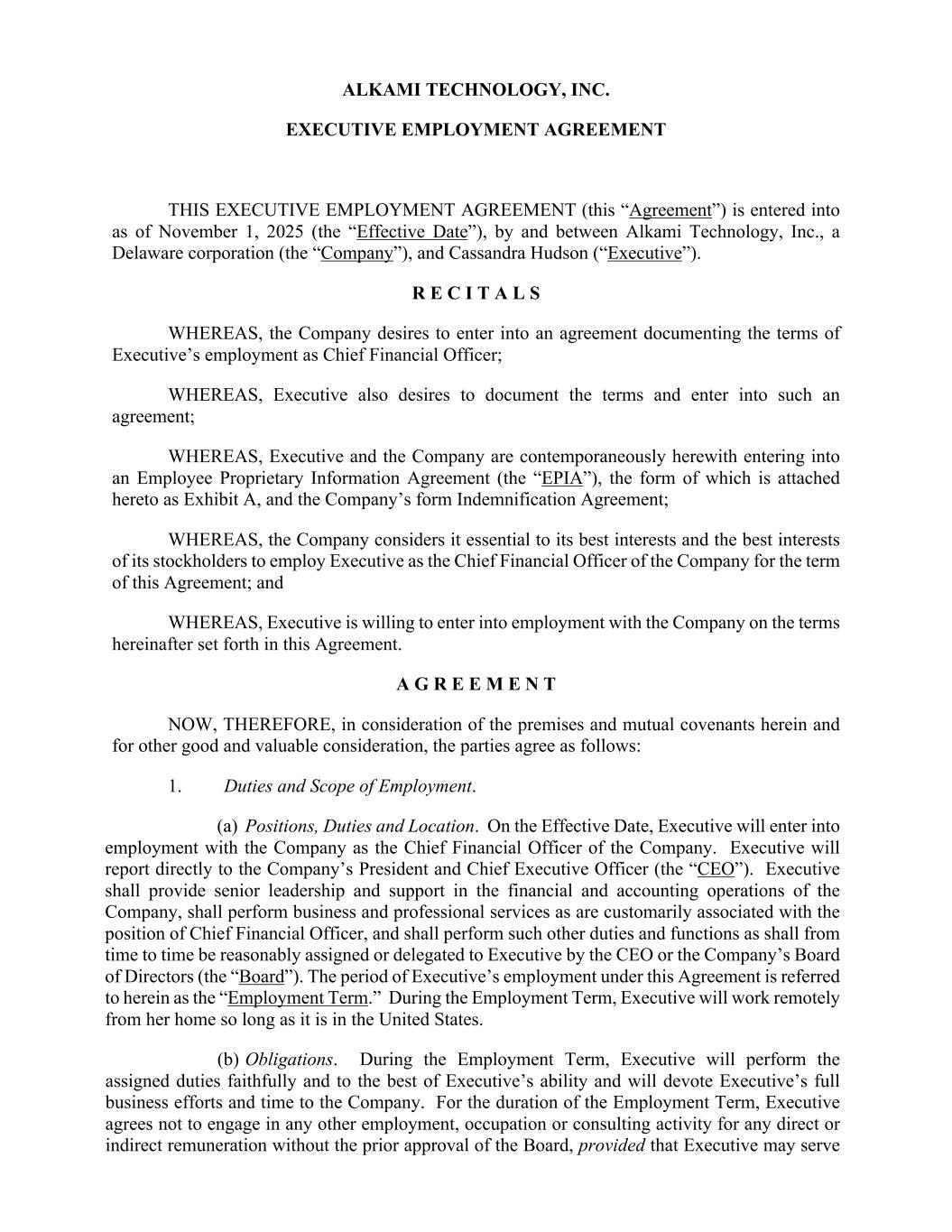 ALKAMI TECHNOLOGY, INC. EXECUTIVE EMPLOYMENT AGREEMENT THIS EXECUTIVE EMPLOYMENT AGREEMENT (this “Agreement”) is entered into as of November 1, 2025 (the “Effective Date”), by and between Alkami Technology, Inc., a Delaware corporation (the “Company”), and Cassandra Hudson (“Executive”). R E C I T A L S WHEREAS, the Company desires to enter into an agreement documenting the terms of Executive’s employment as Chief Financial Officer; WHEREAS, Executive also desires to document the terms and enter into such an agreement; WHEREAS, Executive and the Company are contemporaneously herewith entering into an Employee Proprietary Information Agreement (the “EPIA”), the form of which is attached hereto as Exhibit A, and the Company’s form Indemnification Agreement; WHEREAS, the Company considers it essential to its best interests and the best interests of its stockholders to employ Executive as the Chief Financial Officer of the Company for the term of this Agreement; and WHEREAS, Executive is willing to enter into employment with the Company on the terms hereinafter set forth in this Agreement. A G R E E M E N T NOW, THEREFORE, in consideration of the premises and mutual covenants herein and for other good and valuable consideration, the parties agree as follows: 1. Duties and Scope of Employment. (a) Positions, Duties and Location. On the Effective Date, Executive will enter into employment with the Company as the Chief Financial Officer of the Company. Executive will report directly to the Company’s President and Chief Executive Officer (the “CEO”). Executive shall provide senior leadership and support in the financial and accounting operations of the Company, shall perform business and professional services as are customarily associated with the position of Chief Financial Officer, and shall perform such other duties and functions as shall from time to time be reasonably assigned or delegated to Executive by the CEO or the Company’s Board of Directors (the “Board”). The period of Executive’s employment under this Agreement is referred to herein as the “Employment Term.” During the Employment Term, Executive will work remotely from her home so long as it is in the United States. (b) Obligations. During the Employment Term, Executive will perform the assigned duties faithfully and to the best of Executive’s ability and will devote Executive’s full business efforts and time to the Company. For the duration of the Employment Term, Executive agrees not to engage in any other employment, occupation or consulting activity for any direct or indirect remuneration without the prior approval of the Board, provided that Executive may serve