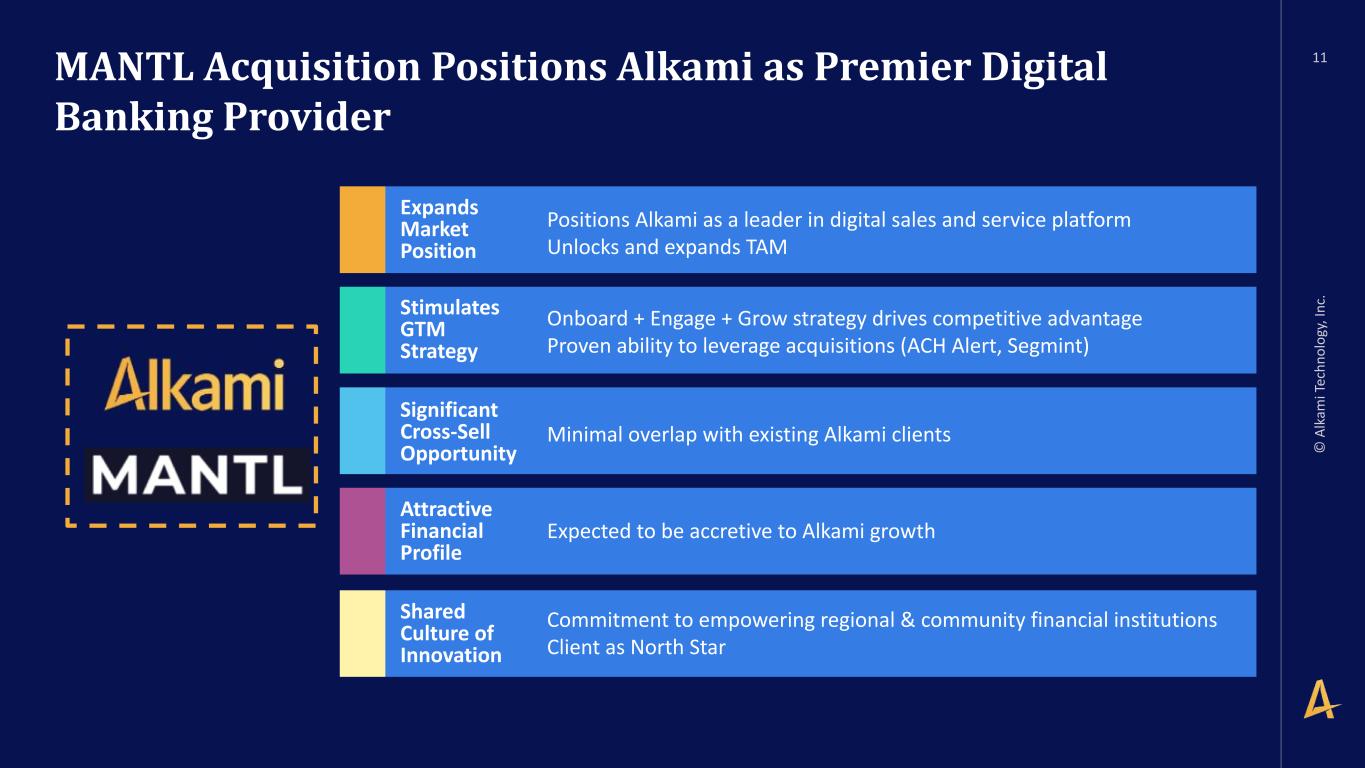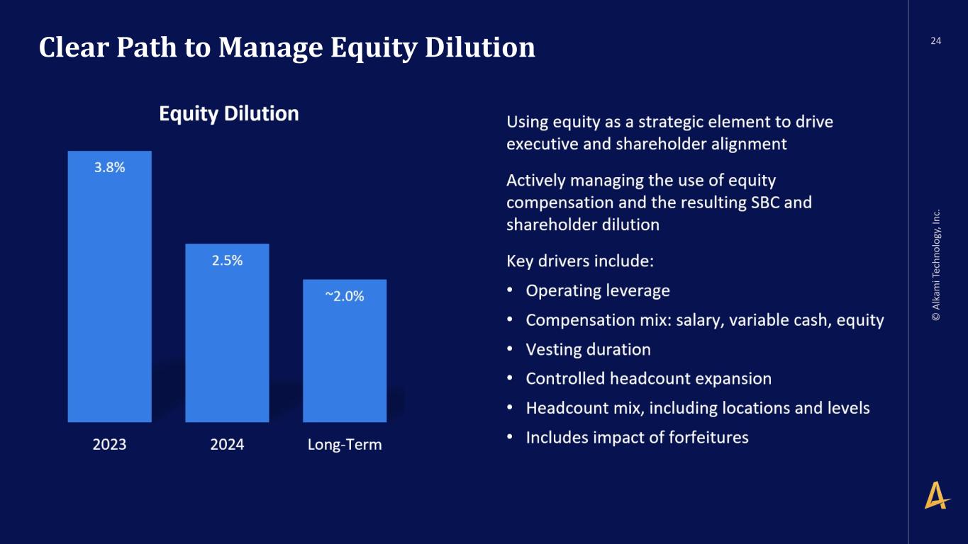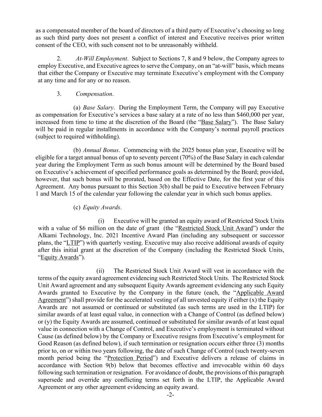 -2- as a compensated member of the board of directors of a third party of Executive’s choosing so long as such third party does not present a conflict of interest and Executive receives prior written consent of the CEO, with such consent not to be unreasonably withheld. 2. At-Will Employment. Subject to Sections 7, 8 and 9 below, the Company agrees to employ Executive, and Executive agrees to serve the Company, on an “at-will” basis, which means that either the Company or Executive may terminate Executive’s employment with the Company at any time and for any or no reason. 3. Compensation. (a) Base Salary. During the Employment Term, the Company will pay Executive as compensation for Executive’s services a base salary at a rate of no less than $460,000 per year, increased from time to time at the discretion of the Board (the “Base Salary”). The Base Salary will be paid in regular installments in accordance with the Company’s normal payroll practices (subject to required withholding). (b) Annual Bonus. Commencing with the 2025 bonus plan year, Executive will be eligible for a target annual bonus of up to seventy percent (70%) of the Base Salary in each calendar year during the Employment Term as such bonus amount will be determined by the Board based on Executive’s achievement of specified performance goals as determined by the Board; provided, however, that such bonus will be prorated, based on the Effective Date, for the first year of this Agreement. Any bonus pursuant to this Section 3(b) shall be paid to Executive between February 1 and March 15 of the calendar year following the calendar year in which such bonus applies. (c) Equity Awards. (i) Executive will be granted an equity award of Restricted Stock Units with a value of $6 million on the date of grant (the “Restricted Stock Unit Award”) under the Alkami Technology, Inc. 2021 Incentive Award Plan (including any subsequent or successor plans, the “LTIP”) with quarterly vesting. Executive may also receive additional awards of equity after this initial grant at the discretion of the Company (including the Restricted Stock Units, “Equity Awards”). (ii) The Restricted Stock Unit Award will vest in accordance with the terms of the equity award agreement evidencing such Restricted Stock Units. The Restricted Stock Unit Award agreement and any subsequent Equity Awards agreement evidencing any such Equity Awards granted to Executive by the Company in the future (each, the “Applicable Award Agreement”) shall provide for the accelerated vesting of all unvested equity if either (x) the Equity Awards are not assumed or continued or substituted (as such terms are used in the LTIP) for similar awards of at least equal value, in connection with a Change of Control (as defined below) or (y) the Equity Awards are assumed, continued or substituted for similar awards of at least equal value in connection with a Change of Control, and Executive’s employment is terminated without Cause (as defined below) by the Company or Executive resigns from Executive’s employment for Good Reason (as defined below), if such termination or resignation occurs either three (3) months prior to, on or within two years following, the date of such Change of Control (such twenty-seven month period being the “Protection Period”) and Executive delivers a release of claims in accordance with Section 9(b) below that becomes effective and irrevocable within 60 days following such termination or resignation. For avoidance of doubt, the provisions of this paragraph supersede and override any conflicting terms set forth in the LTIP, the Applicable Award Agreement or any other agreement evidencing an equity award.