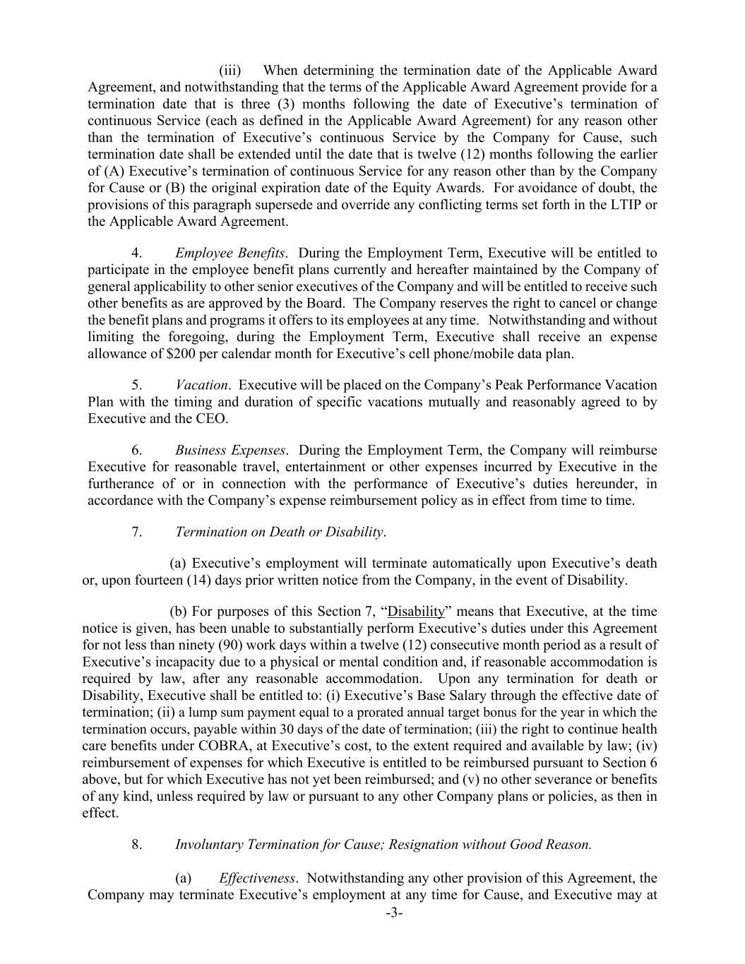 -3- (iii) When determining the termination date of the Applicable Award Agreement, and notwithstanding that the terms of the Applicable Award Agreement provide for a termination date that is three (3) months following the date of Executive’s termination of continuous Service (each as defined in the Applicable Award Agreement) for any reason other than the termination of Executive’s continuous Service by the Company for Cause, such termination date shall be extended until the date that is twelve (12) months following the earlier of (A) Executive’s termination of continuous Service for any reason other than by the Company for Cause or (B) the original expiration date of the Equity Awards. For avoidance of doubt, the provisions of this paragraph supersede and override any conflicting terms set forth in the LTIP or the Applicable Award Agreement. 4. Employee Benefits. During the Employment Term, Executive will be entitled to participate in the employee benefit plans currently and hereafter maintained by the Company of general applicability to other senior executives of the Company and will be entitled to receive such other benefits as are approved by the Board. The Company reserves the right to cancel or change the benefit plans and programs it offers to its employees at any time. Notwithstanding and without limiting the foregoing, during the Employment Term, Executive shall receive an expense allowance of $200 per calendar month for Executive’s cell phone/mobile data plan. 5. Vacation. Executive will be placed on the Company’s Peak Performance Vacation Plan with the timing and duration of specific vacations mutually and reasonably agreed to by Executive and the CEO. 6. Business Expenses. During the Employment Term, the Company will reimburse Executive for reasonable travel, entertainment or other expenses incurred by Executive in the furtherance of or in connection with the performance of Executive’s duties hereunder, in accordance with the Company’s expense reimbursement policy as in effect from time to time. 7. Termination on Death or Disability. (a) Executive’s employment will terminate automatically upon Executive’s death or, upon fourteen (14) days prior written notice from the Company, in the event of Disability. (b) For purposes of this Section 7, “Disability” means that Executive, at the time notice is given, has been unable to substantially perform Executive’s duties under this Agreement for not less than ninety (90) work days within a twelve (12) consecutive month period as a result of Executive’s incapacity due to a physical or mental condition and, if reasonable accommodation is required by law, after any reasonable accommodation. Upon any termination for death or Disability, Executive shall be entitled to: (i) Executive’s Base Salary through the effective date of termination; (ii) a lump sum payment equal to a prorated annual target bonus for the year in which the termination occurs, payable within 30 days of the date of termination; (iii) the right to continue health care benefits under COBRA, at Executive’s cost, to the extent required and available by law; (iv) reimbursement of expenses for which Executive is entitled to be reimbursed pursuant to Section 6 above, but for which Executive has not yet been reimbursed; and (v) no other severance or benefits of any kind, unless required by law or pursuant to any other Company plans or policies, as then in effect. 8. Involuntary Termination for Cause; Resignation without Good Reason. (a) Effectiveness. Notwithstanding any other provision of this Agreement, the Company may terminate Executive’s employment at any time for Cause, and Executive may at