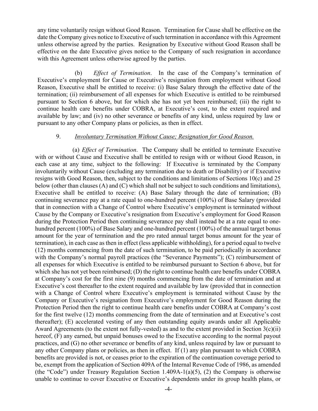 -4- any time voluntarily resign without Good Reason. Termination for Cause shall be effective on the date the Company gives notice to Executive of such termination in accordance with this Agreement unless otherwise agreed by the parties. Resignation by Executive without Good Reason shall be effective on the date Executive gives notice to the Company of such resignation in accordance with this Agreement unless otherwise agreed by the parties. (b) Effect of Termination. In the case of the Company’s termination of Executive’s employment for Cause or Executive’s resignation from employment without Good Reason, Executive shall be entitled to receive: (i) Base Salary through the effective date of the termination; (ii) reimbursement of all expenses for which Executive is entitled to be reimbursed pursuant to Section 6 above, but for which she has not yet been reimbursed; (iii) the right to continue health care benefits under COBRA, at Executive’s cost, to the extent required and available by law; and (iv) no other severance or benefits of any kind, unless required by law or pursuant to any other Company plans or policies, as then in effect. 9. Involuntary Termination Without Cause; Resignation for Good Reason. (a) Effect of Termination. The Company shall be entitled to terminate Executive with or without Cause and Executive shall be entitled to resign with or without Good Reason, in each case at any time, subject to the following: If Executive is terminated by the Company involuntarily without Cause (excluding any termination due to death or Disability) or if Executive resigns with Good Reason, then, subject to the conditions and limitations of Sections 10(c) and 25 below (other than clauses (A) and (C) which shall not be subject to such conditions and limitations), Executive shall be entitled to receive: (A) Base Salary through the date of termination; (B) continuing severance pay at a rate equal to one-hundred percent (100%) of Base Salary (provided that in connection with a Change of Control where Executive’s employment is terminated without Cause by the Company or Executive’s resignation from Executive’s employment for Good Reason during the Protection Period then continuing severance pay shall instead be at a rate equal to one- hundred percent (100%) of Base Salary and one-hundred percent (100%) of the annual target bonus amount for the year of termination and the pro rated annual target bonus amount for the year of termination), in each case as then in effect (less applicable withholding), for a period equal to twelve (12) months commencing from the date of such termination, to be paid periodically in accordance with the Company’s normal payroll practices (the “Severance Payments”); (C) reimbursement of all expenses for which Executive is entitled to be reimbursed pursuant to Section 6 above, but for which she has not yet been reimbursed; (D) the right to continue health care benefits under COBRA at Company’s cost for the first nine (9) months commencing from the date of termination and at Executive’s cost thereafter to the extent required and available by law (provided that in connection with a Change of Control where Executive’s employment is terminated without Cause by the Company or Executive’s resignation from Executive’s employment for Good Reason during the Protection Period then the right to continue health care benefits under COBRA at Company’s cost for the first twelve (12) months commencing from the date of termination and at Executive’s cost thereafter); (E) accelerated vesting of any then outstanding equity awards under all Applicable Award Agreements (to the extent not fully-vested) as and to the extent provided in Section 3(c)(ii) hereof, (F) any earned, but unpaid bonuses owed to the Executive according to the normal payout practices, and (G) no other severance or benefits of any kind, unless required by law or pursuant to any other Company plans or policies, as then in effect. If (1) any plan pursuant to which COBRA benefits are provided is not, or ceases prior to the expiration of the continuation coverage period to be, exempt from the application of Section 409A of the Internal Revenue Code of 1986, as amended (the “Code”) under Treasury Regulation Section 1.409A-1(a)(5), (2) the Company is otherwise unable to continue to cover Executive or Executive’s dependents under its group health plans, or