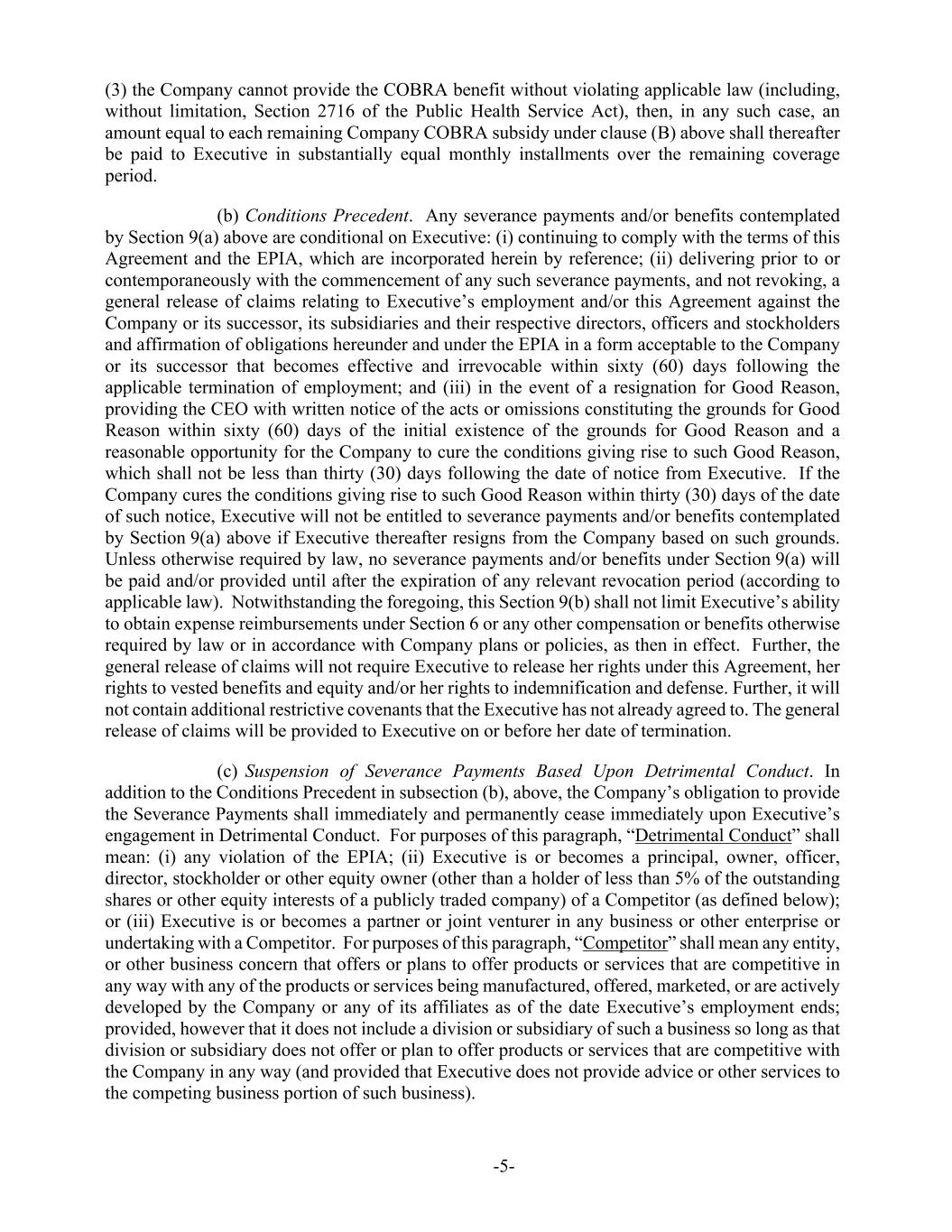 -5- (3) the Company cannot provide the COBRA benefit without violating applicable law (including, without limitation, Section 2716 of the Public Health Service Act), then, in any such case, an amount equal to each remaining Company COBRA subsidy under clause (B) above shall thereafter be paid to Executive in substantially equal monthly installments over the remaining coverage period. (b) Conditions Precedent. Any severance payments and/or benefits contemplated by Section 9(a) above are conditional on Executive: (i) continuing to comply with the terms of this Agreement and the EPIA, which are incorporated herein by reference; (ii) delivering prior to or contemporaneously with the commencement of any such severance payments, and not revoking, a general release of claims relating to Executive’s employment and/or this Agreement against the Company or its successor, its subsidiaries and their respective directors, officers and stockholders and affirmation of obligations hereunder and under the EPIA in a form acceptable to the Company or its successor that becomes effective and irrevocable within sixty (60) days following the applicable termination of employment; and (iii) in the event of a resignation for Good Reason, providing the CEO with written notice of the acts or omissions constituting the grounds for Good Reason within sixty (60) days of the initial existence of the grounds for Good Reason and a reasonable opportunity for the Company to cure the conditions giving rise to such Good Reason, which shall not be less than thirty (30) days following the date of notice from Executive. If the Company cures the conditions giving rise to such Good Reason within thirty (30) days of the date of such notice, Executive will not be entitled to severance payments and/or benefits contemplated by Section 9(a) above if Executive thereafter resigns from the Company based on such grounds. Unless otherwise required by law, no severance payments and/or benefits under Section 9(a) will be paid and/or provided until after the expiration of any relevant revocation period (according to applicable law). Notwithstanding the foregoing, this Section 9(b) shall not limit Executive’s ability to obtain expense reimbursements under Section 6 or any other compensation or benefits otherwise required by law or in accordance with Company plans or policies, as then in effect. Further, the general release of claims will not require Executive to release her rights under this Agreement, her rights to vested benefits and equity and/or her rights to indemnification and defense. Further, it will not contain additional restrictive covenants that the Executive has not already agreed to. The general release of claims will be provided to Executive on or before her date of termination. (c) Suspension of Severance Payments Based Upon Detrimental Conduct. In addition to the Conditions Precedent in subsection (b), above, the Company’s obligation to provide the Severance Payments shall immediately and permanently cease immediately upon Executive’s engagement in Detrimental Conduct. For purposes of this paragraph, “Detrimental Conduct” shall mean: (i) any violation of the EPIA; (ii) Executive is or becomes a principal, owner, officer, director, stockholder or other equity owner (other than a holder of less than 5% of the outstanding shares or other equity interests of a publicly traded company) of a Competitor (as defined below); or (iii) Executive is or becomes a partner or joint venturer in any business or other enterprise or undertaking with a Competitor. For purposes of this paragraph, “Competitor” shall mean any entity, or other business concern that offers or plans to offer products or services that are competitive in any way with any of the products or services being manufactured, offered, marketed, or are actively developed by the Company or any of its affiliates as of the date Executive’s employment ends; provided, however that it does not include a division or subsidiary of such a business so long as that division or subsidiary does not offer or plan to offer products or services that are competitive with the Company in any way (and provided that Executive does not provide advice or other services to the competing business portion of such business).