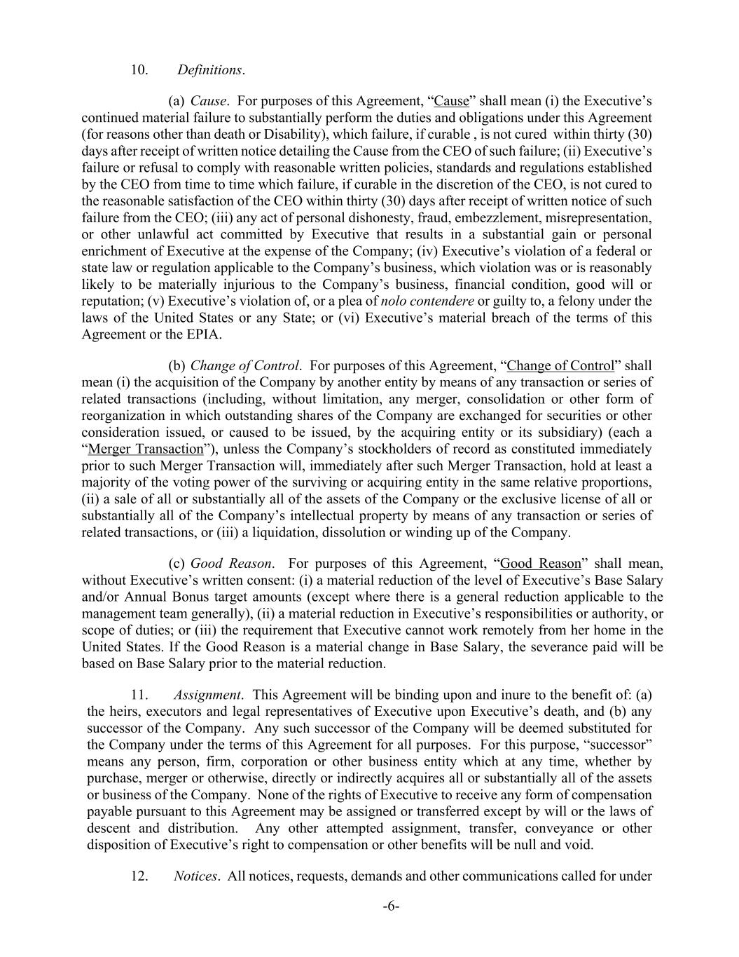 -6- 10. Definitions. (a) Cause. For purposes of this Agreement, “Cause” shall mean (i) the Executive’s continued material failure to substantially perform the duties and obligations under this Agreement (for reasons other than death or Disability), which failure, if curable , is not cured within thirty (30) days after receipt of written notice detailing the Cause from the CEO of such failure; (ii) Executive’s failure or refusal to comply with reasonable written policies, standards and regulations established by the CEO from time to time which failure, if curable in the discretion of the CEO, is not cured to the reasonable satisfaction of the CEO within thirty (30) days after receipt of written notice of such failure from the CEO; (iii) any act of personal dishonesty, fraud, embezzlement, misrepresentation, or other unlawful act committed by Executive that results in a substantial gain or personal enrichment of Executive at the expense of the Company; (iv) Executive’s violation of a federal or state law or regulation applicable to the Company’s business, which violation was or is reasonably likely to be materially injurious to the Company’s business, financial condition, good will or reputation; (v) Executive’s violation of, or a plea of nolo contendere or guilty to, a felony under the laws of the United States or any State; or (vi) Executive’s material breach of the terms of this Agreement or the EPIA. (b) Change of Control. For purposes of this Agreement, “Change of Control” shall mean (i) the acquisition of the Company by another entity by means of any transaction or series of related transactions (including, without limitation, any merger, consolidation or other form of reorganization in which outstanding shares of the Company are exchanged for securities or other consideration issued, or caused to be issued, by the acquiring entity or its subsidiary) (each a “Merger Transaction”), unless the Company’s stockholders of record as constituted immediately prior to such Merger Transaction will, immediately after such Merger Transaction, hold at least a majority of the voting power of the surviving or acquiring entity in the same relative proportions, (ii) a sale of all or substantially all of the assets of the Company or the exclusive license of all or substantially all of the Company’s intellectual property by means of any transaction or series of related transactions, or (iii) a liquidation, dissolution or winding up of the Company. (c) Good Reason. For purposes of this Agreement, “Good Reason” shall mean, without Executive’s written consent: (i) a material reduction of the level of Executive’s Base Salary and/or Annual Bonus target amounts (except where there is a general reduction applicable to the management team generally), (ii) a material reduction in Executive’s responsibilities or authority, or scope of duties; or (iii) the requirement that Executive cannot work remotely from her home in the United States. If the Good Reason is a material change in Base Salary, the severance paid will be based on Base Salary prior to the material reduction. 11. Assignment. This Agreement will be binding upon and inure to the benefit of: (a) the heirs, executors and legal representatives of Executive upon Executive’s death, and (b) any successor of the Company. Any such successor of the Company will be deemed substituted for the Company under the terms of this Agreement for all purposes. For this purpose, “successor” means any person, firm, corporation or other business entity which at any time, whether by purchase, merger or otherwise, directly or indirectly acquires all or substantially all of the assets or business of the Company. None of the rights of Executive to receive any form of compensation payable pursuant to this Agreement may be assigned or transferred except by will or the laws of descent and distribution. Any other attempted assignment, transfer, conveyance or other disposition of Executive’s right to compensation or other benefits will be null and void. 12. Notices. All notices, requests, demands and other communications called for under