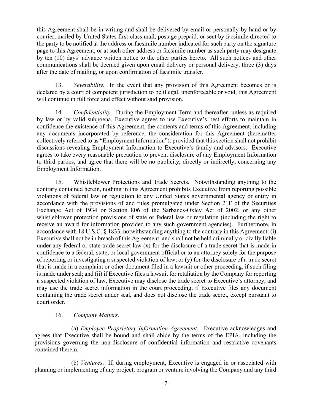 -7- this Agreement shall be in writing and shall be delivered by email or personally by hand or by courier, mailed by United States first-class mail, postage prepaid, or sent by facsimile directed to the party to be notified at the address or facsimile number indicated for such party on the signature page to this Agreement, or at such other address or facsimile number as such party may designate by ten (10) days’ advance written notice to the other parties hereto. All such notices and other communications shall be deemed given upon email delivery or personal delivery, three (3) days after the date of mailing, or upon confirmation of facsimile transfer. 13. Severability. In the event that any provision of this Agreement becomes or is declared by a court of competent jurisdiction to be illegal, unenforceable or void, this Agreement will continue in full force and effect without said provision. 14. Confidentiality. During the Employment Term and thereafter, unless as required by law or by valid subpoena, Executive agrees to use Executive’s best efforts to maintain in confidence the existence of this Agreement, the contents and terms of this Agreement, including any documents incorporated by reference, the consideration for this Agreement (hereinafter collectively referred to as “Employment Information”); provided that this section shall not prohibit discussions revealing Employment Information to Executive’s family and advisors. Executive agrees to take every reasonable precaution to prevent disclosure of any Employment Information to third parties, and agree that there will be no publicity, directly or indirectly, concerning any Employment Information. 15. Whistleblower Protections and Trade Secrets. Notwithstanding anything to the contrary contained herein, nothing in this Agreement prohibits Executive from reporting possible violations of federal law or regulation to any United States governmental agency or entity in accordance with the provisions of and rules promulgated under Section 21F of the Securities Exchange Act of 1934 or Section 806 of the Sarbanes-Oxley Act of 2002, or any other whistleblower protection provisions of state or federal law or regulation (including the right to receive an award for information provided to any such government agencies). Furthermore, in accordance with 18 U.S.C. § 1833, notwithstanding anything to the contrary in this Agreement: (i) Executive shall not be in breach of this Agreement, and shall not be held criminally or civilly liable under any federal or state trade secret law (x) for the disclosure of a trade secret that is made in confidence to a federal, state, or local government official or to an attorney solely for the purpose of reporting or investigating a suspected violation of law, or (y) for the disclosure of a trade secret that is made in a complaint or other document filed in a lawsuit or other proceeding, if such filing is made under seal; and (ii) if Executive files a lawsuit for retaliation by the Company for reporting a suspected violation of law, Executive may disclose the trade secret to Executive’s attorney, and may use the trade secret information in the court proceeding, if Executive files any document containing the trade secret under seal, and does not disclose the trade secret, except pursuant to court order. 16. Company Matters. (a) Employee Proprietary Information Agreement. Executive acknowledges and agrees that Executive shall be bound and shall abide by the terms of the EPIA, including the provisions governing the non-disclosure of confidential information and restrictive covenants contained therein. (b) Ventures. If, during employment, Executive is engaged in or associated with planning or implementing of any project, program or venture involving the Company and any third