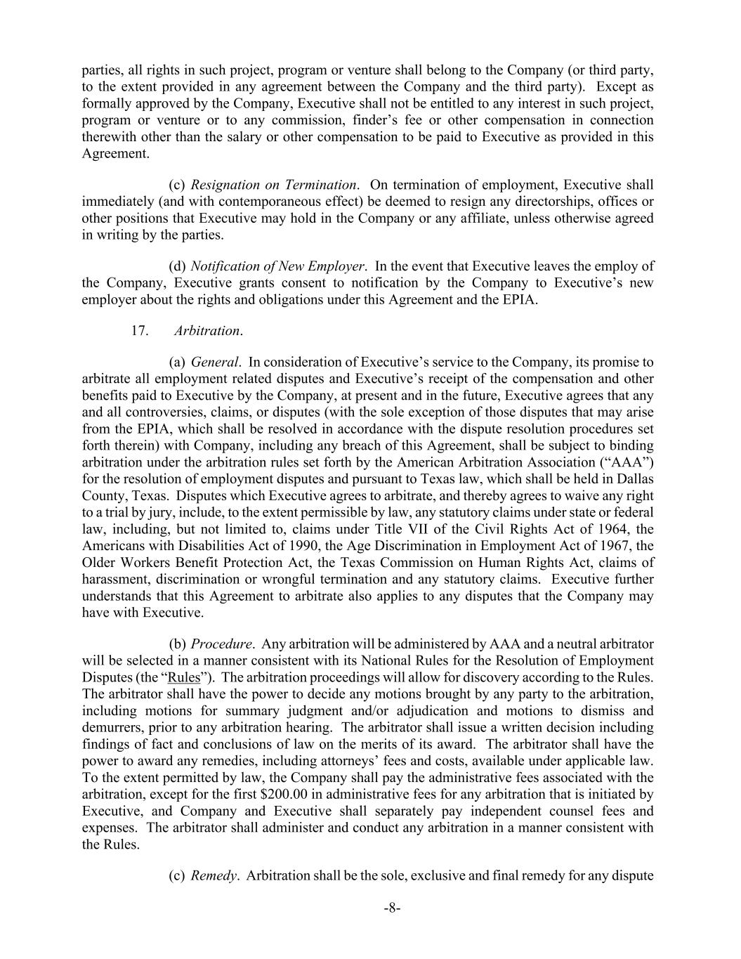 -8- parties, all rights in such project, program or venture shall belong to the Company (or third party, to the extent provided in any agreement between the Company and the third party). Except as formally approved by the Company, Executive shall not be entitled to any interest in such project, program or venture or to any commission, finder’s fee or other compensation in connection therewith other than the salary or other compensation to be paid to Executive as provided in this Agreement. (c) Resignation on Termination. On termination of employment, Executive shall immediately (and with contemporaneous effect) be deemed to resign any directorships, offices or other positions that Executive may hold in the Company or any affiliate, unless otherwise agreed in writing by the parties. (d) Notification of New Employer. In the event that Executive leaves the employ of the Company, Executive grants consent to notification by the Company to Executive’s new employer about the rights and obligations under this Agreement and the EPIA. 17. Arbitration. (a) General. In consideration of Executive’s service to the Company, its promise to arbitrate all employment related disputes and Executive’s receipt of the compensation and other benefits paid to Executive by the Company, at present and in the future, Executive agrees that any and all controversies, claims, or disputes (with the sole exception of those disputes that may arise from the EPIA, which shall be resolved in accordance with the dispute resolution procedures set forth therein) with Company, including any breach of this Agreement, shall be subject to binding arbitration under the arbitration rules set forth by the American Arbitration Association (“AAA”) for the resolution of employment disputes and pursuant to Texas law, which shall be held in Dallas County, Texas. Disputes which Executive agrees to arbitrate, and thereby agrees to waive any right to a trial by jury, include, to the extent permissible by law, any statutory claims under state or federal law, including, but not limited to, claims under Title VII of the Civil Rights Act of 1964, the Americans with Disabilities Act of 1990, the Age Discrimination in Employment Act of 1967, the Older Workers Benefit Protection Act, the Texas Commission on Human Rights Act, claims of harassment, discrimination or wrongful termination and any statutory claims. Executive further understands that this Agreement to arbitrate also applies to any disputes that the Company may have with Executive. (b) Procedure. Any arbitration will be administered by AAA and a neutral arbitrator will be selected in a manner consistent with its National Rules for the Resolution of Employment Disputes (the “Rules”). The arbitration proceedings will allow for discovery according to the Rules. The arbitrator shall have the power to decide any motions brought by any party to the arbitration, including motions for summary judgment and/or adjudication and motions to dismiss and demurrers, prior to any arbitration hearing. The arbitrator shall issue a written decision including findings of fact and conclusions of law on the merits of its award. The arbitrator shall have the power to award any remedies, including attorneys’ fees and costs, available under applicable law. To the extent permitted by law, the Company shall pay the administrative fees associated with the arbitration, except for the first $200.00 in administrative fees for any arbitration that is initiated by Executive, and Company and Executive shall separately pay independent counsel fees and expenses. The arbitrator shall administer and conduct any arbitration in a manner consistent with the Rules. (c) Remedy. Arbitration shall be the sole, exclusive and final remedy for any dispute