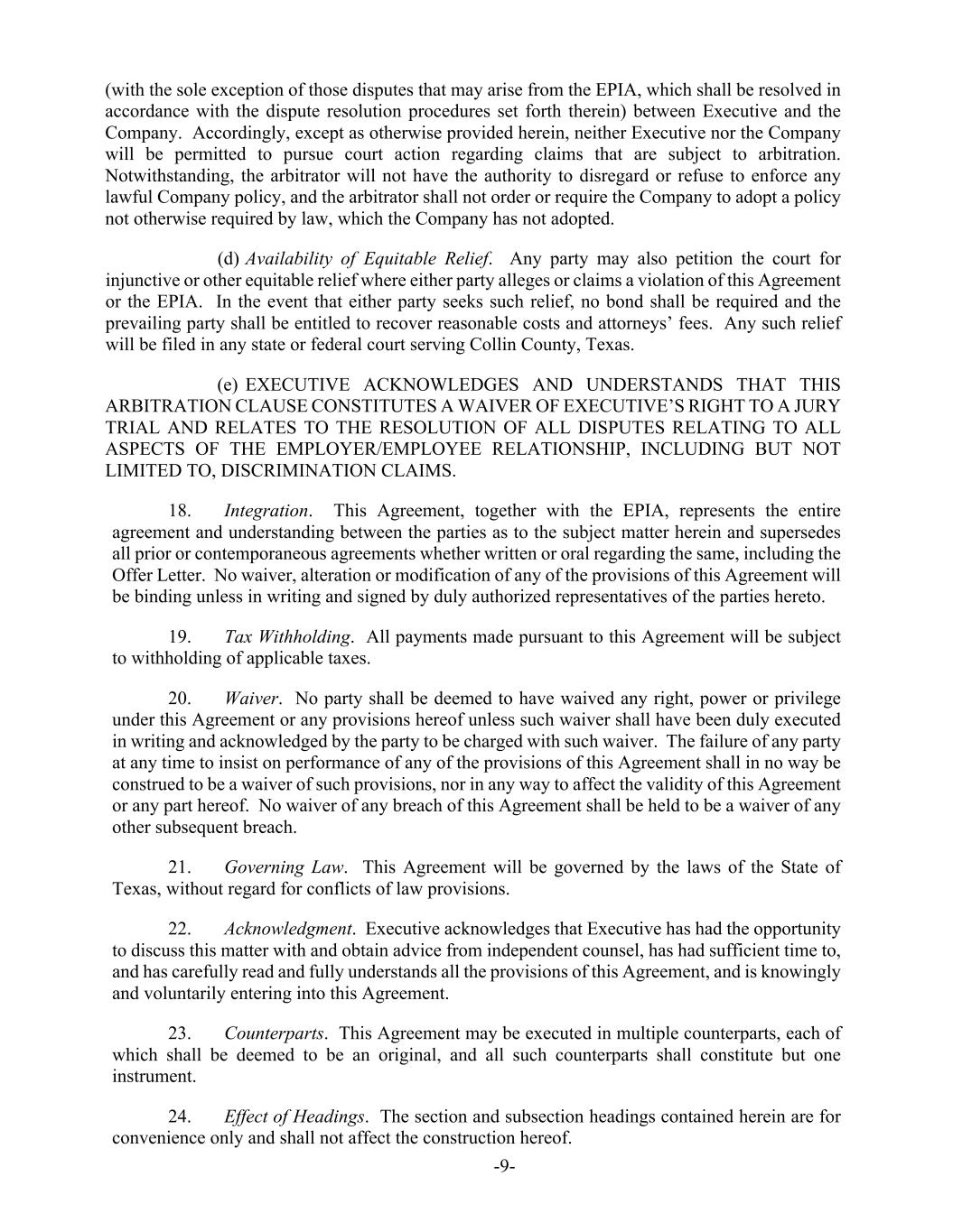 -9- (with the sole exception of those disputes that may arise from the EPIA, which shall be resolved in accordance with the dispute resolution procedures set forth therein) between Executive and the Company. Accordingly, except as otherwise provided herein, neither Executive nor the Company will be permitted to pursue court action regarding claims that are subject to arbitration. Notwithstanding, the arbitrator will not have the authority to disregard or refuse to enforce any lawful Company policy, and the arbitrator shall not order or require the Company to adopt a policy not otherwise required by law, which the Company has not adopted. (d) Availability of Equitable Relief. Any party may also petition the court for injunctive or other equitable relief where either party alleges or claims a violation of this Agreement or the EPIA. In the event that either party seeks such relief, no bond shall be required and the prevailing party shall be entitled to recover reasonable costs and attorneys’ fees. Any such relief will be filed in any state or federal court serving Collin County, Texas. (e) EXECUTIVE ACKNOWLEDGES AND UNDERSTANDS THAT THIS ARBITRATION CLAUSE CONSTITUTES A WAIVER OF EXECUTIVE’S RIGHT TO A JURY TRIAL AND RELATES TO THE RESOLUTION OF ALL DISPUTES RELATING TO ALL ASPECTS OF THE EMPLOYER/EMPLOYEE RELATIONSHIP, INCLUDING BUT NOT LIMITED TO, DISCRIMINATION CLAIMS. 18. Integration. This Agreement, together with the EPIA, represents the entire agreement and understanding between the parties as to the subject matter herein and supersedes all prior or contemporaneous agreements whether written or oral regarding the same, including the Offer Letter. No waiver, alteration or modification of any of the provisions of this Agreement will be binding unless in writing and signed by duly authorized representatives of the parties hereto. 19. Tax Withholding. All payments made pursuant to this Agreement will be subject to withholding of applicable taxes. 20. Waiver. No party shall be deemed to have waived any right, power or privilege under this Agreement or any provisions hereof unless such waiver shall have been duly executed in writing and acknowledged by the party to be charged with such waiver. The failure of any party at any time to insist on performance of any of the provisions of this Agreement shall in no way be construed to be a waiver of such provisions, nor in any way to affect the validity of this Agreement or any part hereof. No waiver of any breach of this Agreement shall be held to be a waiver of any other subsequent breach. 21. Governing Law. This Agreement will be governed by the laws of the State of Texas, without regard for conflicts of law provisions. 22. Acknowledgment. Executive acknowledges that Executive has had the opportunity to discuss this matter with and obtain advice from independent counsel, has had sufficient time to, and has carefully read and fully understands all the provisions of this Agreement, and is knowingly and voluntarily entering into this Agreement. 23. Counterparts. This Agreement may be executed in multiple counterparts, each of which shall be deemed to be an original, and all such counterparts shall constitute but one instrument. 24. Effect of Headings. The section and subsection headings contained herein are for convenience only and shall not affect the construction hereof.