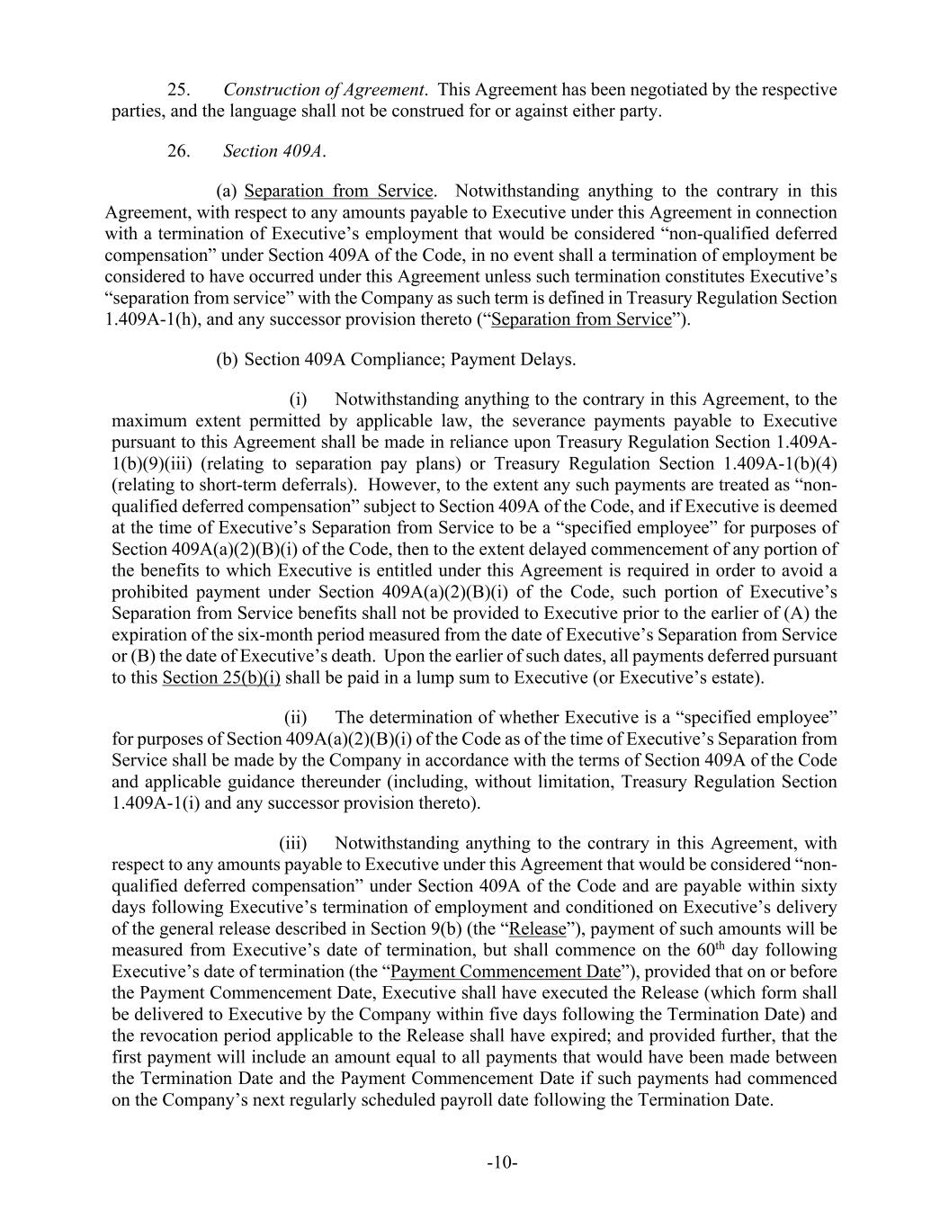 -10- 25. Construction of Agreement. This Agreement has been negotiated by the respective parties, and the language shall not be construed for or against either party. 26. Section 409A. (a) Separation from Service. Notwithstanding anything to the contrary in this Agreement, with respect to any amounts payable to Executive under this Agreement in connection with a termination of Executive’s employment that would be considered “non-qualified deferred compensation” under Section 409A of the Code, in no event shall a termination of employment be considered to have occurred under this Agreement unless such termination constitutes Executive’s “separation from service” with the Company as such term is defined in Treasury Regulation Section 1.409A-1(h), and any successor provision thereto (“Separation from Service”). (b) Section 409A Compliance; Payment Delays. (i) Notwithstanding anything to the contrary in this Agreement, to the maximum extent permitted by applicable law, the severance payments payable to Executive pursuant to this Agreement shall be made in reliance upon Treasury Regulation Section 1.409A- 1(b)(9)(iii) (relating to separation pay plans) or Treasury Regulation Section 1.409A-1(b)(4) (relating to short-term deferrals). However, to the extent any such payments are treated as “non- qualified deferred compensation” subject to Section 409A of the Code, and if Executive is deemed at the time of Executive’s Separation from Service to be a “specified employee” for purposes of Section 409A(a)(2)(B)(i) of the Code, then to the extent delayed commencement of any portion of the benefits to which Executive is entitled under this Agreement is required in order to avoid a prohibited payment under Section 409A(a)(2)(B)(i) of the Code, such portion of Executive’s Separation from Service benefits shall not be provided to Executive prior to the earlier of (A) the expiration of the six-month period measured from the date of Executive’s Separation from Service or (B) the date of Executive’s death. Upon the earlier of such dates, all payments deferred pursuant to this Section 25(b)(i) shall be paid in a lump sum to Executive (or Executive’s estate). (ii) The determination of whether Executive is a “specified employee” for purposes of Section 409A(a)(2)(B)(i) of the Code as of the time of Executive’s Separation from Service shall be made by the Company in accordance with the terms of Section 409A of the Code and applicable guidance thereunder (including, without limitation, Treasury Regulation Section 1.409A-1(i) and any successor provision thereto). (iii) Notwithstanding anything to the contrary in this Agreement, with respect to any amounts payable to Executive under this Agreement that would be considered “non- qualified deferred compensation” under Section 409A of the Code and are payable within sixty days following Executive’s termination of employment and conditioned on Executive’s delivery of the general release described in Section 9(b) (the “Release”), payment of such amounts will be measured from Executive’s date of termination, but shall commence on the 60th day following Executive’s date of termination (the “Payment Commencement Date”), provided that on or before the Payment Commencement Date, Executive shall have executed the Release (which form shall be delivered to Executive by the Company within five days following the Termination Date) and the revocation period applicable to the Release shall have expired; and provided further, that the first payment will include an amount equal to all payments that would have been made between the Termination Date and the Payment Commencement Date if such payments had commenced on the Company’s next regularly scheduled payroll date following the Termination Date.