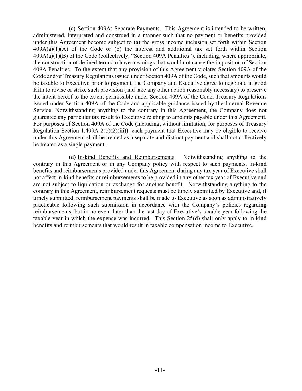 -11- (c) Section 409A; Separate Payments. This Agreement is intended to be written, administered, interpreted and construed in a manner such that no payment or benefits provided under this Agreement become subject to (a) the gross income inclusion set forth within Section 409A(a)(1)(A) of the Code or (b) the interest and additional tax set forth within Section 409A(a)(1)(B) of the Code (collectively, “Section 409A Penalties”), including, where appropriate, the construction of defined terms to have meanings that would not cause the imposition of Section 409A Penalties. To the extent that any provision of this Agreement violates Section 409A of the Code and/or Treasury Regulations issued under Section 409A of the Code, such that amounts would be taxable to Executive prior to payment, the Company and Executive agree to negotiate in good faith to revise or strike such provision (and take any other action reasonably necessary) to preserve the intent hereof to the extent permissible under Section 409A of the Code, Treasury Regulations issued under Section 409A of the Code and applicable guidance issued by the Internal Revenue Service. Notwithstanding anything to the contrary in this Agreement, the Company does not guarantee any particular tax result to Executive relating to amounts payable under this Agreement. For purposes of Section 409A of the Code (including, without limitation, for purposes of Treasury Regulation Section 1.409A-2(b)(2)(iii)), each payment that Executive may be eligible to receive under this Agreement shall be treated as a separate and distinct payment and shall not collectively be treated as a single payment. (d) In-kind Benefits and Reimbursements. Notwithstanding anything to the contrary in this Agreement or in any Company policy with respect to such payments, in-kind benefits and reimbursements provided under this Agreement during any tax year of Executive shall not affect in-kind benefits or reimbursements to be provided in any other tax year of Executive and are not subject to liquidation or exchange for another benefit. Notwithstanding anything to the contrary in this Agreement, reimbursement requests must be timely submitted by Executive and, if timely submitted, reimbursement payments shall be made to Executive as soon as administratively practicable following such submission in accordance with the Company’s policies regarding reimbursements, but in no event later than the last day of Executive’s taxable year following the taxable year in which the expense was incurred. This Section 25(d) shall only apply to in-kind benefits and reimbursements that would result in taxable compensation income to Executive.