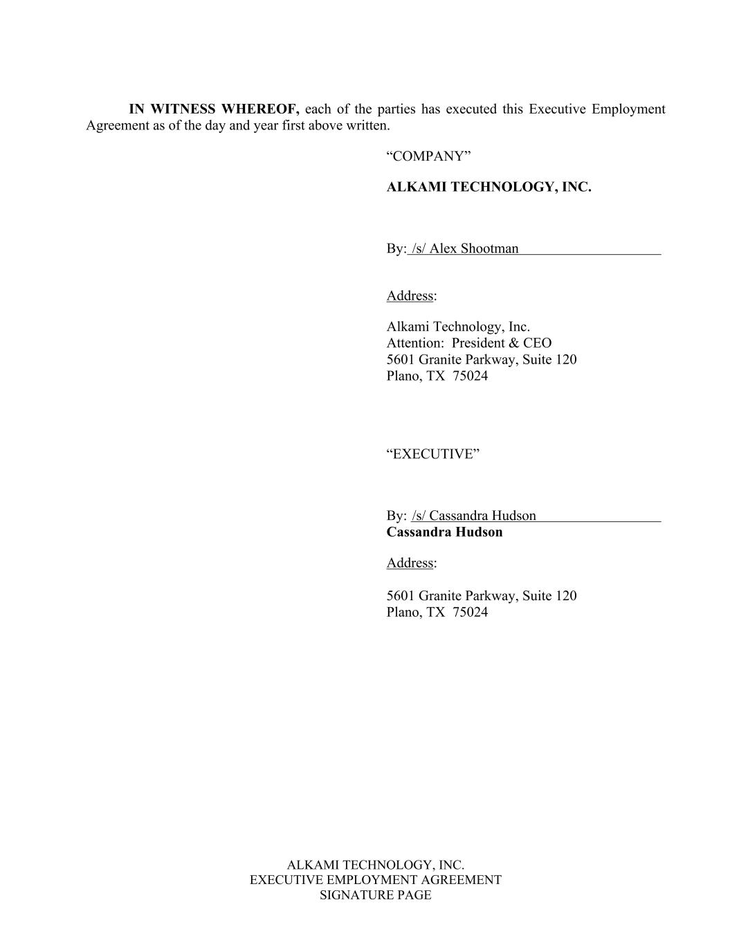 ALKAMI TECHNOLOGY, INC. EXECUTIVE EMPLOYMENT AGREEMENT SIGNATURE PAGE IN WITNESS WHEREOF, each of the parties has executed this Executive Employment Agreement as of the day and year first above written. “COMPANY” ALKAMI TECHNOLOGY, INC. By: /s/ Alex Shootman Address: Alkami Technology, Inc. Attention: President & CEO 5601 Granite Parkway, Suite 120 Plano, TX 75024 “EXECUTIVE” By: /s/ Cassandra Hudson Cassandra Hudson Address: 5601 Granite Parkway, Suite 120 Plano, TX 75024