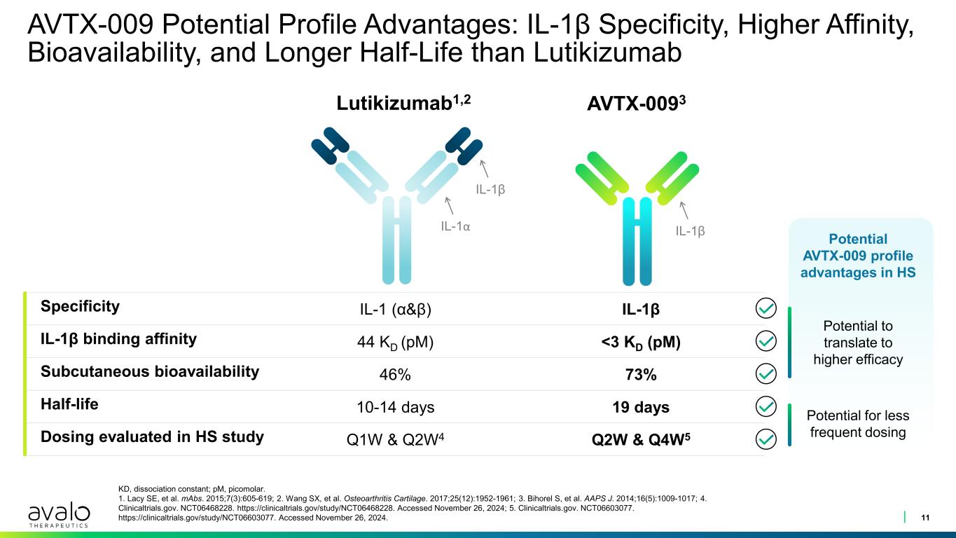 Specificity IL-1 (α&β) IL-1β IL-1β binding affinity 44 KD (pM) <3 KD (pM) Subcutaneous bioavailability 46% 73% Half-life 10-14 days 19 days Dosing evaluated in HS study Q1W & Q2W4 Q2W & Q4W5 AVTX-009 Potential Profile Advantages: IL-1β Specificity, Higher Affinity, Bioavailability, and Longer Half-Life than Lutikizumab 11 KD, dissociation constant; pM, picomolar. 1. Lacy SE, et al. mAbs. 2015;7(3):605-619; 2. Wang SX, et al. Osteoarthritis Cartilage. 2017;25(12):1952-1961; 3. Bihorel S, et al. AAPS J. 2014;16(5):1009-1017; 4. Clinicaltrials.gov. NCT06468228. https://clinicaltrials.gov/study/NCT06468228. Accessed November 26, 2024; 5. Clinicaltrials.gov. NCT06603077. https://clinicaltrials.gov/study/NCT06603077. Accessed November 26, 2024. Lutikizumab1,2 AVTX-0093 IL-1β Potential AVTX-009 profile advantages in HS Potential to translate to higher efficacy Potential for less frequent dosing IL-1β IL-1α