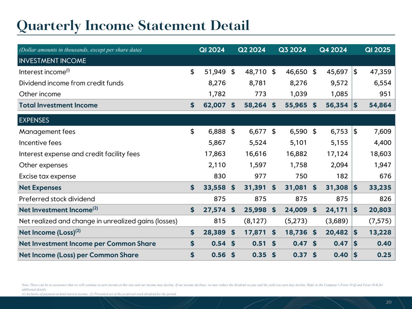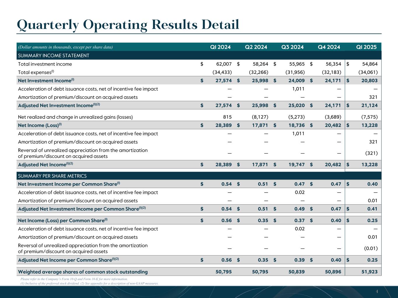 Quarterly Operating Results Detail Please refer to the Company’s Form 10-Q and Form 10-K for more information. (1) Inclusive of the preferred stock dividend. (2) See appendix for a description of non-GAAP measures. (Dollar amounts in thousands, except per share data) Q1 2024 Q2 2024 Q3 2024 Q4 2024 Q1 2025 SUMMARY INCOME STATEMENT Total investment income $ 62,007 $ 58,264 $ 55,965 $ 56,354 $ 54,864 Total expenses(1) (34,433) (32,266) (31,956) (32,183) (34,061) Net Investment Income(1) $ 27,574 $ 25,998 $ 24,009 $ 24,171 $ 20,803 Acceleration of debt issuance costs, net of incentive fee impact — — 1,011 — — Amortization of premium/discount on acquired assets — — — — 321 Adjusted Net Investment Income(1)(2) $ 27,574 $ 25,998 $ 25,020 $ 24,171 $ 21,124 Net realized and change in unrealized gains (losses) 815 (8,127) (5,273) (3,689) (7,575) Net Income (Loss)(1) $ 28,389 $ 17,871 $ 18,736 $ 20,482 $ 13,228 Acceleration of debt issuance costs, net of incentive fee impact — — 1,011 — — Amortization of premium/discount on acquired assets — — — — 321 Reversal of unrealized appreciation from the amortization of premium/discount on acquired assets — — — — (321) Adjusted Net Income(1)(2) $ 28,389 $ 17,871 $ 19,747 $ 20,482 $ 13,228 SUMMARY PER SHARE METRICS Net Investment Income per Common Share(1) $ 0.54 $ 0.51 $ 0.47 $ 0.47 $ 0.40 Acceleration of debt issuance costs, net of incentive fee impact — — 0.02 — — Amortization of premium/discount on acquired assets — — — — 0.01 Adjusted Net Investment Income per Common Share(1)(2) $ 0.54 $ 0.51 $ 0.49 $ 0.47 $ 0.41 Net Income (Loss) per Common Share(1) $ 0.56 $ 0.35 $ 0.37 $ 0.40 $ 0.25 Acceleration of debt issuance costs, net of incentive fee impact — — 0.02 — — Amortization of premium/discount on acquired assets — — — — 0.01 Reversal of unrealized appreciation from the amortization of premium/discount on acquired assets — — — — (0.01) Adjusted Net Income per Common Share(1)(2) $ 0.56 $ 0.35 $ 0.39 $ 0.40 $ 0.25 Weighted average shares of common stock outstanding 50,795 50,795 50,839 50,896 51,923 4