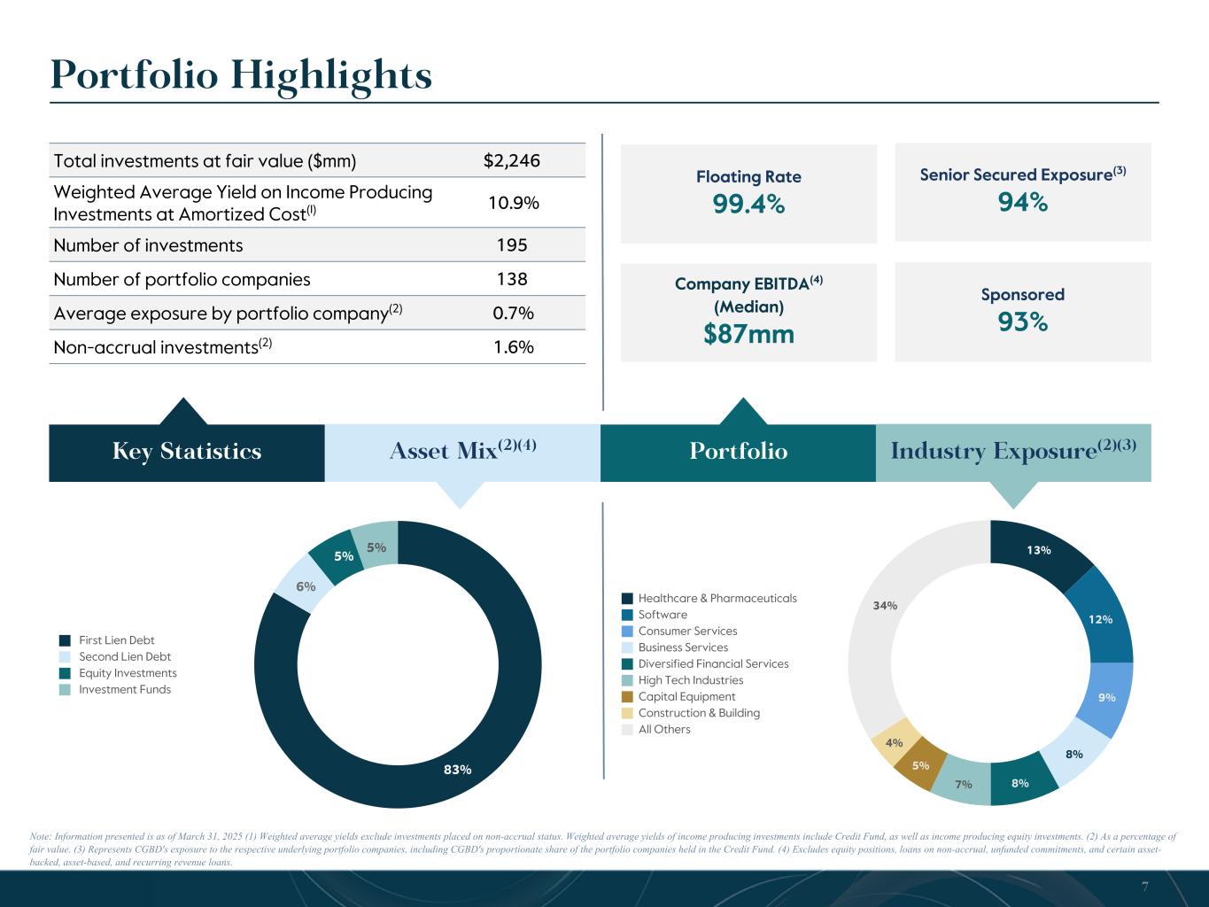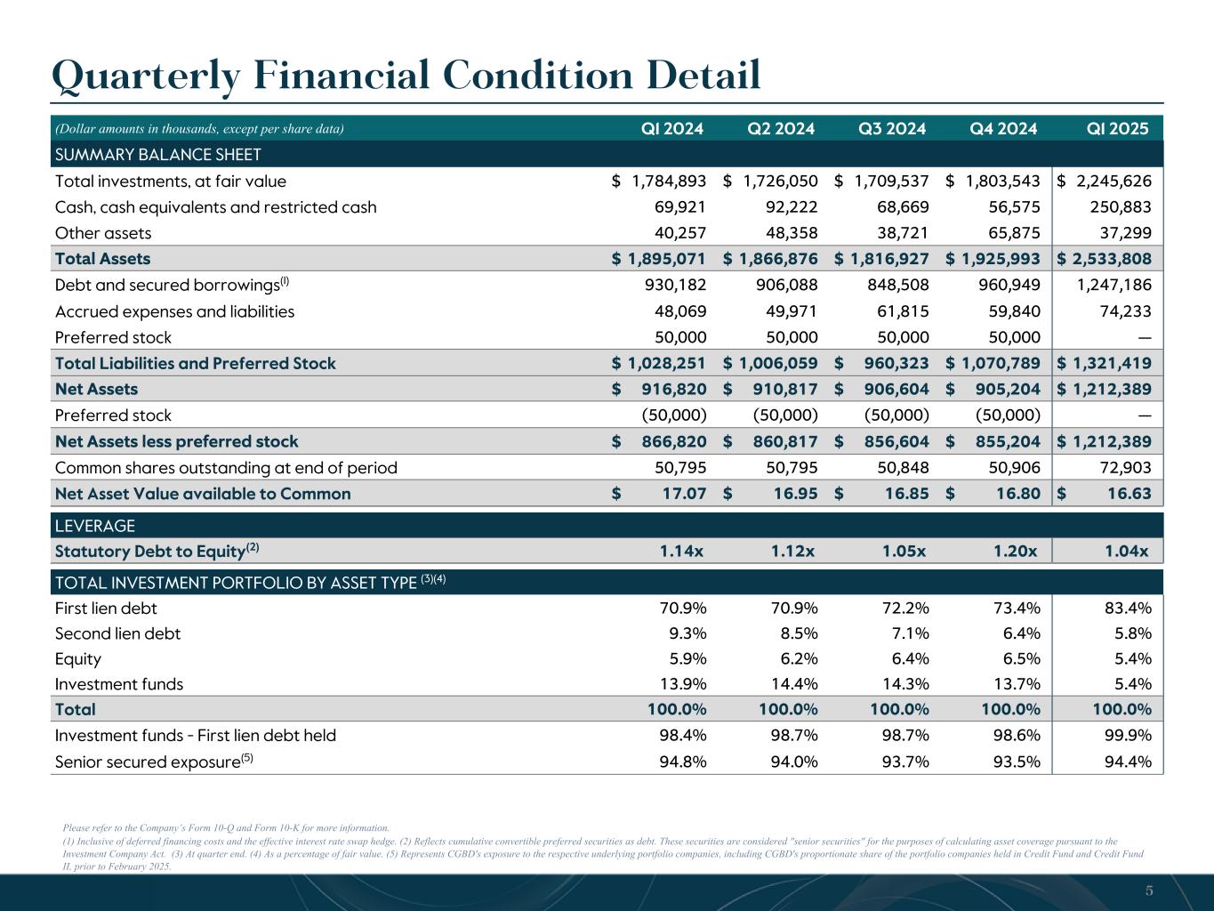 Please refer to the Company’s Form 10-Q and Form 10-K for more information. (1) Inclusive of deferred financing costs and the effective interest rate swap hedge. (2) Reflects cumulative convertible preferred securities as debt. These securities are considered "senior securities" for the purposes of calculating asset coverage pursuant to the Investment Company Act. (3) At quarter end. (4) As a percentage of fair value. (5) Represents CGBD's exposure to the respective underlying portfolio companies, including CGBD's proportionate share of the portfolio companies held in Credit Fund and Credit Fund II, prior to February 2025. Quarterly Financial Condition Detail (Dollar amounts in thousands, except per share data) Q1 2024 Q2 2024 Q3 2024 Q4 2024 Q1 2025 SUMMARY BALANCE SHEET Total investments, at fair value $ 1,784,893 $ 1,726,050 $ 1,709,537 $ 1,803,543 $ 2,245,626 Cash, cash equivalents and restricted cash 69,921 92,222 68,669 56,575 250,883 Other assets 40,257 48,358 38,721 65,875 37,299 Total Assets $ 1,895,071 $ 1,866,876 $ 1,816,927 $ 1,925,993 $ 2,533,808 Debt and secured borrowings(1) 930,182 906,088 848,508 960,949 1,247,186 Accrued expenses and liabilities 48,069 49,971 61,815 59,840 74,233 Preferred stock 50,000 50,000 50,000 50,000 — Total Liabilities and Preferred Stock $ 1,028,251 $ 1,006,059 $ 960,323 $ 1,070,789 $ 1,321,419 Net Assets $ 916,820 $ 910,817 $ 906,604 $ 905,204 $ 1,212,389 Preferred stock (50,000) (50,000) (50,000) (50,000) — Net Assets less preferred stock $ 866,820 $ 860,817 $ 856,604 $ 855,204 $ 1,212,389 Common shares outstanding at end of period 50,795 50,795 50,848 50,906 72,903 Net Asset Value available to Common $ 17.07 $ 16.95 $ 16.85 $ 16.80 $ 16.63 LEVERAGE Statutory Debt to Equity(2) 1.14x 1.12x 1.05x 1.20x 1.04x TOTAL INVESTMENT PORTFOLIO BY ASSET TYPE (3)(4) First lien debt 70.9 % 70.9 % 72.2 % 73.4 % 83.4 % Second lien debt 9.3 % 8.5 % 7.1 % 6.4 % 5.8 % Equity 5.9 % 6.2 % 6.4 % 6.5 % 5.4 % Investment funds 13.9 % 14.4 % 14.3 % 13.7 % 5.4 % Total 100.0 % 100.0 % 100.0 % 100.0 % 100.0 % Investment funds - First lien debt held 98.4 % 98.7 % 98.7 % 98.6 % 99.9 % Senior secured exposure(5) 94.8 % 94.0 % 93.7 % 93.5 % 94.4 % 5