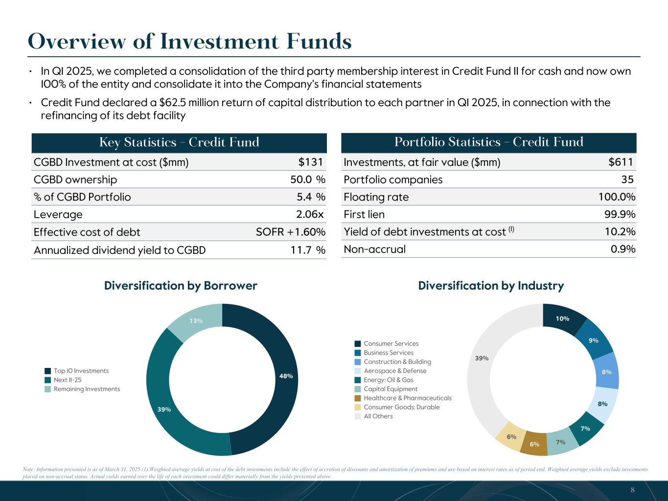 Senior Secured Exposure(3) 94% 83% 6% 5% 5% First Lien Debt Second Lien Debt Equity Investments Investment Funds 13% 12% 9% 8% 8%7% 5% 4% 34%Healthcare & Pharmaceuticals Software Consumer Services Business Services Diversified Financial Services High Tech Industries Capital Equipment Construction & Building All Others Portfolio Highlights Note: Information presented is as of March 31, 2025 (1) Weighted average yields exclude investments placed on non-accrual status. Weighted average yields of income producing investments include Credit Fund, as well as income producing equity investments. (2) As a percentage of fair value. (3) Represents CGBD's exposure to the respective underlying portfolio companies, including CGBD's proportionate share of the portfolio companies held in the Credit Fund. (4) Excludes equity positions, loans on non-accrual, unfunded commitments, and certain asset- backed, asset-based, and recurring revenue loans. Total investments at fair value ($mm) $2,246 Weighted Average Yield on Income Producing Investments at Amortized Cost(1) 10.9% Number of investments 195 Number of portfolio companies 138 Average exposure by portfolio company(2) 0.7% Non-accrual investments(2) 1.6% 7 Key Statistics Asset Mix(2)(4) Portfolio Industry Exposure(2)(3) Floating Rate 99.4% Company EBITDA(4) (Median) $87mm Sponsored 93%