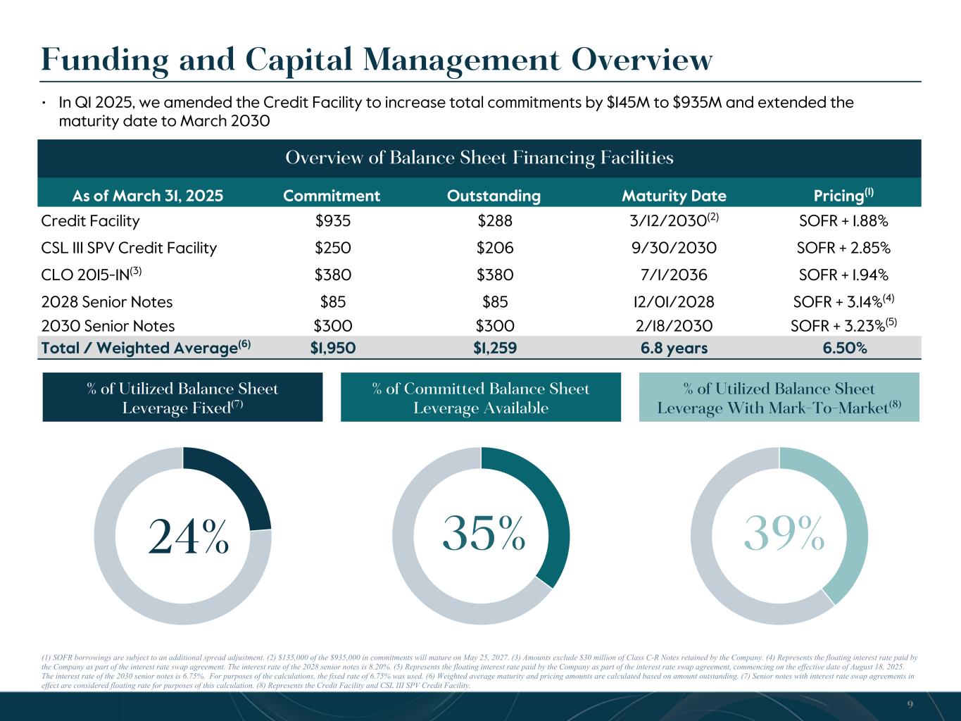 • In Q1 2025, we amended the Credit Facility to increase total commitments by $145M to $935M and extended the maturity date to March 2030 Funding and Capital Management Overview Overview of Balance Sheet Financing Facilities 9 As of March 31, 2025 Commitment Outstanding Maturity Date Pricing(1) Credit Facility $935 $288 3/12/2030(2) SOFR + 1.88% CSL III SPV Credit Facility $250 $206 9/30/2030 SOFR + 2.85% CLO 2015-1N(3) $380 $380 7/1/2036 SOFR + 1.94% 2028 Senior Notes $85 $85 12/01/2028 SOFR + 3.14%(4) 2030 Senior Notes $300 $300 2/18/2030 SOFR + 3.23%(5) Total / Weighted Average(6) $1,950 $1,259 6.8 years 6.50% 35% % of Committed Balance Sheet Leverage Available % of Utilized Balance Sheet Leverage With Mark-To-Market(8) % of Utilized Balance Sheet Leverage Fixed(7) 24% (1) SOFR borrowings are subject to an additional spread adjustment. (2) $135,000 of the $935,000 in commitments will mature on May 25, 2027. (3) Amounts exclude $30 million of Class C-R Notes retained by the Company. (4) Represents the floating interest rate paid by the Company as part of the interest rate swap agreement. The interest rate of the 2028 senior notes is 8.20%. (5) Represents the floating interest rate paid by the Company as part of the interest rate swap agreement, commencing on the effective date of August 18, 2025. The interest rate of the 2030 senior notes is 6.75%. For purposes of the calculations, the fixed rate of 6.75% was used. (6) Weighted average maturity and pricing amounts are calculated based on amount outstanding. (7) Senior notes with interest rate swap agreements in effect are considered floating rate for purposes of this calculation. (8) Represents the Credit Facility and CSL III SPV Credit Facility. 39%