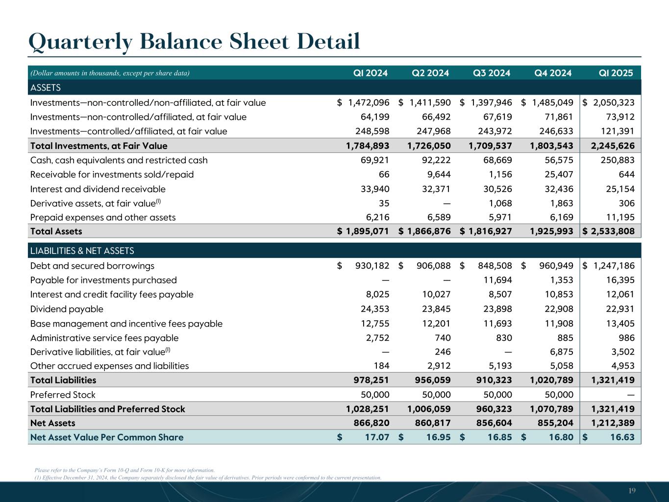 Quarterly Balance Sheet Detail (Dollar amounts in thousands, except per share data) Q1 2024 Q2 2024 Q3 2024 Q4 2024 Q1 2025 ASSETS Investments—non-controlled/non-affiliated, at fair value $ 1,472,096 $ 1,411,590 $ 1,397,946 $ 1,485,049 $ 2,050,323 Investments—non-controlled/affiliated, at fair value 64,199 66,492 67,619 71,861 73,912 Investments—controlled/affiliated, at fair value 248,598 247,968 243,972 246,633 121,391 Total Investments, at Fair Value 1,784,893 1,726,050 1,709,537 1,803,543 2,245,626 Cash, cash equivalents and restricted cash 69,921 92,222 68,669 56,575 250,883 Receivable for investments sold/repaid 66 9,644 1,156 25,407 644 Interest and dividend receivable 33,940 32,371 30,526 32,436 25,154 Derivative assets, at fair value(1) 35 — 1,068 1,863 306 Prepaid expenses and other assets 6,216 6,589 5,971 6,169 11,195 Total Assets $ 1,895,071 $ 1,866,876 $ 1,816,927 1,925,993 $ 2,533,808 LIABILITIES & NET ASSETS Debt and secured borrowings $ 930,182 $ 906,088 $ 848,508 $ 960,949 $ 1,247,186 Payable for investments purchased — — 11,694 1,353 16,395 Interest and credit facility fees payable 8,025 10,027 8,507 10,853 12,061 Dividend payable 24,353 23,845 23,898 22,908 22,931 Base management and incentive fees payable 12,755 12,201 11,693 11,908 13,405 Administrative service fees payable 2,752 740 830 885 986 Derivative liabilities, at fair value(1) — 246 — 6,875 3,502 Other accrued expenses and liabilities 184 2,912 5,193 5,058 4,953 Total Liabilities 978,251 956,059 910,323 1,020,789 1,321,419 Preferred Stock 50,000 50,000 50,000 50,000 — Total Liabilities and Preferred Stock 1,028,251 1,006,059 960,323 1,070,789 1,321,419 Net Assets 866,820 860,817 856,604 855,204 1,212,389 Net Asset Value Per Common Share $ 17.07 $ 16.95 $ 16.85 $ 16.80 $ 16.63 19 Please refer to the Company’s Form 10-Q and Form 10-K for more information. (1) Effective December 31, 2024, the Company separately disclosed the fair value of derivatives. Prior periods were conformed to the current presentation.
