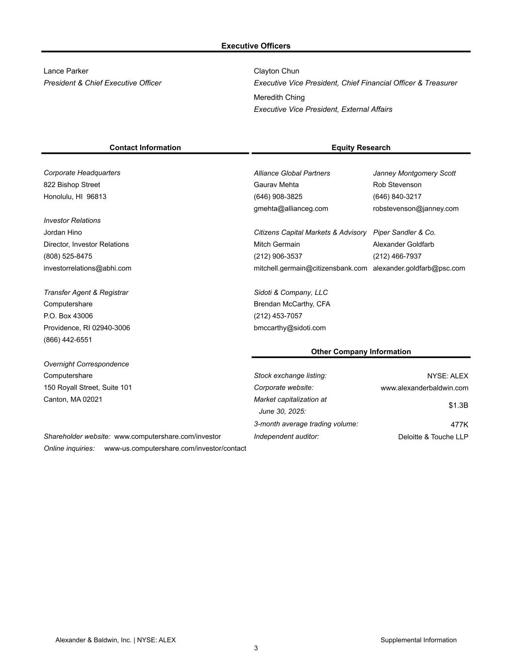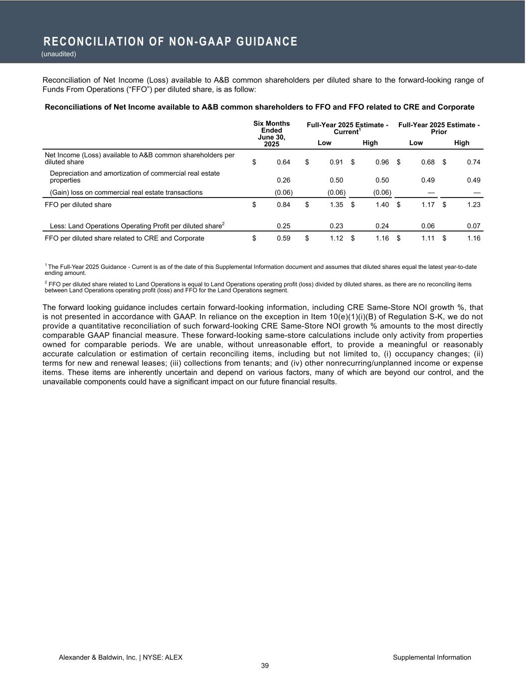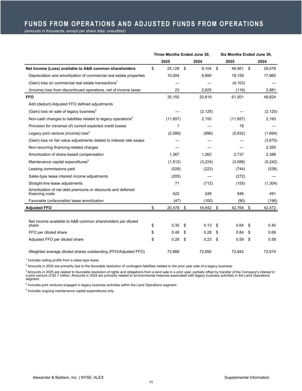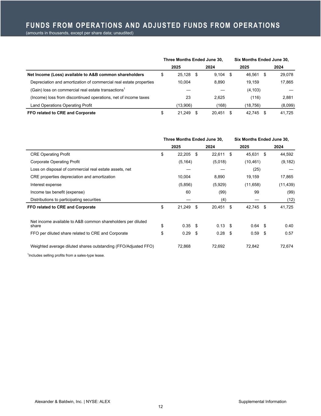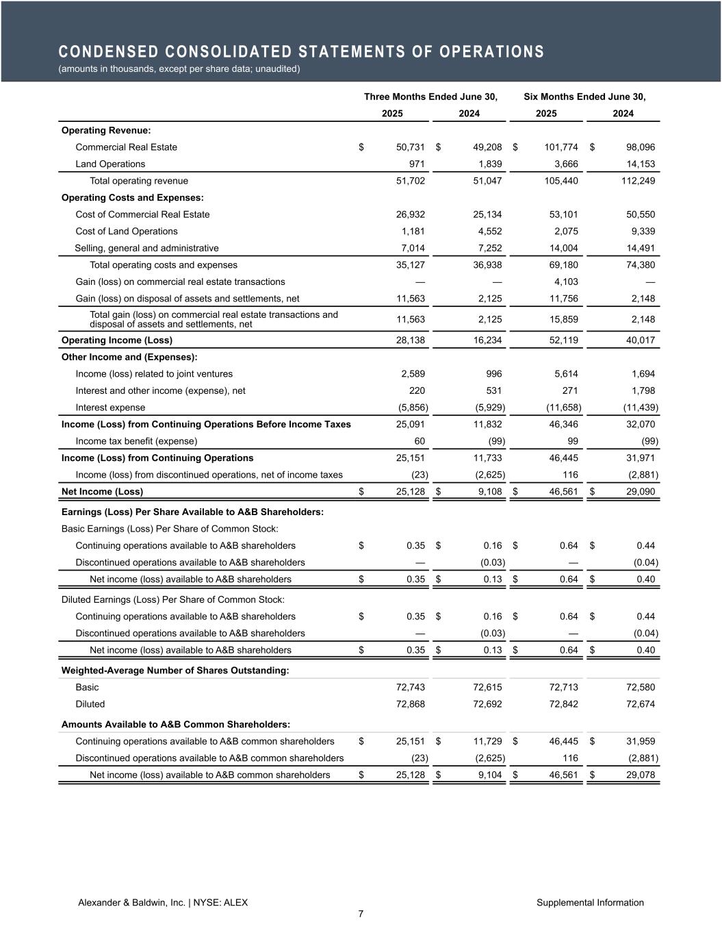 ホノルル(2025年7月24日)/PRNewswire=共同通信JBN】ハワイを拠点に高品質の商業用不動産を所有、運営、開発するアレキサンダー・アンド・ボールドウィン・インク(NYSE: ALEX)(以下「A&B」または「当社」)は本日、A&Bの普通株主が入手可能な2025年第2四半期の純利益が2,510万ドル(希薄化後1株当たり0.35ドル)、商業用不動産(以下「CRE」)の営業利益が2,220万ドルになったと発表した。