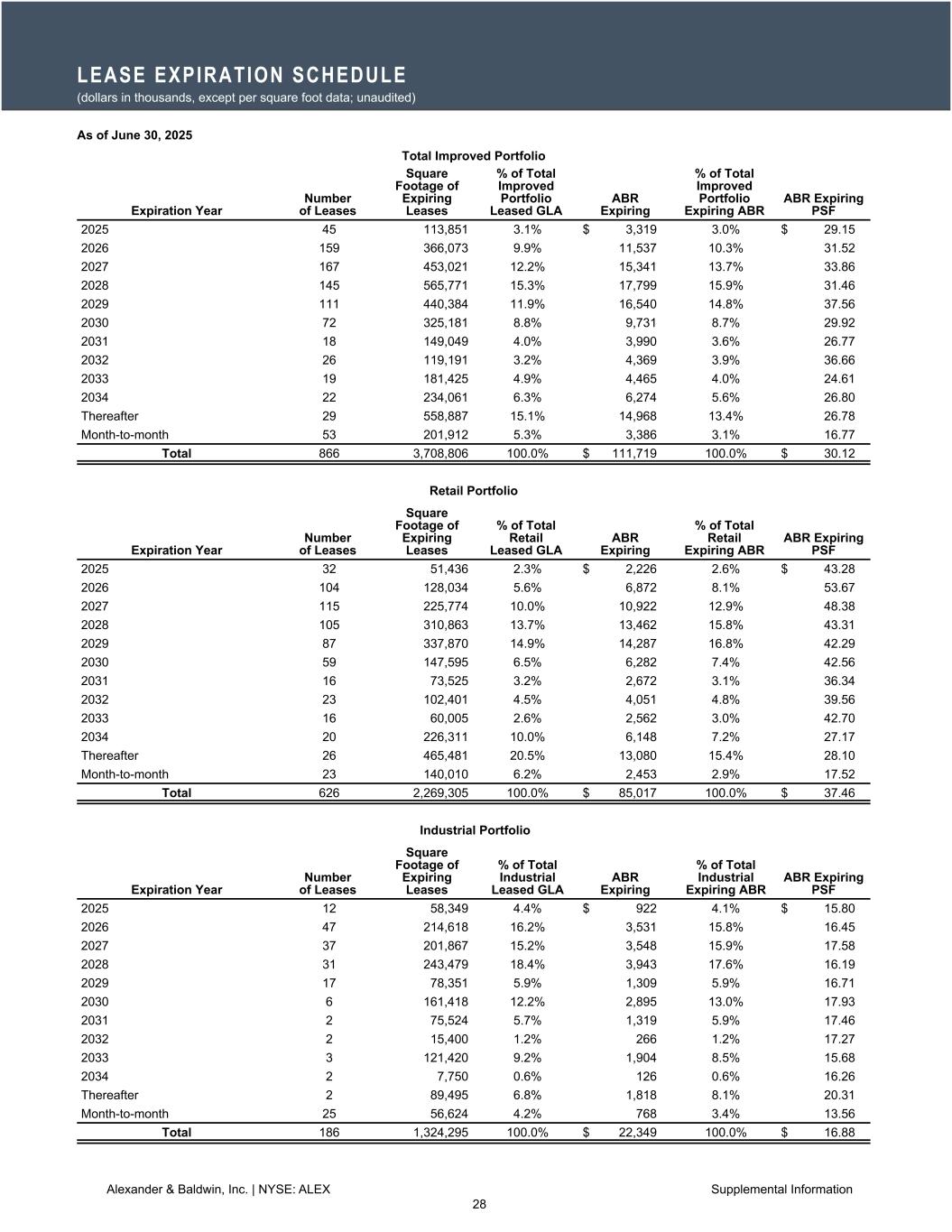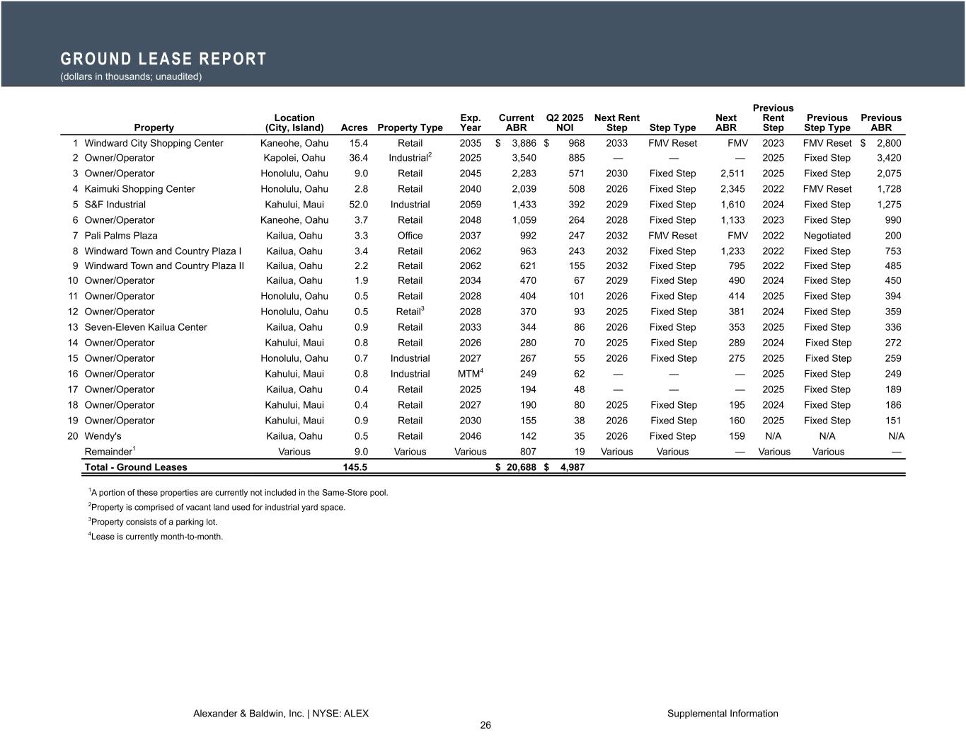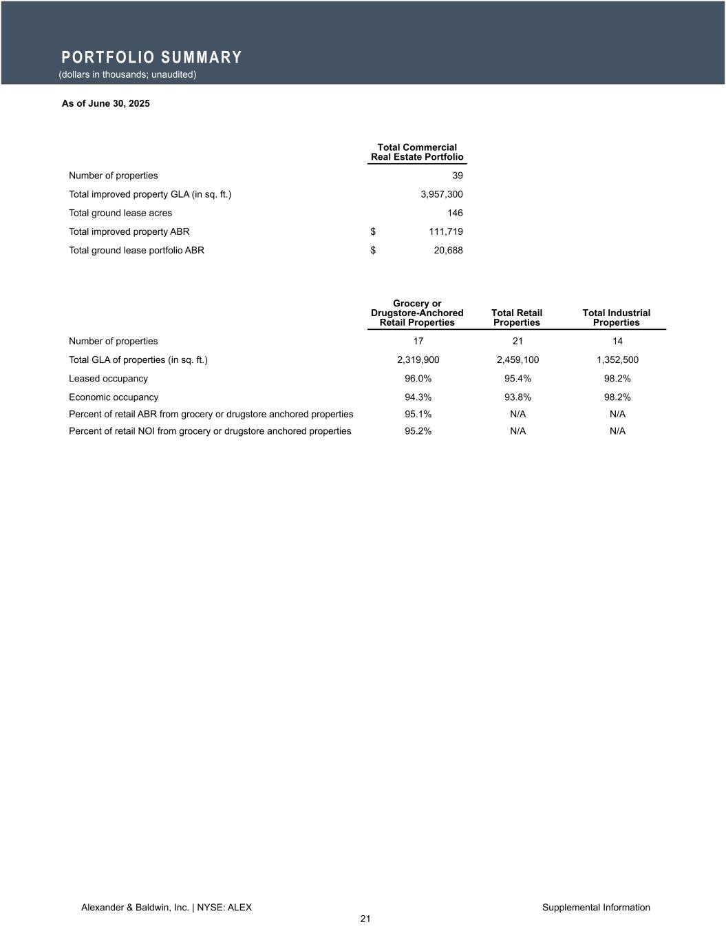 -2025年第2四半期中、総賃貸可能面積約183,800平方フィート、年換算基本賃料610万米ドルの改良型不動産リース52件と、グラウンドリース2件を実施した。